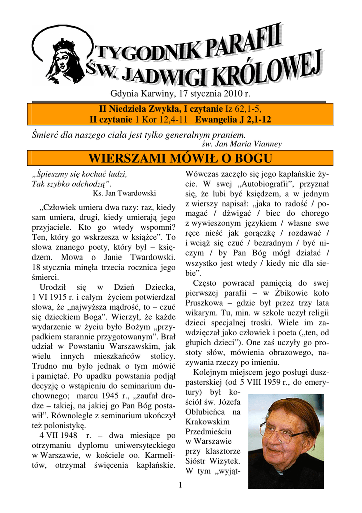 Gdynia Karwiny, 17 stycznia 2010 r. II Niedziela Zwykła, I czytanie Iz 62,1-5, II czytanie 1 Kor 12,4-11 Ewangelia J 2,1-12 Śmierć dla naszego ciała jest tylko generalnym praniem. św. Jan Maria Vianney WIERSZAMI MÓWIŁ O BOGU Wówczas zaczęło się jego kapłańskie życie. W swej „Autobiografii”, przyznał się, że lubi być księdzem, a w jednym z wierszy napisał: „jaka to radość / pomagać / dźwigać / biec do chorego z wywieszonym językiem / własne swe ręce nieść jak gorączkę / rozdawać / i wciąż się czuć / bezradnym / być niczym / by Pan Bóg mógł działać / wszystko jest wtedy / kiedy nic dla siebie”. Często powracał pamięcią do swej pierwszej parafii – w Żbikowie koło Pruszkowa – gdzie był przez trzy lata wikarym. Tu, min. w szkole uczył religii dzieci specjalnej troski. Wiele im zawdzięczał jako człowiek i poeta („ten, od głupich dzieci”). One zaś uczyły go prostoty słów, mówienia obrazowego, nazywania rzeczy po imieniu. Kolejnym miejscem jego posługi duszpasterskiej (od 5 VIII 1959 r., do emerytury) był kościół św. Józefa Oblubieńca na Krakowskim Przedmieściu w Warszawie przy klasztorze Sióstr Wizytek. W tym „wyjąt- „Śpieszmy się kochać ludzi, Tak szybko odchodzą”. Ks. Jan Twardowski „Człowiek umiera dwa razy: raz, kiedy sam umiera, drugi, kiedy umierają jego przyjaciele. Kto go wtedy wspomni? Ten, który go wskrzesza w książce”. To słowa znanego poety, który był – księdzem. Mowa o Janie Twardowski. 18 stycznia minęła trzecia rocznica jego śmierci. Urodził się w Dzień Dziecka, 1 VI 1915 r. i całym życiem potwierdzał słowa, że „najwyższa mądrość, to – czuć się dzieckiem Boga”. Wierzył, że każde wydarzenie w życiu było Bożym „przypadkiem starannie przygotowanym”. Brał udział w Powstaniu Warszawskim, jak wielu innych mieszkańców stolicy. Trudno mu było jednak o tym mówić i pamiętać. Po upadku powstania podjął decyzję o wstąpieniu do seminarium duchownego; marcu 1945 r., „zaufał drodze – takiej, na jakiej go Pan Bóg postawił”. Równolegle z seminarium ukończył też polonistykę. 4 VII 1948 r. – dwa miesiące po otrzymaniu dyplomu uniwersyteckiego w Warszawie, w kościele oo. Karmelitów, otrzymał święcenia kapłańskie. 1 kowym kościele, pielęgnującym wyciszenie, modlitwę, kontemplację” głosił kazania dla dzieci i – dorosłych. Twierdził, że „tak naprawdę każdy dorosły jest dzieckiem, które za szybko urosło”. Swoje pisarstwo traktował jako wielką łaskę i „głoszenie Ewangelii w nieco inny sposób – poprzez własne przeżycia, wzruszenia, uczucia, a nie powtarzanie stereotypów”. Gdy recenzenci jego utworów pisali „o dialektyce, antynomiach (…) koegzystujących realiach”, odpowiadał, że otwierając tom swoich wierszy, natrafił na takie teksty: „polna myszka siedzi sobie, konfesjonał ząbkiem skrobie”, „kto bibułę buchnie, temu łapa spuchnie”. Dziękuję Ci, księże Janie, za to, że dzieliłeś się swymi wierszami tak jak opłatkiem, niosąc „miłość, nadzieję i spokój wiary. Krystyna PARAFIALNY OBSERWATOR DUCHOWY SKARBONA ŚWIĘTEGO ANTONIEGO CZ. III Antonina właśnie zamykała drzwi, gdy podszedł do niej pan Karol. – I jak sąsiadko, ma pani to przy sobie? – stanął wyczekująco, gdy kobieta chowała klucze do torebki. – Ja mogę to nieść przez drogę, dla bezpieczeństwa… - wyciągnął rękę. Antonina uśmiechnęła się lekko. – To już nieaktualne – stwierdziła. Córka zabrała pieniądze i wpłaciła do banku. - Wielka szkoda – pan Karol był wyraźnie zawiedziony. – Ja panią ostrzegałem, bank to największy złodziej. Gdyby pani chciała… Nie dokończył, gdyż sąsiadka przerwała mu. - Przepraszam, ale bardzo się spieszę. Idę na mszę. – Zaczęła schodzić po schodach. - Ja w zasadzie też – mruknął mężczyzna, nie wiadomo czy do siebie, czy też do sąsiadki. W czasie kazania, ksiądz proboszcz bardzo lubił przytaczać przykłady z życia. Tym razem opowiedział o pewnej żebraczce, całe życie wspomaganej przez życzliwych sąsiadów. Gdy po wielu latach umarła, w jej skromnym mieszkaniu znaleziono poduszkę wypchaną pieniędzmi. Zadziwieni sąsiedzi, bo krewnych zmarła nie miała, chcieli pieniądze podzielić między siebie, a część przeznaczyć na pochówek. Niestety pieniądze pochodziły sprzed denominacji i obecnie ich wartość można było wyliczyć w groszach. - Pan Jezus uczy, że i w gospodarowaniu mamoną trzeba być roztropnym i zawsze pamiętać, gdzie gromadzić swoje skarby.Tu proboszcz spojrzał znacząco na panią Antoninę. – Na pewno nie w poduszkach czy skarpetach. I banki nie są najlepszym rozwiązaniem. Myślicie pewnie, że się wymądrzam. Niech więc za mnie odpowie Pan Jezus. – kapłan otworzył Ewangelię: „Gromadźcie sobie skarby w niebie, gdzie ani mól, ani rdza nie niszczą i gdzie złodzieje nie włamują się, i nie kradną. Bo gdzie jest twój skarb, tam będzie i serce twoje.” -Proboszcz wskazał palcem w górę. - Tam jest ten najlepszy bank. Kościół, po wygaszeniu świateł, pogrążył się w mroku. Proboszcz, przez chwilę klęczał przed Tabernakulum, a potem ruszył w stronę wyjścia. Nagle do jego uszu doszedł jakiś szmer. - Antonina! – pomyślał ze złością. – Czy ta kobieta nic nie zrozumiała? Podszedł szybkim krokiem w stronę figury świętego Antoniego. Głośno zakaszlał. Jakaś ciemna postać podniosła się nagle. 2 - Co pan tu robi? – zaskoczeniu słyszalnemu w głosie proboszcza towarzyszyło zaskoczenie malujące się na twarzy pana Karola. - Nie, nic… - parafianin stał ale jego oczy nadal biegały dookoła. – Coś zgubiłem… Czy ksiądz nie znalazł przypadkiem takiej paczuszki – mężczyzna zrobił nieokreślony ruch rękami. – Szary papier, nic wielkiego… . - Niech pan siada – proboszcz wskazał ławkę naprzeciw