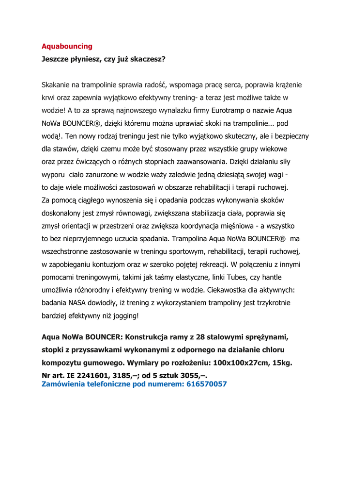 Aquabouncing Jeszcze płyniesz, czy już skaczesz? Skakanie na trampolinie sprawia radość, wspomaga pracę serca, poprawia krążenie krwi oraz zapewnia wyjątkowo efektywny trening- a teraz jest możliwe także w wodzie! A to za sprawą najnowszego wynalazku firmy Eurotramp o nazwie Aqua NoWa BOUNCER®, dzięki któremu można uprawiać skoki na trampolinie... pod wodą!. Ten nowy rodzaj treningu jest nie tylko wyjątkowo skuteczny, ale i bezpieczny dla stawów, dzięki czemu może być stosowany przez wszystkie grupy wiekowe oraz przez ćwiczących o różnych stopniach zaawansowania. Dzięki działaniu siły wyporu ciało zanurzone w wodzie waży zaledwie jedną dziesiątą swojej wagi to daje wiele możliwości zastosowań w obszarze rehabilitacji i terapii ruchowej. Za pomocą ciągłego wynoszenia się i opadania podczas wykonywania skoków doskonalony jest zmysł równowagi, zwiększana stabilizacja ciała, poprawia się zmysł orientacji w przestrzeni oraz zwiększa koordynacja mięśniowa - a wszystko to bez nieprzyjemnego uczucia spadania. Trampolina Aqua NoWa BOUNCER® ma wszechstronne zastosowanie w treningu sportowym, rehabilitacji, terapii ruchowej, w zapobieganiu kontuzjom oraz w szeroko pojętej rekreacji. W połączeniu z innymi pomocami treningowymi, takimi jak taśmy elastyczne, linki Tubes, czy hantle umożliwia różnorodny i efektywny trening w wodzie. Ciekawostka dla aktywnych: badania NASA dowiodły, iż trening z wykorzystaniem trampoliny jest trzykrotnie bardziej efektywny niż jogging! Aqua NoWa BOUNCER: Konstrukcja ramy z 28 stalowymi sprężynami, stopki z przyssawkami wykonanymi z odpornego na działanie chloru kompozytu gumowego. Wymiary po rozłożeniu: 100x100x27cm, 15kg. Nr art. IE 2241601, 3185,–; od 5 sztuk 3055,–. Zamówienia telefoniczne pod numerem: 616570057