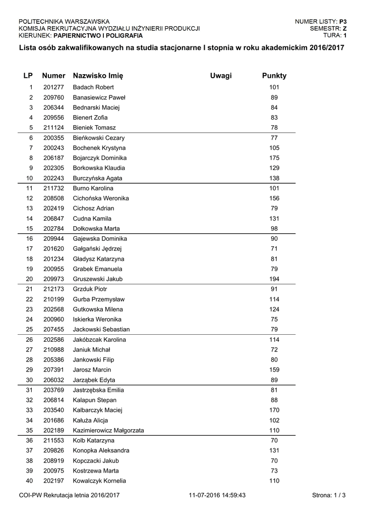 Lista osób zakwalifikowanych na studia stacjonarne I stopnia w roku akademickim 2016/2017 LP Numer Nazwisko Imię 1 201277 Badach Robert 101 2 209760 Banasiewicz Paweł 89 3 206344 Bednarski Maciej 84 4 209556 Bienert Zofia 83 5 211124 Bieniek Tomasz 78 6 200355 Bieńkowski Cezary 77 7 200243 Bochenek Krystyna 105 8 206187 Bojarczyk Dominika 175 9 202305 Borkowska Klaudia 129 10 202243 Burczyńska Agata 138 11 211732 Burno Karolina 101 12 208508 Cichońska Weronika 156 13 202419 Cichosz Adrian 79 14 206847 Cudna Kamila 131 15 202784 Dołkowska Marta 98 16 209944 Gajewska Dominika 90 17 201620 Gałgański Jędrzej 71 18 201234 Gładysz Katarzyna 81 19 200955 Grabek Emanuela 79 20 209973 Gruszewski Jakub 194 21 212173 Grzduk Piotr 91 22 210199 Gurba Przemysław 114 23 202568 Gutkowska Milena 124 24 200960 Iskierka Weronika 75 25 207455 Jackowski Sebastian 79 26 202586 Jakóbzcak Karolina 114 27 210988 Janiuk Michał 72 28 205386 Jankowski Filip 80 29 207391 Jarosz Marcin 159 30 206032 Jarząbek Edyta 89 31 203769 Jastrzębska Emilia 81 32 206814 Kalapun Stepan 88 33 203540 Kalbarczyk Maciej 170 34 201686 Kałuża Alicja 102 35 202189 Kazimierowicz Małgorzata 110 36 211553 Kolb Katarzyna 70 37 209826 Konopka Aleksandra 131 38 208919 Kopczacki Jakub 70 39 200975 Kostrzewa Marta 73 40 202197 Kowalczyk Kornelia 110 COI-PW Rekrutacja letnia 2016/2017 Uwagi 11-07-2016 14:59:43 Punkty Strona: 1 / 3 Lista osób zakwalifikowanych na studia stacjonarne I stopnia w roku akademickim 2016/2017 LP Numer Nazwisko Imię 41 210350 Kruszyniewicz Gabriela 151 42 211082 Kurek Adrian 85 43 206209 Labes Kacper 92 44 200968 Leśna Aleksandra 91 45 201448 Lis Natalia 86 46 203103 Makoś Anna 142 47 205959 Matuszewski Krystian 81 48 201013 Miotk Julia 97 49 203750 Monikowska Marta 125 50 209518 Murawski Tomasz 114 51 200342 Narolewska Joanna 72 52 206221 Olkowski Piotr 100 53 201828 Ościłowska Maja 87 54 204107 Partyka Anna 92 55 203622 Pięta Urszula 120 56 205022 Pluskota Renata 75 57 206762 Pniewska Zuzanna 139 58 210789 Prus Dawid 90 59 210586 Rosik Weronika 157 60 204350 Rusak Gabriela 115 61 209969 Rusak Karolina 113 62 207298 Siemionek Krzysztof 123 63 208335 Skoczek Grzegorz 136 64 205159 Szlendak Klaudia 78 65 205745 Szymanek Kacper 96 66 212239 Szymańska Natalia 118 67 210104 Świerżewska Maria 129 68 210583 Święcicki Krystian 93 69 211897 Świostek Michał 79 70 208511 Trochimowicz Sandra 75 71 207695 Tumiński Oskar 98 72 210287 Ugorowski Jacek 73 73 212312 Wadas Adrian 71 74 209288 Waluś Zuzanna 79 75 206332 Winczura Borys 71 76 207912 Wódka Aleksandra 102 77 205983 Wróbel Sabina 80 78 210957 Wysocki Kacper 136 79 209668 Zaborski Jan 85 80 205583 Zając Katarzyna 101 COI-PW Rekrutacja letnia 2016/2017 Uwagi 11-07-2016 14:59:43 Punkty Strona: 2 / 3 Lista osób zakwalifikowanych na studia stacjonarne I stopnia w roku akademickim 2016/2017 LP Numer Nazwisko Imię 81 209455 Zedel Alicja 73 82 206030 Ziemiańczyk Katarzyna 79 83 203030 Zięcina Krzysztof 82 COI-PW Rekrutacja letnia 2016/2017 Uwagi 11-07-2016 14:59:43 Punkty Strona: 3 / 3