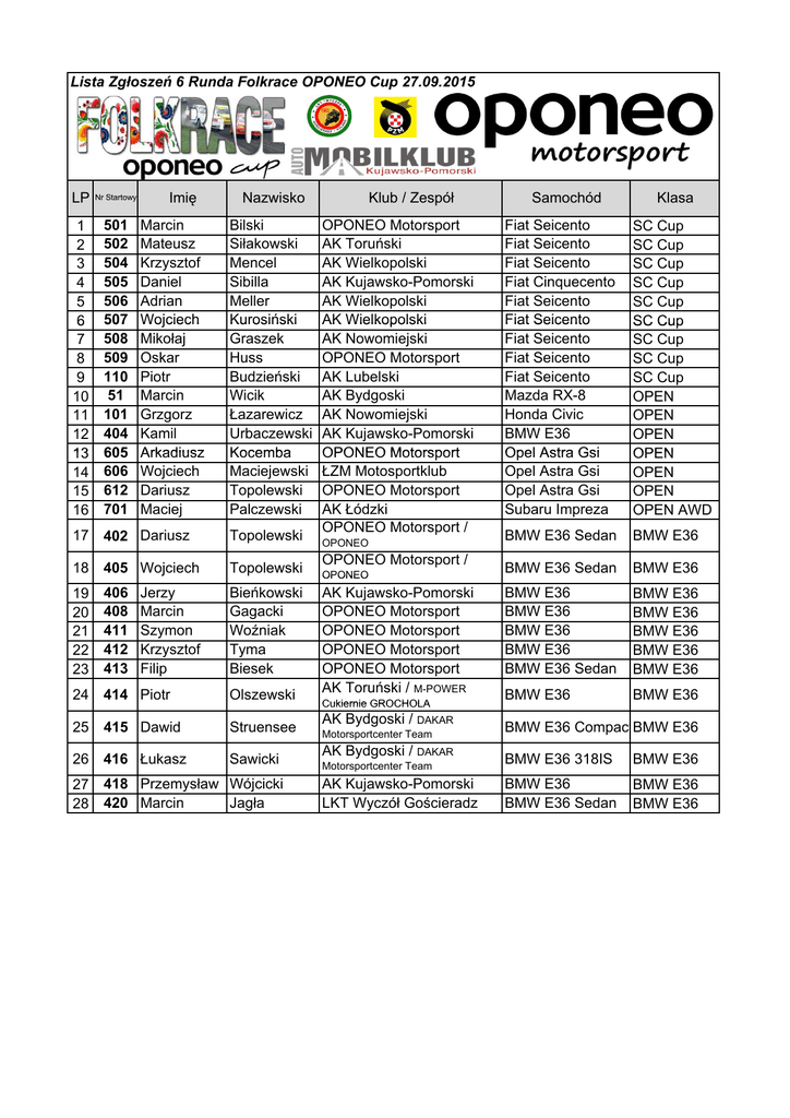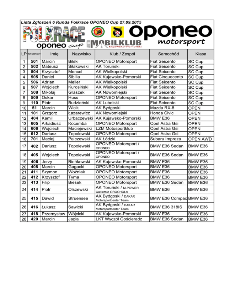 Lista Zgłoszeń 6 Runda Folkrace OPONEO Cup 27.09.2015 LP Nr Startowy Imię 1 2 3 4 5 6 7 8 9 10 11 12 13 14 15 16 501 502 504 505 506 507 508 509 110 51 101 404 605 606 612 701 17 402 Dariusz Topolewski 18 405 Wojciech Topolewski 19 20 21 22 23 406 408 411 412 413 Bieńkowski Gagacki Woźniak Tyma Biesek 24 414 Piotr Olszewski 25 415 Dawid Struensee 26 416 Łukasz Sawicki 27 28 418 Przemysław Wójcicki 420 Marcin Jagła Marcin Mateusz Krzysztof Daniel Adrian Wojciech Mikołaj Oskar Piotr Marcin Grzgorz Kamil Arkadiusz Wojciech Dariusz Maciej Jerzy Marcin Szymon Krzysztof Filip Nazwisko Bilski Siłakowski Mencel Sibilla Meller Kurosiński Graszek Huss Budzieński Wicik Łazarewicz Urbaczewski Kocemba Maciejewski Topolewski Palczewski Klub / Zespół OPONEO Motorsport AK Toruński AK Wielkopolski AK Kujawsko-Pomorski AK Wielkopolski AK Wielkopolski AK Nowomiejski OPONEO Motorsport AK Lubelski AK Bydgoski AK Nowomiejski AK Kujawsko-Pomorski OPONEO Motorsport ŁZM Motosportklub OPONEO Motorsport AK Łódzki OPONEO Motorsport / OPONEO OPONEO Motorsport / OPONEO AK Kujawsko-Pomorski OPONEO Motorsport OPONEO Motorsport OPONEO Motorsport OPONEO Motorsport AK Toruński / M-POWER Cukiernie GROCHOLA AK Bydgoski / DAKAR Motorsportcenter Team AK Bydgoski / DAKAR Samochód Klasa Fiat Seicento Fiat Seicento Fiat Seicento Fiat Cinquecento Fiat Seicento Fiat Seicento Fiat Seicento Fiat Seicento Fiat Seicento Mazda RX-8 Honda Civic BMW E36 Opel Astra Gsi Opel Astra Gsi Opel Astra Gsi Subaru Impreza SC Cup SC Cup SC Cup SC Cup SC Cup SC Cup SC Cup SC Cup SC Cup OPEN OPEN OPEN OPEN OPEN OPEN OPEN AWD BMW E36 Sedan BMW E36 BMW E36 Sedan BMW E36 BMW E36 BMW E36 BMW E36 BMW E36 BMW E36 Sedan BMW E36 BMW E36 BMW E36 BMW E36 BMW E36 BMW E36 BMW E36 BMW E36 CompactBMW E36 Motorsportcenter Team BMW E36 318IS BMW E36 AK Kujawsko-Pomorski LKT Wyczół Gościeradz BMW E36 BMW E36 Sedan BMW E36 BMW E36