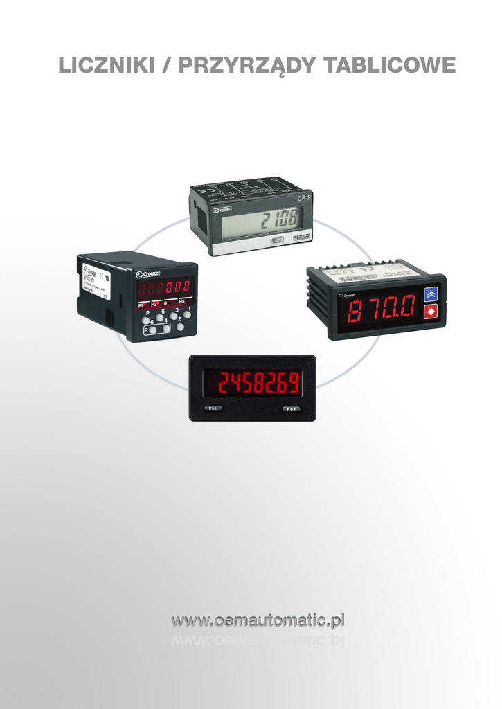 Liczniki / Przyrządy panelowe LICZNIKI / PRZYRZĄDY TABLICOWE www.oemautomatic.pl www.oemautomatic.pl Liczniki /Przyrządy panelowe SPIS TREŚCI Liczniki programowalne CPT4 str. 338 Liczniki sumujące str. 342 Liczniki czasu pracy str. 345 Przyrządy tablicowe CUB5 str. 346 Przyrządy tablicowe Pax Lite str. 347 Przyrządy tablicowe Pax str. 348 Wyświetlacz LED 36 x 72 mm str. 349 Wyświetlacz LED 24x48 mm str. 350 Wyświetlacz LED z interfejsem Bus str. 351 Wyświetlacz LED z interfejsem ASi str. 352 Wyświetlacz LED z interfejsem szeregowym str. 253 www.oemautomatic.pl www.oemautomatic.pl Liczniki Licznik programowalny CPT4 • • • • Funkcje licznika, obrotomierza, podwójnego licznika, licznika serii Łatwe w programowaniu Wyświetlacz LED-6 cyfr Wyjścia: styki przełączne i półprzewodnikowe Funkcja Uniwersalny licznik programowalny z 1 lub 2 wartościami zadanymi. Poza funkcjami liczenia w górę, w dół, sumowaniem, obrotomierzem/ częstościomierzem, licznikiem serii może on również pracować jako dwa niezależne liczniki. Wersje z zasilaniem AC posiadają dodatkowe wyjście do zasilania czujników. Dzięki zastosowaniu pamięci EEPROM, program jak i wartości bieżące przechowywane są w pamięci minimum 10 lat. Dane techniczne Zasilanie 12 ...24 VDC; 24 VAC; 115 VAC; 230 VAC Tolerancja ± 10%, Wyświetlacz LCD lub LED Cyfry 6 cyfr LCD < 9 mm LED < 7,6 mm Mnożnik skali 0.001 - 999999 Punkt dziesiętny xxxxxx; xxxxx,x; xxxx,xx, xxx,xxx; Funkcje Zliczanie Wartości zadane Kasowanie Pamięć programu i wartości bieżących Licznik, częstotliwościomierz, licznik czasu, podwójny licznik, licznik serii W górę, w dół, kierunek, dodawanie, 2 niezależne lub faza 1 lub 2 Z panelu (blokowane programowo) Automatycznie lub napięciem, PNP lub NPN (wg programu) Wejścia Poziom wysoki Poziom niski Częstotliwość Min. czas impulsów Napięciowe lub półprzewodnikowe 3 wejścia, 2 wejścia liczników oraz bramka/kasowanie ≥ 8 VDC -> 40 VDC ≤ 2 VDC 5kHz dla pojedynczego zliczania 2,5kHz dla obu kanałów 17 ms ->30 Hz 250 μs -> 2,5 kHz 100 μs -> 5 kHz Wyjścia przekaźnikowe Prąd maksymalny Prąd minimalny Napięcie maks. Napięcie min. Czas reakcji Wyjście impulsowe Zestyki przełączne 5 A, 10 mA 30 VDC/250 VAC 5 VAC/DC < 5ms Pulsy 20, 50, 100, 200, 500 ms lub 1s EEPROM - podtrzymanie ponad 10 lat Wyjście SSR Prąd maksymalny 30 mA Napięcie maks. 24 VDC (dla wersji DC) 30 VDC (dla wersji AC) Wyjście zasilania czujników 12 < 30 VDC, 50 mA maks. (tylko wersje AC) Stopień ochrony Temp. pracy Waga Zgodność z 338 IP65 panel IP20 zaciski 0....+50ºC ok. 100g wer. DC, 1 wart. zadana ok. 200g pozostałe wersje UL, cUL, E96337 Zamówienia : tel. 022-8632722 • fax. 022-8632724 Liczniki Wymiary Otwór Podłączenia CPT4 - 2 wartości zadane, zasilanie AC CPT4 - 2 wartości zadane, zasilanie DC 1. Zasilanie VAC 2. Wyjście SSR 2 3. Wyjście przekaźnikowe 2 4. Zasilanie czujników 5. 0V lub masa 6. Wejścia 7. Wyjście SSR 1 8. Wyjście przekaźnikowe 1 1. Nie podłączone 2. Wyjście SSR 2 3. Wyjście przekaźnikowe 2 4. Zasilanie + VDC 5. 0V lub masa 6. Wejścia 7. Wyjście SSR 1 8. Wyjście przekaźnikowe 1 Funkcje/przebiegi Proste zliczanie ( wejścia CGr ) Kierunek zliczania ( wejścia CdG ) 1 1. Wejście A: Counter 2. Wejście B: Gate 3. Wejście C: Reset* 4. Wyświetlacz 2 1 0 -1 0 1 1 1 1. Wejście A: Counter 2. Wejście B: Counting direction 3. Wejście C: Gate 4. Wyświetlacz * Wejście RESET domyślnie skonfigurowane jako półprzewodnikowe [email protected] • www.oemautomatic.pl 2 Kierunek zliczania ( wejścia Cdr ) 3 1 2 3 4 3 2 3 4 0 1 2 1. Wejście A: Counter 2. Wejście B: Counting direction 3. Wejście C: Reset* 4. Wyświetlacz * Wejście RESET domyślnie skonfigurowane jako półprzewodnikowe 339 Liczniki Funkcje/przebiegi Indywidualne zliczanie ( wejścia Asr ) 1 2 2 2 2 1 0 0 0 1 1. Wejście A: Upcounter 2. Wejście B: Downcounter 3. Wejście C: Reset* 4. Wyświetlacz 2 Indywidualne zliczanie ( wejścia ASG ) 1 2 2 2 2 1 1 1 1 2 1. Wejście A: Upcounter 2. Wejście B: Downcounter 3. Wejście C: Gate 4. Wyświetlacz * Wejście RESET domyślnie skonfigurowane jako półprzewodnikowe 3 Sumowanie ( wejścia Aar ) 1 2 4 6 8 9 0 0 0 1 2 1. Wejście A: Counter 2. Wejście B: Counter 3. Wejście C: Reset* 4. Wyświetlacz * Wejście RESET domyślnie skonfigurowane jako półprzewodnikowe Dyskryminator fazy ( wejścia PPr ) Dyskryminator fazy ( wejścia PPg ) 1. Wejście A: Kanał A 2. Wejście B: Kanał B 3. Wejście C: Reset* 4. Wyświetlacz 1. Wej.A: Kanał A 2. Wej.B: Kanał B 3. Wej.C: Gate 4. Wyświetlacz * Wejście RESET domyślnie skonfigurowane jako półprzewodnikowe Tryb wyjścia Zliczanie w górę - rS 0 /rS A0 Zliczanie w dół - rS P2 /rS AP2 1. Counting 2. Reset 3. Wyświetlacz 1. Counting (P2=8) 2. Reset 3. Wyświetlacz Kasowanie Solid State reset - rS blo Dynamiczny reset - rS cPt 1. Counting 2. Reset 3. Wyświetlacz 1. Counting 2. Reset 3. Wyświetlacz 340 Zamówienia : tel. 022-8632722 • fax. 022-8632724 Liczniki Tryb timer tc cPu tc cPP 1. tc cPu 2. Wyświetlacz 1. tc cPP 2. Wyświetlacz tc SPU tc SPP 1 T1 2 0 ----------- T2 T1 ----------- T2 1. tc SPU 2. Wyświetlacz 1. tc SPP 2. Wyświetlacz Częstotliwościomierz Licznik serii Tryb 1. Dolny próg 2. Praca normalna 3. Górny próg 1. Licznik bieżący 2. Licznik serii 3. Reset Nr katalogowy Opis 87620211 Licznik, częstotl./timer/l. podwójny, 1 war. zadana 87620214 Licznik, częstotl./timer/l. podwójny, 1 war. zadana 87620221 Licznik, częstotl. /timer/l. podwójny, l. serii, 2 war. zadane 87620224 Licznik, częstotl. /timer/l. podwójny, l. serii, 2 war. zadane 87620300 Adapter na wymiar 72x72 mm Wersje z wyświetlaczem LCD - prosimy o kontakt. [email protected] • www.oemautomatic.pl Wyjścia 1ZP, 1SSd 1ZP, 1SSd 2ZP, 2SSd 2ZP, 2SSd Napięcie 12-24 VDC 230 VAC 12-24 VDC 230 VAC 341 Liczniki Licznik sumujący 24x48 mm • Wejścia: 40 Hz-kontakt/NPN 7 kHz-napięcie 4-30 VDC