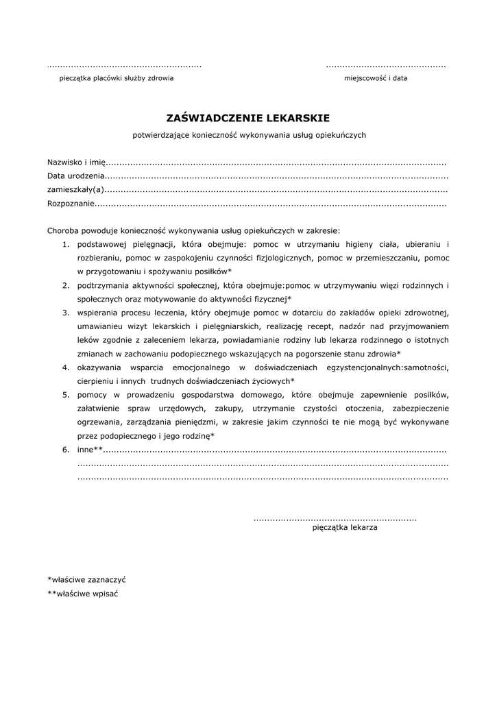 ............................................ ......................................................... pieczątka placówki służby zdrowia miejscowość i data ZAŚWIADCZENIE LEKARSKIE potwierdzające konieczność wykonywania usług opiekuńczych Nazwisko i imię............................................................................................................................. Data urodzenia.............................................................................................................................. zamieszkały(a).............................................................................................................................. Rozpoznanie................................................................................................................................. Choroba powoduje konieczność wykonywania usług opiekuńczych w zakresie: 1. podstawowej pielęgnacji, która obejmuje: pomoc w utrzymaniu higieny ciała, ubieraniu i rozbieraniu, pomoc w zaspokojeniu czynności fizjologicznych, pomoc w przemieszczaniu, pomoc w przygotowaniu i spożywaniu posiłków* 2. podtrzymania aktywności społecznej, która obejmuje:pomoc w utrzymywaniu więzi rodzinnych i społecznych oraz motywowanie do aktywności fizycznej* 3. wspierania procesu leczenia, który obejmuje pomoc w dotarciu do zakładów opieki zdrowotnej, umawianieu wizyt lekarskich i pielęgniarskich, realizację recept, nadzór nad przyjmowaniem leków zgodnie z zaleceniem lekarza, powiadamianie rodziny lub lekarza rodzinnego o istotnych zmianach w zachowaniu podopiecznego wskazujących na pogorszenie stanu zdrowia* 4. okazywania wsparcia emocjonalnego w doświadczeniach egzystencjonalnych:samotności, cierpieniu i innych trudnych doświadczeniach życiowych* 5. pomocy w prowadzeniu gospodarstwa domowego, które obejmuje zapewnienie posiłków, załatwienie spraw urzędowych, zakupy, utrzymanie czystości otoczenia, zabezpieczenie ogrzewania, zarządzania pieniędzmi, w zakresie jakim czynności te nie mogą być wykonywane przez podopiecznego i jego rodzinę* 6. inne**.............................................................................................................................. ........................................................................................................................................ ........................................................................................................................................ ............................................................ pięczątka lekarza *właściwe zaznaczyć **właściwe wpisać