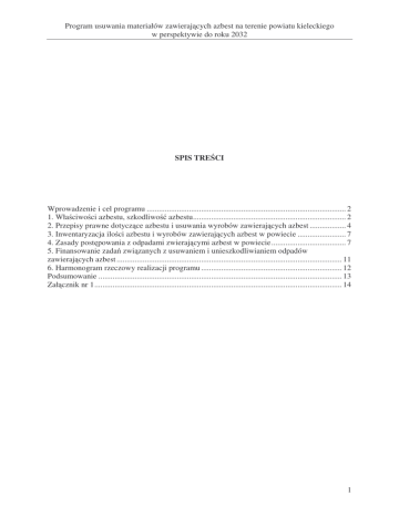 Program usuwania materiałów zawieraj cych azbest na terenie powiatu kieleckiego w perspektywie do roku 2032 SPIS TRE CI Wprowadzenie i cel programu ................................................................................................... 2 1. Wła ciwo ci azbestu, szkodliwo azbestu............................................................................ 2 2. Przepisy prawne dotycz ce azbestu i usuwania wyrobów zawieraj cych azbest .................. 4 3. Inwentaryzacja ilo ci azbestu i wyrobów zawieraj cych azbest w powiecie ........................ 7 4. Zasady post powania z odpadami zwieraj cymi azbest w powiecie..................................... 7 5. Finansowanie zada zwi zanych z usuwaniem i unieszkodliwianiem odpadów zawieraj cych azbest ................................................................................................................ 11 6. Harmonogram rzeczowy realizacji programu ...................................................................... 12 Podsumowanie ......................................................................................................................... 13 Zał cznik nr 1........................................................................................................................... 14 1 Program usuwania materiałów zawieraj cych azbest na terenie powiatu kieleckiego w perspektywie do roku 2032 Wprowadzenie i cel programu Azbest jest nazw ogóln obejmuj c włókniste minerały z grupy serpentynów i amfiboli. Nazwa ta wywodzi si od greckiego słowa „asbestos” i oznaczaj cego „niewygasaj cy” lub „niezniszczalny”. Staro ytni Grecy stosowali go bowiem do wyrobu knotów w lampach oliwnych. Surowcem powszechnie stosowanym stał si dopiero w XX wieku. Dzi ki od dawna znanej i cenionej odporno ci na wysok temperatur , trzy minerały azbestowe zyskały popularno i szerokie zastosowanie w gospodarce wiatowej. S to: najbardziej rozpowszechniony chryzotyl (azbest biały), w mniejszym stopniu wykorzystywany krokidolit (azbest niebieski) i jeszcze rzadziej stosowany amosyt (azbest br zowy). Pomimo szerokiego zastosowania praktycznego materiały zawieraj ce azbest nale do substancji stwarzaj cych szczególne zagro enie dla zdrowia ludzi i z tego powodu powinny podlega sukcesywnej eliminacji. Po usuni ciu wyrobów zawieraj cych azbest staj si one odpadami. Odpady zwieraj ce azbest nale do odpadów niebezpiecznych a gospodarka nimi wymaga prawidłowego prowadzenia oraz szczególnej kontroli. Szczególne zasady post powania z odpadami azbestowymi reguluje szereg przepisów m.in. ustawa o zakazie stosowania azbestu, ustawa Prawo ochrony rodowiska, ustawa o odpadach oraz zwi zane z nimi rozporz dzenia wykonawcze. Najwa niejszym jednak dokumentem okre laj cym organizacj i przebieg wycofania azbestu z gospodarki jest „Program usuwania azbestu i wyrobów zawieraj cych azbest stosowanych na terytorium Polski” przyj ty przez Rad Ministrów w maju 2002 r. Wspomniany „Program” oraz Plan gospodarki odpadami dla Województwa wi tokrzyskiego na lata 2007 -2011 (stycze 2007 r.) wskazuje na konieczno odr bnego potraktowania problemu usuwania azbestu st d opracowany jest niniejszy Program usuwania materiałów zawieraj cych azbest na terenie powiatu kieleckiego do 2032 roku. Odpady zawieraj ce azbest w wi kszo ci pochodz z rozbiórek i remontów obiektów budowlanych. S to przede wszystkim pokrycia dachowe, elewacyjne oraz rury ci nieniowe (wodoci gowe) i jak wynika z inwentaryzacji prowadzonej w gminach powiatu, najwi ksze nagromadzenie wyrobów zawieraj cych azbest wyst puje w starszych obiektach mieszkalnych oraz inwentarskich stanowi cych własno mieszka ców powiatu. Celem programu usuwania azbestu jest usuni cie i unieszkodliwienie do 2032 r. wszystkich wyrobów zawieraj cych azbest z terenu powiatu kieleckiego. Zadania Powiatu w zakresie bezpiecznego post powania z wyrobami zawieraj cymi azbest obejmuj : • edukacj ekologiczn , • wydawanie stosownych decyzji i zezwole dla firm remontowo-budowlanych i transportowych, • dofinansowanie kosztów usuwania odpadów zawieraj cych azbest z obiektów budowlanych poło onych na terenie powiatu ze rodków Powiatowego Funduszu Ochrony rodowiska i Gospodarki Wodnej, • koordynacj działa w zakresie usuwania azbestu z udziałem gmin. 1. Wła ciwo ci azbestu, szkodliwo azbestu Specyficzne wła ciwo ci azbestu - niepalno , wytrzymało mechaniczna i termiczna oraz elastyczno - sprawiły, e azbest znalazł szerokie zastosowanie w ró nego rodzaju technologiach przemysłowych. Po nagrzaniu do 350°C odporno mechaniczna włókien azbestu spada zaledwie o 20% (spowodowane to jest usuni ciem cz ci wody). Natomiast po przyj ciu wody z wilgotnego otoczenia wraca do poprzedniego stanu. Dopiero temperatura ponad 700°C powoduje całkowite odparowanie wody i nieodwracalne zniszczenie materiału (włókna trac elastyczno i zaczynaj si kruszy ). 2 Program usuwania materiałów zawieraj cych azbest na terenie powiatu kieleckiego w perspektywie do roku 2032 Najwi ksza ilo tego surowca (około 85% całkowitego zu ycia) wykorzystywana była w produkcji materiałów budowlanych, przede wszystkim do wytwarzania dachowych i elewacyjnych płyt azbestowo-cementowych. Stosowany był na du skal do połowy lat osiemdziesi tych, czyli do momentu udowodnienia szkodliwego oddziaływania tego materiału na zdrowie ludzi. Badania dowiodły rakotwórcze działanie włókien azbestu, które przedostaj si do organizmu z wdychanym powietrzem. S to włókna grubo ci mniejszej ni 3 µm, długo ci wi kszej ni 45 µm (proporcja - długo : rednica > 3:1). Wdychanie azbestu mo e by przyczyn gro nych chorób, w tym azbestozy (pylicy azbestowej), zmian opłucnowych, mi dzybłonniaka opłucnej oraz raka płuc. Choroby te maj długi okres inkubacji i mog ujawni si nawet po 30 latach od chwili wchłoni cia włókien. Klasyfikacja wyrobów zawieraj cych azbest Wyroby zawieraj ce azbest wyst puj w dwóch klasach. Kl