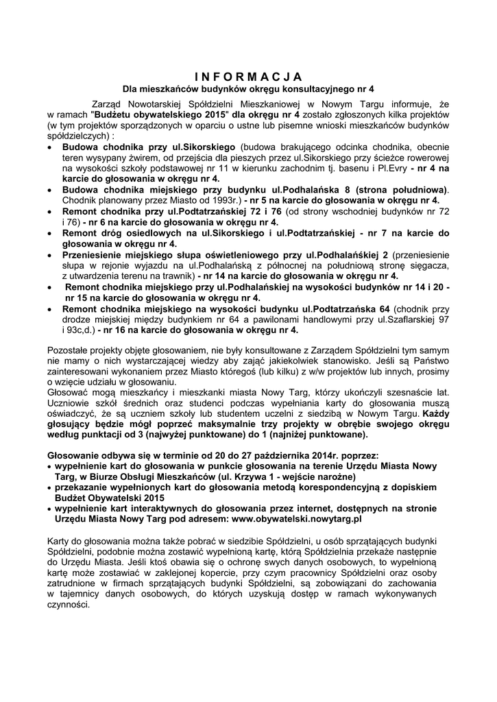 INFORMACJA Dla mieszkańców budynków okręgu konsultacyjnego nr 4 Zarząd Nowotarskiej Spółdzielni Mieszkaniowej w Nowym Targu informuje, że w ramach "Budżetu obywatelskiego 2015" dla okręgu nr 4 zostało zgłoszonych kilka projektów (w tym projektów sporządzonych w oparciu o ustne lub pisemne wnioski mieszkańców budynków spółdzielczych) : Budowa chodnika przy ul.Sikorskiego (budowa brakującego odcinka chodnika, obecnie teren wysypany żwirem, od przejścia dla pieszych przez ul.Sikorskiego przy ścieżce rowerowej na wysokości szkoły podstawowej nr 11 w kierunku zachodnim tj. basenu i Pl.Evry - nr 4 na karcie do głosowania w okręgu nr 4. Budowa chodnika miejskiego przy budynku ul.Podhalańska 8 (strona południowa). Chodnik planowany przez Miasto od 1993r.) - nr 5 na karcie do głosowania w okręgu nr 4. Remont chodnika przy ul.Podtatrzańskiej 72 i 76 (od strony wschodniej budynków nr 72 i 76) - nr 6 na karcie do głosowania w okręgu nr 4. Remont dróg osiedlowych na ul.Sikorskiego i ul.Podtatrzańskiej - nr 7 na karcie do głosowania w okręgu nr 4. Przeniesienie miejskiego słupa oświetleniowego przy ul.Podhalańśkiej 2 (przeniesienie słupa w rejonie wyjazdu na ul.Podhalańską z północnej na południową stronę sięgacza, z utwardzenia terenu na trawnik) - nr 14 na karcie do głosowania w okręgu nr 4. Remont chodnika miejskiego przy ul.Podhalańskiej na wysokości budynków nr 14 i 20 nr 15 na karcie do głosowania w okręgu nr 4. Remont chodnika miejskiego na wysokości budynku ul.Podtatrzańska 64 (chodnik przy drodze miejskiej między budynkiem nr 64 a pawilonami handlowymi przy ul.Szaflarskiej 97 i 93c,d.) - nr 16 na karcie do głosowania w okręgu nr 4. Pozostałe projekty objęte głosowaniem, nie były konsultowane z Zarządem Spółdzielni tym samym nie mamy o nich wystarczającej wiedzy aby zająć jakiekolwiek stanowisko. Jeśli są Państwo zainteresowani wykonaniem przez Miasto któregoś (lub kilku) z w/w projektów lub innych, prosimy o wzięcie udziału w głosowaniu. Głosować mogą mieszkańcy i mieszkanki miasta Nowy Targ, którzy ukończyli szesnaście lat. Uczniowie szkół średnich oraz studenci podczas wypełniania karty do głosowania muszą oświadczyć, że są uczniem szkoły lub studentem uczelni z siedzibą w Nowym Targu. Każdy głosujący będzie mógł poprzeć maksymalnie trzy projekty w obrębie swojego okręgu według punktacji od 3 (najwyżej punktowane) do 1 (najniżej punktowane). Głosowanie odbywa się w terminie od 20 do 27 października 2014r. poprzez: wypełnienie kart do głosowania w punkcie głosowania na terenie Urzędu Miasta Nowy Targ, w Biurze Obsługi Mieszkańców (ul. Krzywa 1 - wejście narożne) przekazanie wypełnionych kart do głosowania metodą korespondencyjną z dopiskiem Budżet Obywatelski 2015 wypełnienie kart interaktywnych do głosowania przez internet, dostępnych na stronie Urzędu Miasta Nowy Targ pod adresem: www.obywatelski.nowytarg.pl Karty do głosowania można także pobrać w siedzibie Spółdzielni, u osób sprzątających budynki Spółdzielni, podobnie można zostawić wypełnioną kartę, którą Spółdzielnia przekaże następnie do Urzędu Miasta. Jeśli ktoś obawia się o ochronę swych danych osobowych, to wypełnioną kartę może zostawiać w zaklejonej kopercie, przy czym pracownicy Spółdzielni oraz osoby zatrudnione w firmach sprzątających budynki Spółdzielni, są zobowiązani do zachowania w tajemnicy danych osobowych, do których uzyskują dostęp w ramach wykonywanych czynności.