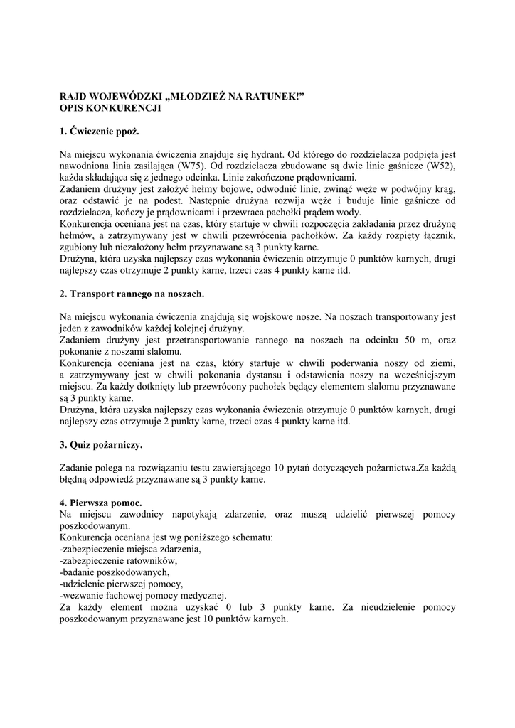 RAJD WOJEWÓDZKI „MŁODZIEś NA RATUNEK!” OPIS KONKURENCJI 1. Ćwiczenie ppoŜ. Na miejscu wykonania ćwiczenia znajduje się hydrant. Od którego do rozdzielacza podpięta jest nawodniona linia zasilająca (W75). Od rozdzielacza zbudowane są dwie linie gaśnicze (W52), kaŜda składająca się z jednego odcinka. Linie zakończone prądownicami. Zadaniem druŜyny jest załoŜyć hełmy bojowe, odwodnić linie, zwinąć węŜe w podwójny krąg, oraz odstawić je na podest. Następnie druŜyna rozwija węŜe i buduje linie gaśnicze od rozdzielacza, kończy je prądownicami i przewraca pachołki prądem wody. Konkurencja oceniana jest na czas, który startuje w chwili rozpoczęcia zakładania przez druŜynę hełmów, a zatrzymywany jest w chwili przewrócenia pachołków. Za kaŜdy rozpięty łącznik, zgubiony lub niezałoŜony hełm przyznawane są 3 punkty karne. DruŜyna, która uzyska najlepszy czas wykonania ćwiczenia otrzymuje 0 punktów karnych, drugi najlepszy czas otrzymuje 2 punkty karne, trzeci czas 4 punkty karne itd. 2. Transport rannego na noszach. Na miejscu wykonania ćwiczenia znajdują się wojskowe nosze. Na noszach transportowany jest jeden z zawodników kaŜdej kolejnej druŜyny. Zadaniem druŜyny jest przetransportowanie rannego na noszach na odcinku 50 m, oraz pokonanie z noszami slalomu. Konkurencja oceniana jest na czas, który startuje w chwili poderwania noszy od ziemi, a zatrzymywany jest w chwili pokonania dystansu i odstawienia noszy na wcześniejszym miejscu. Za kaŜdy dotknięty lub przewrócony pachołek będący elementem slalomu przyznawane są 3 punkty karne. DruŜyna, która uzyska najlepszy czas wykonania ćwiczenia otrzymuje 0 punktów karnych, drugi najlepszy czas otrzymuje 2 punkty karne, trzeci czas 4 punkty karne itd. 3. Quiz poŜarniczy. Zadanie polega na rozwiązaniu testu zawierającego 10 pytań dotyczących poŜarnictwa.Za kaŜdą błędną odpowiedź przyznawane są 3 punkty karne. 4. Pierwsza pomoc. Na miejscu zawodnicy napotykają zdarzenie, oraz muszą udzielić pierwszej pomocy poszkodowanym. Konkurencja oceniana jest wg poniŜszego schematu: -zabezpieczenie miejsca zdarzenia, -zabezpieczenie ratowników, -badanie poszkodowanych, -udzielenie pierwszej pomocy, -wezwanie fachowej pomocy medycznej. Za kaŜdy element moŜna uzyskać 0 lub 3 punkty karne. Za nieudzielenie pomocy poszkodowanym przyznawane jest 10 punktów karnych. 5. Ratownictwo wodne. Na miejscu wykonania ćwiczenia znajduje się koło ratunkowe, rzutka ratunkowa i dwie kamizelki ratunkowe. Rzucają kolejno wszyscy zawodnicy. Rzucający zobowiązani są do załoŜenia kamizelek ratunkowych. Zadaniem druŜyny jest trafienie kołem, a następnie rzutką ratunkową do celu, jakim są dwie bojki oddalone od siebie o 1m zakotwione w odległości 5 m od brzegu. Konkurencja oceniana jest na podstawie trafień do celu. Za kaŜdy niecelny rzut przyznawane są 2 punkty karne, za nie załoŜenie kamizelek ratunkowych przyznawane jest po 5 punktów karnych. 6. Sztafeta węŜowa. Na miejscu wykonania ćwiczenia znajduje się rozwinięty wąŜ W52, na końcu którego podpięta jest prądownica prosta. Zawodnicy ustawiają się po obu końcach węŜa w następujący sposób: po stronie z prądownicą ustawia się trójka zawodników, po stronie bez prądownicy dwójka zawodników. Na sygnał sędziego pierwszy z zawodników podbiega do łącznika węŜa, od którego odpina prądownicę, biegnie na drugi koniec odcinka, podpina prądownicę i dobiega do zawodników stojących po drugiej stronie. Stamtąd rusza kolejny zawodnik. Konkurencja prowadzona jest do momentu wykonania wyŜej opisanych czynności przez wszystkich zawodników. Konkurencja oceniana jest na czas. Za rozpięcie łączników przyznawane są 3 punkty karne. DruŜyna, która uzyska najlepszy czas wykonania ćwiczenia otrzymuje 0 punktów karnych, drugi najlepszy czas otrzymuje 2 punkty karne, trzeci czas 4 punkty karne itd. 7. Quiz medyczny. Na punkcie kontrolnym druŜyna musi odpowiedzieć na 10 pytań związanych z pierwszą pomocą. Za kaŜdą błędną odpowiedź przyznawane są 3 punkty karne. 8. Tor przeszkód. Na miejscu wykonania ćwiczenia ustawiony zostanie tor przeszkód, który zawodnicy będą musieli pokonać kolejno. KaŜdy z zawodników pokonuje kolejne przeszkody na torze, a następnie wraca na linię startu z boku ustawionego toru przeszkód. Po przekroczeniu przez zawodnika linii początkowej toru, startuje kolejny zawodnik z druŜyny. Tor przeszkód zostanie przedstawiony zawodników przed startem, a do jego wykonania zostaną uŜyte przeszkody uŜywane w sztafecie poŜarniczej 7x50m oraz przeszkody z toru dla MDP. Za kaŜdą ominiętą przeszkodę zawodnicy otrzymują 3 punkty karne. DruŜyna, która uzyska najlepszy czas wykonania ćwiczenia otrzymuje 0 punktów karnych, drugi najlepszy czas otrzymuje 2 punkty karne, trzeci czas 4 punkty karne itd. 9. Zadanie zagadka.* Zadanie ma zweryfikować predyspozycje zawodników do niesienia pomocy. DruŜyny nie znają załoŜeń zadania. Zadanie to moŜe być rozlokowane na całej trasie. Za nie podjęcie zadania zagadki przewidziane są punkty karne- 10 punktów. *na chwilę obecną nie wiadomo czy zadanie będzie realizowane w ramach rajdu. 10. Ratownictwo ekologiczne: Zadanie odbywać się będzie na cieku wodnym o szerokości 1,5m. Zadaniem druŜyny będzie jak najszybsze zebranie medium unoszącego się na powierzchni cieku za pomocą specjalnego sita, a następnie umieszczenie go w przeznaczonym do tego pojemniku. Konkurencja oceniana jest na czas. Za niezebranie medium z powierzchni, częściowe lub całkowite przyznawane jest 10 punktów karnych. DruŜyna, która uzyska najlepszy czas wykonania ćwiczenia otrzymuje 0 punktów karnych, drugi najlepszy czas otrzymuje 2 punkty karne, trzeci czas 4 punkty karne itd. 11. Ratownictwo wysokościowe: DruŜyny po przybyciu na miejsce otrzymują schemat budowy układu wyciągowego. Zadaniem druŜyny jest 