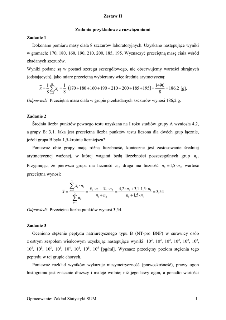 Zestaw II Zadania przykładowe z rozwiązaniami Zadanie 1 Dokonano pomiaru masy ciała 8 szczurów laboratoryjnych. Uzyskano następujące wyniki w gramach: 170, 180, 160, 190, 210, 200, 185, 195. Wyznaczyć przeciętną masę ciała wśród zbadanych szczurów. Wyniki podane są w postaci szeregu szczegółowego, nie obserwujemy wartości skrajnych (odstających), jako miarę przeciętną wybieramy więc średnią arytmetyczną: 1 8 1 1490 x xi 170 180 160 190 210 200 185 195 186,2 [g]. 8 i 1 8 8 Odpowiedź: Przeciętna masa ciała w grupie przebadanych szczurów wynosi 186,2 g. Zadanie 2 Średnia liczba punktów pewnego testu uzyskana na I roku studiów grupy A wyniosła 4,2, a grupy B: 3,1. Jaka jest przeciętna liczba punktów testu liczona dla dwóch grup łącznie, jeżeli grupa B była 1,5-krotnie liczniejsza? Ponieważ obie grupy mają różną liczebność, konieczne jest zastosowanie średniej arytmetycznej ważonej, w której wagami będą liczebności poszczególnych grup ni . Przyjmując, że pierwsza grupa ma liczność n1 , druga ma liczność n2 1,5 n1 , wartość przeciętna wynosi: 2 x x n i i 1 i 2 n i 1 x1 n1 x2 n2 4,2 n1 3,11,5 n1 3,54 n1 n2 n1 1,5 n1 i Odpowiedź: Przeciętna liczba punktów wynosi 3,54. Zadanie 3 Oceniono stężenie peptydu natriuretycznego typu B (NT-pro BNP) w surowicy osób z ostrym zespołem wieńcowym uzyskując następujące wyniki: 102, 102, 102, 102, 102, 102, 103, 103, 103, 104, 104, 104, 105, 105 [pg/ml]. Wyznacz przeciętny poziom stężenia tego peptydu w tej grupie chorych. Ponieważ rozkład wyników wykazuje niesymetryczność (prawoskośność), prawy ogon histogramu jest znacznie dłuższy i maleje wolniej niż jego lewy ogon, a ponadto wartości Opracowanie: Zakład Statystyki SUM 1 Zestaw II stężenia NT-pro BNP są wielokrotnościami poprzednich (różnią się o rząd jednostek), jako wartość przeciętną zastosujemy średnią geometryczną dla szeregu szczegółowego: 6 3 3 xG n x1 x2 ...xn 14 102 103 104 105 2 14 1012 109 1012 1010 14 1043 1178,8 Odpowiedź: Przeciętne stężenie NT-pro BNP w surowicy osób z ostrym zespołem wieńcowym wynosi 1178,8 [pg/ml]. Zadanie 4 Jedno z przedsiębiorstw biotechnologicznych posiada cztery zakłady na terenie kraju. W każdym z zakładów wytwarzany jest ten sam wyrób, ale średnia wydajność pracy w tych zakładach jest różna. W pierwszym zakładzie wynosi 20 szt./h, w drugim 22 szt./h, trzecim 18 szt./h, natomiast w zakładzie czwartym wydajność ta wynosi 25 szt./h. Jaka jest przeciętna wydajność w całym przedsiębiorstwie? Ponieważ informacje o wydajności pracy w każdym z zakładów podane są w przeliczeniu na stałą jednostkę innej zmiennej, więc skorzystamy tutaj do obliczenia przeciętnej wydajności z wzoru na średnią harmoniczną dla szeregu szczegółowego: MH n n 1 x i 1 i 4 1 1 1 1 20 22 18 25 4 20,9 0,191 Odpowiedź: Przeciętna wydajność w całym przedsiębiorstwie wynosi 20,9 szt./h. Zadanie 5 Grupę 101 absolwentów pewnej uczelni zbadano ze względu średnią ocen ze studiów. Trzynastu studentów uzyskało ocenę ndst, piętnastu dst, trzydziestu db, dwudziestu trzech bdb, pozostali uzyskali ocenę celującą. Wyznaczyć wartość przeciętną, medianę oraz dominantę ocen ze studiów. Odpowiedź: Dane zostały przedstawione w postaci szeregu rozdzielczego punktowego, w którym nie występują dane odstające. Wartość przeciętną wynosi więc: x 1 n 1 426 xi ni 13 2 15 3 30 4 23 5 20 6 4,3 , n i 1 101 101 mediana Me 4 , a dominanta D 4 . Przeciętna ocena ze studiów wynosiła 4,3, połowa studentów miała ocenę mniejszą lub równą dobry, a połowa większą lub równą dobry. Najczęstszą ocena była ocena dobra. Opracowanie: Zakład Statystyki SUM 2 Zestaw II Zadanie 6 Pewną próbę o liczebności 100, badano pod względem wzrostu, wagi i wieku. Uzyskano następujące wyniki: 𝐴𝑠 0,28 0,45 0,37 Cecha Waga [kg] Wiek [lata] Wzrost [cm] 𝐾 0,38 0,45 0,17 𝑥̅ 68 36 164 𝑠2 16 9 7,84 Która z cech charakteryzuje się: (odpowiedź uzasadnij) a) Większym zróżnicowaniem wyników? b) Mniejszym skupieniem wokół średniej? c) Większą symetrią? Odpowiedź: a) Aby zbadać, która cecha charakteryzuje się większym zróżnicowaniem wyników należy obliczyć współczynnik zmienności dla każdej cechy: √7,84 √16 √9 𝑉𝑠𝑤𝑧𝑟𝑜𝑠𝑡 = ⋅ 100% 𝑉𝑠𝑤𝑎𝑔𝑎 = ⋅ 100% ≈ 6% 𝑉𝑠𝑤𝑖𝑒𝑘 = ⋅ 100% ≈ 11% 164 68 36 ≈ 2% Największym zróżnicowaniem wyników charakteryzuje się cecha wiek (ponieważ współczynnik zmienności jest największy). b) Najmniejszym skupieniem wokół średniej charakteryzuje się cecha wzrost (ponieważ Kurtoza jest najmniejsza). c) Największą symetrią charakteryzuje się cecha waga (ponieważ współczynnik asymetrii jest najmniejszy). Zadanie 7 Spytano grupę kobiet i mężczyzn o tygodniowy czas poświęcony przez nich na porządki domowe (w godzinach) i uzyskano następujące informacje: Mężczyźni: 1, 3, 3, 3, 5, 3, 2, 2, 0, 0, 0, 1, 0, 2, 2, 0, 3, 4, 5, 4. Kobiety: 4, 6, 8, 8, 10, 10, 10, 16, 11, 6, 6, 6, 8, 10, 8, 8, 11, 16, 14, 8. a) Która ze zbiorowości charakteryzuje się większym rozproszeniem wyników? b) Ile co najmniej godzin tygodniowo poświęca na porządki domowe co najwyżej 75% badanych kobiet? 𝑥𝑖 0 1 2 3 4 5 𝑛𝑖 5 2 4 5 2 2 Opracowanie: Zakład Statystyki SUM 𝑥𝑖 ⋅ 𝑛𝑖 0 2 8 15 8 10 𝑥𝑖 − 𝑥̅ -2,15 -1,15 -0,15 0,85 1,85 2,85 (𝑥𝑖 − 𝑥̅ )2 4,6225 1,3225 0,0225 0,7225 3,4225 8,1225 (𝑥𝑖 − 𝑥̅ )2 ⋅ 𝑛𝑖 23,1125 2,645 0,09 3,6125 6,845 16,245 3 Zestaw II Ile co ∑ 𝑛𝑖 =20 ∑ 𝑥𝑖 ⋅ 𝑛𝑖 =43 ∑(𝑥𝑖 − 𝑥̅ )2 ⋅ 𝑛𝑖 =52,55 najwyżej godzin tygodniowo poświęca na porządki domowe co najwyżej 25% badanych mężczyzn? Odpowiedź: a) Mężczyźni: c) 𝑥̅ = ∑ 𝑥𝑖 ⋅𝑛𝑖 ∑ 𝑛𝑖 43 = 20 = 2,15 1 52,55 19 𝑠̂ = √𝑁