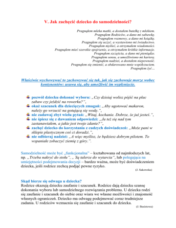 V. Jak zachęcić dziecko do samodzielności? Pragnąłem mleka matki, a dostałem butelkę z mlekiem. Pragnąłem Rodziców, a dano mi zabawkę. Pragnąłem rozmowy, a dano mi książkę. Pragnąłem się uczyć, a wystawiono mi świadectwo. Pragnąłem myśleć, a otrzymałem wiadomości. Pragnąłem mieć szerokie spojrzenie, a otrzymałem krótkie informacje. Pragnąłem szczęścia, a dano mi pieniądze. Pragnąłem sensu, a umożliwiono mi karierę. Pragnąłem nadziei, a dostałem niepewność. Pragnąłem się zmienić, a obdarowano mnie współczuciem. Pragnąłem żyć… Właściwie wychowywać to zachowywać się tak, jak się zachowuje morze wobec kontynentów: usuwa się, aby umożliwić im wypłynięcie. pozwól dziecku dokonać wyboru: „Czy dzisiaj wolisz pójść na plac zabaw czy jeździć na rowerku?”, okaż szacunek dla dziecięcych zmagań: „Aby ugotować makaron, należy go wrzucić na gotującą się wodę.”, nie zadawaj zbyt wielu pytań: „Witaj, kochanie. Dobrze, że już jesteś.”, nie śpiesz się z dawaniem odpowiedzi: „Ja też się nad tym zastanawiałem, a jakie jest twoje zdanie?”, zachęć dziecko do korzystania z cudzych doświadczeń: „Może pani w sklepie plastycznym coś ci doradzi.”, nie odbieraj nadziei: „A więc myślisz, że będziesz dobrym pilotem. To wspaniałe zobaczyć ziemię z góry.”. Samodzielność może być „funkcjonalna” – kształtowana od najmłodszych lat, np. „Trzeba nakryć do stołu”, „ Są talerze do wytarcia”, lub polegająca na umiejętności podejmowania decyzji – bardzo ważna, może być doświadczeniem dziecka, jeśli rodzice zechcą podjąć pewne ryzyko. (J. Sakowska) Skąd bierze się odwaga u dziecka? Rodzice okazują dziecku zaufanie i szacunek. Rodzice dają dziecku szansę dokonania wyboru lub samodzielnego rozwiązania problemu. U dziecka rodzi się zaufanie i szacunek do siebie oraz wiara we własne możliwości i znajomość własnych ograniczeń. Dziecko ma odwagę podejmować coraz trudniejsze zadania. U rodziców wzmacnia się zaufanie i szacunek do dziecka. (J. Basistowa) Ważne uwagi o wychowaniu do samodzielności: kochać dziecko to pomóc mu żyć samodzielnie, obowiązkiem rodziców jest wychowanie dzieci w taki sposób, aby były one zdolne w odpowiednim momencie rozpocząć życie na własny rachunek. Dziecko, dorastając, staje się od nas coraz mniej zależne, wychowywać dziecko to znaczy pomóc mu stać się panem samego siebie, wychowywać to znaczy nie uzależniać, rodzice, zaraz potem, jak obdarowali swoje dziecko życiem, powinni mu dać prawo do swobodnego przeżywania go, miłość nie może być bojaźliwa. Rodzice często mają zwyczaj trzymania dziecka „pod kloszem” albo wyręczania go. Nie jest to jednak miłość, ale zwykła zaborczość i wstrzymywanie rozwoju. Czy tak ograniczone dziecko będzie umiało zmagać się z życiem, jeśli wcześniej nie nauczyło się pokonywania trudności. Nie uczyni tego, jeśli o wszystkim zawsze decydowali inni. Za każdym razem, kiedy wykonujemy coś za dziecko, odbieramy mu część jego życia. Prawdziwa miłość musi być mocna, skromna, wymagająca od siebie i od innych, ofiarna, a czasami nie pozbawiona bólu. Jedynie taka miłość czyni życie ludzkim, samodzielność dziecka można rozwijać lub tłumić. Zależnie od postępowania rodziców, mamy do czynienia z dwudziestolatkiem, który nie wie, jak załatwić najprostszą sprawę, lub z młodym człowiekiem, który w sposób odpowiedzialny potrafi podejmować decyzje, samodzielnie uporać się z wieloma problemami. (P. Pellegrino)