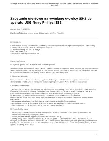 Biuletyn Informacji Publicznej Samodzielnego Publicznego Zakładu Opieki Zdrowotnej MSWiA z W-MCO w Olsztynie Zapytanie ofertowe na wymianę głowicy S5-1 do aparatu USG firmy Philips IE33 Olsztyn, dnia 11.10.2016 r. Zapytanie ofertowe na wymianę głowicy S5-1 do aparatu USG firmy Philips IE33 Zamawiający: Samodzielny Publiczny Zakład Opieki Zdrowotnej Ministerstwa i Administracji Spraw Wewnętrznych i Administracji z Warmińsko-Mazurskim Centrum Onkologii w Olsztynie Al. Wojska Polskiego 37, 10-228 Olsztyn Faks: /089/ 539-82-18 adres e-mail: [email protected] Zapytanie ofertowe na wymianę głowicy S5-1 do aparatu USG firmy Philips IE33. W imieniu Samodzielnego Publicznego Zakładu Opieki Zdrowotnej Ministerstwa Spraw Wewnętrznych i Administracji z Warmińsko-Mazurskim Centrum Onkologii w Olsztynie, al. Wojska Polskiego 37, 10-228 Olsztyn, zapraszam Państwa do złożenia oferty na wymianę głowicy S5-1 do aparatu USG firmy Philips IE33. I. Warunki zamówienia: Postępowanie prowadzone jest w formie zapytania ofertowego o wartości szacunkowej nieprzekraczającej równowartości 30 000 euro, do którego nie stosuje się przepisów ustawy Prawo zamówień publicznych. II. Przedmiot zamówienia: 1. Przedmiotem niniejszego zamówienia jest wymiana 1 szt. uszkodzonej głowicy S5-1 do aparatu USG firmy Philips IE33 na zupełnie nową, oryginalną. Zamawiający nie dopuszcza do zaoferowania głowic rekondycjonowanych. 2. Wykonawca zobowiązany jest do demontażu, na własny koszt, starej uszkodzonej głowicy. Po wykonanym demontażu uszkodzona gowica zostanie przekazana Wykonawcy. Przekazanie zostanie potwierdzone przez obie Strony poprzez podpisanie protokołu przekazania (lub innego równoważnego dokumentu). 3. Wykonawca zobowiązany jest do instalacja nowej głowicy w siedzibie Zamawiającego. 4. Wykonawca udziela 12 miesięcznej gwarancji na dostarczony produkt od momentu jego wymiany. 5. Termin dostawy: do 28 dni roboczych od daty otrzymania zamówienia. III. Pozostałe informacje 1. Wszelkie pytanie dotyczące niniejszego postępowania należy kierować na adres: [email protected] 2. Wykonawca może złożyć tylko jedną ofertę. 3. Oferta powinna zawierać wypełniony i podpisany formularz oferty. 4. Ofertę należy złożyć w terminie do dnia 17.10.2016 r., godz. 14.00 w Kancelarii SP ZOZ MSWiA z W-MCO w Olsztynie, lub przesłać faksem na numer 089 539 82 18 lub pocztą elektroniczną na adres: [email protected]. W przypadku składania oferty w kancelarii kopertę należy opisać następująco: „Oferta na wymianę głowicy S5-1 do aparatu USG firmy Philips IE33” 1 Biuletyn Informacji Publicznej Samodzielnego Publicznego Zakładu Opieki Zdrowotnej MSWiA z W-MCO w Olsztynie 5. Koszty dostawy oraz instalacji należy wkalkulować w cenę oferty. 6. Kryterium wyboru oferty jest cena. Zamawiający udzieli zamówienia Wykonawcy, który zaoferuje najniższą cenę. 7. Zamawiający zastrzega prawo unieważnienia postępowania, w szczególności jeżeli zaoferowane ceny przekroczą kwotę przeznaczoną na sfinansowanie zamówienia. 8. Zawiadomienie o wynikach przeprowadzonego postępowania zostanie przekazane za pomocą faksu na numer wskazany w ofercie lub elektronicznie na podany adres email. 9. Zamówienie zostanie udzielone w formie pisemnego zlecenia. 10. Termin płatności : do 30 dni od daty otrzymania faktury. Załącznik: 1) Wzór formularza oferty 2