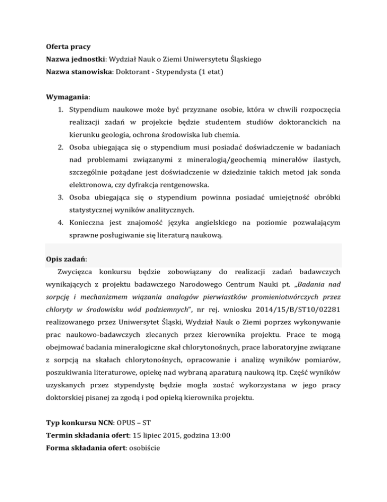 Oferta pracy Nazwa jednostki: Wydział Nauk o Ziemi Uniwersytetu Śląskiego Nazwa stanowiska: Doktorant ‐ Stypendysta (1 etat) Wymagania: 1. Stypendium naukowe może być przyznane osobie, która w chwili rozpoczęcia realizacji zadań w projekcie będzie studentem studiów doktoranckich na kierunku geologia, ochrona środowiska lub chemia. 2. Osoba ubiegająca się o stypendium musi posiadać doświadczenie w badaniach nad problemami związanymi z mineralogią/geochemią minerałów ilastych, szczególnie pożądane jest doświadczenie w dziedzinie takich metod jak sonda elektronowa, czy dyfrakcja rentgenowska. 3. Osoba ubiegająca się o stypendium powinna posiadać umiejętność obróbki statystycznej wyników analitycznych. 4. Konieczna jest znajomość języka angielskiego na poziomie pozwalającym sprawne posługiwanie się literaturą naukową. Opis zadań: Zwycięzca konkursu będzie zobowiązany do realizacji zadań badawczych wynikających z projektu badawczego Narodowego Centrum Nauki pt. „Badania nad sorpcję i mechanizmem wiązania analogów pierwiastków promieniotwórczych przez chloryty w środowisku wód podziemnych”, nr rej. wniosku 2014/15/B/ST10/02281 realizowanego przez Uniwersytet Śląski, Wydział Nauk o Ziemi poprzez wykonywanie prac naukowo‐badawczych zlecanych przez kierownika projektu. Prace te mogą obejmować badania mineralogiczne skał chlorytonośnych, prace laboratoryjne związane z sorpcją na skałach chlorytonośnych, opracowanie i analizę wyników pomiarów, poszukiwania literaturowe, opiekę nad wybraną aparaturą naukową itp. Część wyników uzyskanych przez stypendystę będzie mogła zostać wykorzystana w jego pracy doktorskiej pisanej za zgodą i pod opieką kierownika projektu. Typ konkursu NCN: OPUS – ST Termin składania ofert: 15 lipiec 2015, godzina 13:00 Forma składania ofert: osobiście Warunki zatrudnienia: Po rozstrzygnięciu konkursu stypendium naukowe w wysokości 1200 zł miesięcznie zostanie przyznane na okres 36 miesięcy: od 1 sierpnia 2015 roku do 31 lipca 2018 roku. Rozstrzygnięcie konkursu nastąpi nie później niż 24 lipca 2015 roku, po rozpatrzeniu wniosków, dokonaniu ich rankingu na podstawie Regulaminu przyznawania stypendiów naukowych dla młodych naukowców w projektach badawczych oraz regulaminu przyznawania stypendiów naukowych dla młodych naukowców w ramach stypendiów doktorskich ETIUDA finansowanych ze środków Narodowego Centrum Nauki, załącznik do uchwały NCN 50/2013 z dn. 3 06. 2013 r (pełny dokument na stronie NCNu, www.ncn.gov.pl/sites/default/files/pliki/uchwaly‐ rady/2013/uchwala50_2013.pdf) oraz po rozmowie kwalifikacyjnej z kandydatami. Stypendium będzie wypłacane na podstawie umowy zawartej między jednostką a doktorantem. Umowa ta będzie określała wysokość stypendium oraz okres i warunki jego wypłacania. Przewidywany czas pracy stypendysty to średnio 3 godziny dziennie, przy czym szczegółowy plan pracy będzie zależał od charakteru realizowanych w danym czasie zadań i będzie uzgodniony między stypendystą a kierownikiem projektu. Wypłata stypendium będzie mogła zostać wstrzymana, jeśli osoba pobierająca to stypendium nie będzie realizowała zadań badawczych w ramach projektu lub naruszy zasady etyki zawodowej. Dodatkowe informacje: Przystępując do konkursu należy dostarczyć: 1. Wniosek o przyznanie stypendium powinien zawierać: a) list intencyjny wnioskodawcy b) życiorys naukowy, a w szczególności posiadane doświadczenia badawcze c) listę dotychczasowych osiągnięć naukowych wnioskodawcy, w tym publikacji w renomowanych wydawnictwach lub czasopismach naukowych, d) listę wyróżnień wnioskodawcy wynikających z prowadzenia badań naukowych, stypendiów, nagród oraz doświadczeń naukowych zdobytych poza macierzystą jednostką naukową w kraju lub za granicą, warsztatów i szkoleń naukowych, a także udziału w realizacji projektów badawczych. 2. Dokumentację potwierdzającą informacje zawarte we wniosku (kopie artykułów naukowych, dyplomów, odpis indeksu, oświadczenia opiekunów naukowych, itp.). Materiały te zostaną zwrócone wnioskodawcy po rozstrzygnięciu konkursu. Zgłoszenia prosimy składać w Dziekanacie Studiów Doktoranckich na Wydziale Nauk o Ziemi Uniwersytetu Śląskiego. Prosimy o dopisanie w podaniu następującej klauzuli: „Wyrażam zgodę na przetwarzanie moich danych osobowych zawartych w mojej ofercie pracy dla potrzeb niezbędnych do realizacji procesu rekrutacji (zgodnie z ustawą z dnia 29 sierpnia 1997 roku o ochronie danych osobowych, Dz. U. Nr 133, poz. 883 z późn. zm.).”