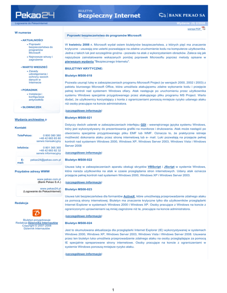 Wydanie: (5) 2/2008 Logowanie do PekaoInternet wersja PDF W numerze Poprawki bezpieczeństwa do programów Microsoft AKTUALNOŚCI Poprawki bezpieczeństwa do programów Microsoft Najnowsze wirusy i zagrożenia WARTO WIEDZIEĆ Zasady udostępniania i ochrony swoich danych w Internecie PORADNIK Instalacja i konfiguracja antyrootkita W kwietniu 2008 r. Microsoft wydał osiem biuletynów bezpieczeństwa, z których pięć ma znaczenie krytyczne - usuwają one usterki pozwalające na zdalne uruchomienie kodu na komputerze użytkownika. Jedna z takich luk jest szczególnie groźna - pozwala na atak z wykorzystaniem obrazków. Zaleca się jak najszybsze zainstalowanie wskazanych poniżej poprawek Microsoftu poprzez metody opisane w pierwszym wydaniu "Bezpiecznego Internetu". BIULETYNY KRYTYCZNE: Biuletyn MS08-018 Pozwala usunąć lukę w zabezpieczeniach programu Microsoft Project (w wersjach 2000, 2002 i 2003) z pakietu biurowego Microsoft Office, która umożliwia atakującemu zdalne wykonanie kodu i przejęcie pełnej kontroli nad systemem Windows ofiary. Atak następuje po uruchomieniu przez użytkownika systemu Windows specjalnie przygotowanego przez atakującego pliku programu MS Project. Warto dodać, że użytkownicy korzystający z konta z ograniczeniami ponoszą mniejsze ryzyko udanego ataku niż osoby pracujące na koncie administratora. SŁOWNICZEK (szczegółowe informacje) Wydania archiwalne Dotyczy dwóch usterek w zabezpieczeniach interfejsu GDI - wewnętrznego języka systemu Windows, Kontakt TelePekao: 0 800 380 380 +48 42 683 83 80 serwis transakcyjny Infolinia: 0 801 365 365 +48 42 683 82 32 serwis informacyjny Email: Biuletyn MS08-021 [email protected] który jest wykorzystywany do prezentowania grafiki na monitorze i drukowania. Atak może nastąpić po otworzeniu specjalnie przygotowanego pliku EMF lub WMF. Oznacza to, że praktycznie istnieje możliwość dokonania ataku przez stronę internetową lub e- mail. Luki pozwalają na przejęcie pełnej kontroli nad systemem Windows 2000, Windows XP, Windows Server 2003, Windows Vista i Windows Server 2008 (szczegółowe informacje) Biuletyn MS08-022 Usuwa lukę w zabezpieczeniach aparatu obsługi skryptów VBScript i JScript w systemie Windows, Przydatne adresy WWW www.pekao.com.pl (Bank Pekao S.A.) www.pekao24.pl (Logowanie do PekaoInternet) Redakcja która naraża użytkownika na atak w czasie przeglądania stron internetowych. Udany atak oznacza przejęcie pełnej kontroli nad systemem Windows 2000, Windows XP i Windows Server 2003. (szczegółowe informacje) Biuletyn MS08-023 Usuwa luki bezpieczeństwa dla formantów ActiveX, które umożliwiają przeprowadzenie zdalnego ataku za pomocą strony internetowej. Biuletyn ma znaczenie krytyczne tylko dla użytkowników przeglądarki Internet Explorer w systemach Windows 2000 i Windows XP. Osoby pracujące z Windows na koncie z ograniczonymi uprawnieniami są mniej zagrożone niż te, pracujące na koncie administratora. (szczegółowe informacje) Biuletyn przygotowuje Redakcja Dziennika Internautów Copyright © 2007-2008 Dziennik Internautów Biuletyn MS08-024 Jest to skumulowana aktualizacja dla przeglądarki Internet Explorer (IE) wykorzystywanej w systemach Windows 2000, Windows XP, Windows Server 2003, Windows Vista i Windows Server 2008. Usuwana przez ten biuletyn luka umożliwia przeprowadzenie zdalnego ataku na osoby przeglądające za pomocą IE specjalnie spreparowane strony internetowe. Osoby pracujące na koncie z ograniczeniami w systemie Windows ponoszą mniejsze ryzyko ataku. (szczegółowe informacje) 1 BIULETYNY WAŻNE: Biuletyn MS08-019 Usuwa lukę w zabezpieczeniach programu Microsoft Visio (w wersjach 2002, 2003 i 2007) z pakietu biurowego Microsoft Office, pozwalającą na zdalne wykonane kodu. Atak powiedzie się, jeśli użytkownik tego programu otworzy specjalnie spreparowany plik programu Visio. Atakujący może uzyskać pełną kontrolę nad systemem Windows. Najmniej zagrożone skutecznym atakiem są osoby pracujące na koncie z ograniczeniami. (szczegółowe informacje) Biuletyn MS08-020 Usuwa lukę w zabezpieczeniach klientów DNS systemu Windows, pozwalającą atakującemu na podszywanie się pod zaufane strony. Luka dotyczy systemów Windows 2000, Windows XP, Windows Server 2003 oraz Windows Vista. (szczegółowe informacje) Biuletyn MS08-025 Dotyczy luki w zabezpieczeniach jądra systemu Windows, pozwalającej atakującemu na podniesienie poziomu uprawnień na koncie z ograniczeniami. Dzięki wykorzystaniu tej luki osoba zalogowana na koncie z ograniczeniami może mieć takie same uprawnienia do wykonywania operacji w systemie, jakby zalogowała się na koncie administratora. Usterka dotyczy systemu Windows 2000, Windows XP, Windows Server 2003, Windows Vista i Windows Server 2008. (szczegółowe informacje) W maju 2008 r. Microsoft opublikował tylko cztery biuletyny bezpieczeństwa, z których trzy mają znaczenie krytyczne. W tym miesiącu udostępniony został także zestaw poprawek (Service Pack 1) do pakietu biurowego MS Office 2008 for Mac. Zaleca się jak najszybsze zainstalowanie wskazanych poniżej poprawek Microsoftu. BIULETYNY KRYTYCZNE: Biuletyn MS08-026 Usuwa usterkę w zabezpieczeniach programu Microsoft Word, umożliwiającą zdalne wykonanie kodu w systemie Windows ofiary. Atak z jej wykorzystaniem może nastąpić, kiedy użytkownik otworzy specjalnie spreparowany dokument programu Word. Osoba atakująca może w wyniku tego przejąć pełną kontrolę nad systemem ofiary. Ryzyko udanego ataku jest mniejsze w przypadku osób pracujących na koncie z ograniczonymi uprawnieniami. Luka dotyczy pakietu Microsoft Office 2000, Microsoft Office XP, Microsoft Office 2003 oraz 2007 Microsoft Office System. (szczegółowe informacje) Biuletyn MS08-027 Dotyczy luki w zabezpieczeniach programu Office Publisher, która to umożliwia przeprowadzenie zdalnego ataku i przejęcie pełnej kontroli nad systemem Windows ofiary. Atak następuje, gdy