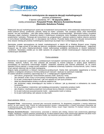 Podejście semiotyczne do wsparcia decyzji marketingowych poziom podstawowy II termin szkolenia: 17 – 18 stycznia 2008 r. osoby prowadzące: Krzysztof Polak, Marzena śurawicka-Koczan (Semiotic Solutions Polska) Większość decyzji marketingowych opiera się na badaniach konsumenckich, które odsłaniają niesłychanie bogaty świat ludzkich emocji, przekonań, potrzeb, relacji do marki i produktu. Tak uzyskany obraz, choć niezmiernie szeroki, nie jest kompletny – jest tylko jedną częścią „równania konsumenckiego”. Semiotyka kultury uzupełnia brakującą część równania. Dostarcza wiedzy o kulturowym kontekście, który kształtuje konsumenckie emocje, przekonania i potrzeby. Pokazuje jak konsumenci są „programowani” poprzez systemy znaków obecne zarówno w komunikacji marketingowej jak i w otaczającej nas kulturze. Pozwala lepiej zrozumieć decyzje konsumenckie oraz ukazać wiedzę jak przekaz marketingowy wpasowuje się (bądź nie) w zmieniającą się kulturę. Semiotyka została wprowadzona do badań marketingowych w latach 80 w Wielkiej Brytanii przez Virginię Valentine. W ciągu ponad 20 lat stała się istotnym narzędziem wspierającym decyzje marketingowe – większość liczących się na rynku międzynarodowym marek wykorzystuje podejście semiotyczne w swoich badaniach i analizach. Semiotyka została juŜ na stałe wpisana do programu szkoleń towarzyszących międzynarodowym konferencjom ESOMAR. Forma szkolenia Szkolenie ma zapoznać uczestników z podstawowymi konceptami semiotycznymi takimi jak znak, kod, zasada notness, dyskurs, kultura, mit oraz pokazać jak koncepty te moŜna połączyć w spójny język badawczy pozwalający na stworzenie kulturowego insightu. Zadaniem szkolenia jest równieŜ pokazanie, Ŝe na znane zjawiska moŜna patrzeć z innego punktu widzenia - przełamać schematy myślenia o konsumencie, rynku i marce a tym samym otworzyć się na nowe rozwiązania. Zajęcia będą prowadzone w blokach teoretyczno-praktycznych. KaŜdy blok wprowadza zagadnienia w formie wykładu a następnie utrwala je w formie praktycznych ćwiczeń i dyskusji na wybranym materiale. W czasie szkolenia uczestnicy zapoznają się m.in. z następującymi zagadnieniami: − Jak kultura „programuje” konsumentów poprzez znaki, dyskursy i kody. − Jak odnaleźć znaki i kody w komunikacji marketingowej; reklamie, opakowaniach. − Co to jest „przesunięcie kulturowe” i jak ono wpływa na cykl Ŝycia produktu. − Jakie są najwaŜniejsze zmiany w kulturze ostatnich lat. − Jak zbudować mapę zmieniających się kodów w kulturze i jak ją stosować w odniesieniu do marek i produktów. − Co to są metafora i metonimia i jak kształtują emocjonalny i racjonalny przekaz marki. − Jak oficjalna i nieoficjalna przestrzeń komunikacji tworzy bliskość z konsumentem. − Co to jest kulturowe pozycjonowanie marki – wpasowanie marki w kulturę. − Co to jest mythmaking i jak wpływa na siłę marki. Koszt szkolenia: 1600 zł Miejsce szkolenia: Warszawa Krzysztof Polak - kulturoznawca, pracował jako nauczyciel akademicki. Po długoletniej przygodzie z kreacją reklamową poczuł, Ŝe traci instynkt kodu. Powrót do kulturoznawczych korzeni i doświadczenie w kreacji komunikacji przerodziło się w semiotyczną pasję. Od 2005 partner w Semiotic Solutions Polska. Uczeń Virgini Valentine. W chwilach wolnych równieŜ z pasją gra bluesa i ćwiczy Tai Chi. Marzena śurawicka-Koczan - kulturoznawca, pracowała w reklamie jako strateg. Zawsze była zwolenniczką głębokiego insightu. Spotkanie z Virginią Valentine uświadomiło jej, Ŝe takŜe badanie kultury moŜe zaowocować głębokim ale jakŜe innym insightem. Od 2005 partner w Semiotic Solutions Polska. Jej marzeniem jest pływanie razem z delfinami.