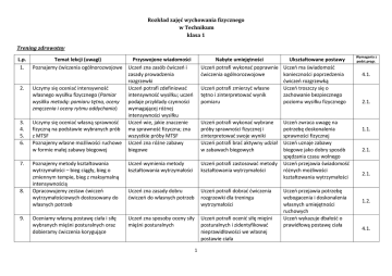 Rozkład zajęć wychowania fizycznego w Technikum klasa 1 Trening zdrowotny L.p. 1. 2. 3. 4. 5. 6. 7. 8. 9. Temat lekcji (uwagi) Poznajemy ćwiczenia ogólnorozwojowe Przyswojone wiadomości Uczeń zna zasób ćwiczeń i zasady prowadzenia rozgrzewki Uczeń potrafi zdefiniować intensywność wysiłku; uczeń podaje przykłady czynności wymagającej różnej intensywności wysiłku Uczeń wie, jakie znaczenie ma sprawność fizyczna; zna wszystkie próby MTSF Uczeń zna różne zabawy biegowe Nabyte umiejętności Ukształtowane postawy Uczeń potrafi wykonać poprawnie Uczeń ma świadomość ćwiczenia ogólnorozwojowe konieczności poprzedzenia ćwiczeń rozgrzewką Uczeń potrafi zmierzyć własne Uczeń troszczy się o tętno i zinterpretować wynik zachowanie bezpiecznego pomiaru poziomu wysiłku fizycznego Poznajemy metody kształtowania wytrzymałości – bieg ciągły, bieg o zmiennym tempie, bieg z maksymalną intensywnością Opracowujemy zestaw ćwiczeń wytrzymałościowych dostosowany do własnych potrzeb Uczeń wymienia metody kształtowania wytrzymałości Uczeń potrafi zastosować metody kształtowania wytrzymałości Uczeń zna zasady dobru ćwiczeń do własnych potrzeb Uczeń potrafi dobrać ćwiczenia rozgrzewki dla treningu wytrzymałości Oceniamy własną postawę ciała i siłę wybranych mięśni posturalnych oraz dobieramy ćwiczenia korygujące Uczeń zna sposoby oceny siły mięśni posturalnych Uczeń potrafi ocenić siłę mięśni posturalnych i zidentyfikować nieprawidłowości we własnej postawie ciała Uczymy się oceniać intensywność własnego wysiłku fizycznego (Pomiar wysiłku metodą: pomiaru tętna, oceny zmęczenia i oceny rytmu oddychania) Uczymy się oceniać własną sprawność fizyczną na podstawie wybranych prób z MTSF Poznajemy własne możliwości ruchowe w formie małej zabawy biegowej Uczeń potrafi wykonać wybrane próby sprawności fizycznej i zinterpretować swoje wyniki Uczeń potrafi brać aktywny udział w zabawach biegowych 1 Uczeń zwraca uwagę na potrzebę doskonalenia sprawności fizycznej Uczeń uznaje zabawy biegowe jako dobry sposób spędzania czasu wolnego Uczeń przejawia świadomość różnych możliwości kształtowania wytrzymałości Uczeń przejawia potrzebę wzbogacenia i doskonalenia własnych umiejętności ruchowych Uczeń wykazuje dbałość o prawidłową postawę ciała Wymagania z podst.progr. 4.1. 2.1. 1.1. 2.1. 2.1. 1.2. 4.1. 10. 11. 12. 13. 14. 15. 16. 17. 18. Poznajemy nieprawidłowe wzorce ruchowe oraz pozycje wadliwe i poprawne mające wpływ na wady postawy ciała Poznajemy ćwiczenia rozciągające i zwiększające ruchomość kręgosłupa Uczeń opisuje wady postawy ciała i omawia konsekwencje nieprawidłowych wzorców ruchowych Uczeń zna techniki wykonywania ćwiczeń rozciągających Poznajemy ćwiczenia rozciągające mięśnie klatki piersiowej i zwiększające ruchomość w stawach barkowych Uczeń zna techniki wykonywania ćwiczeń rozciągających Poznajemy zasób ćwiczeń wzmacniających mięśnie ściągające łopatki Poznajemy ćwiczenia rozciągające mięśnie przykurczone pasa biodrowego i nóg Poznajemy ćwiczenia oddechowe, pozwalające na odprężenie psychiczne i zmniejszenie napięcia mięśni szkieletowych Poznajemy zasób ćwiczeń wzmacniających mięśnie obręczy barkowej i ramion Poznajemy zasób ćwiczeń wzmacniających mięśnie nóg Poznajemy zasób ćwiczeń wzmacniających mięśnie brzucha Uczeń potrafi w sposób prawidłowy: usiąść, stać i podnieść ciężar Uczeń unika nieprawidłowych postaw i wzorców ruchowych Uczeń potrafi wykonać ćwiczenia rozciągające i zwiększające ruchomość kręgosłupa Uczeń przejawia świadomość konieczności wykonywania ćwiczeń rozciągających i ich wpływu na własny organizm Uczeń przejawia świadomość konieczności wykonywania ćwiczeń rozciągających i ich wpływu na własny organizm Uczeń przejawia świadomość i dbałość o własną postawę ciała Uczeń przejawia świadomość konieczności wykonywania ćwiczeń rozciągających i ich wpływu na własny organizm Uczeń wykazuje dbałość o należyty stan psychiczny swojego organizmu Uczeń potrafi wykonać ćwiczenia rozciągające mięśnie klatki piersiowej i zwiększające ruchomość w stawach barkowych Uczeń zna ćwiczenia Uczeń potrafi wykonać wzmacniających mięśnie wzmacniających mięśnie ściągające łopatki ściągające łopatki Uczeń zna techniki Uczeń potrafi wykonać ćwiczenia wykonywania ćwiczeń rozciągające mięśnie rozciągających przykurczone pasa biodrowego i nóg Uczeń zna ćwiczenia Uczeń potrafi wykonać ćwiczenia oddechowe i wie kiedy należy oddechowe je zastosować Uczeń opisuje ćwiczenia wzmacniające mięśnie obręczy barkowej i ramion Uczeń opisuje ćwiczenia wzmacniające mięśnie nóg Uczeń umie wykonać ćwiczenia wzmacniające mięśnie obręczy barkowej i ramion Uczeń umie wykonać ćwiczenia wzmacniające mięśnie nóg Uczeń przejawia świadomość potrzeby dbałości o własne ciało Uczeń przejawia świadomość potrzeby dbałości o własne ciało Uczeń zna ćwiczenia wzmacniających mięśnie brzucha Uczeń potrafi wykonać wzmacniających mięśnie brzucha Uczeń przejawia świadomość i dbałość o własną postawę ciała 2 4.1. 4.1. 4.1. 4.1. 4.1. 2.4. 4.1. 4.1. 4.1. 19. 20. Poznajemy zasób ćwiczeń wzmacniających mięśnie grzbietu Poznajemy ćwiczenia stretchingu 21. 22. Wzmacniamy siłę wybranych grup mięśniowych podczas ćwiczeń przy muzyce 23. Poznajemy ćwiczenia przy muzyce kształtujące gibkość zwracając uwagę na estetykę ruchu Poznajemy ćwiczenia kształtujące koordynację ruchową w formie ćwiczeń przy muzyce Poznajemy zasób ćwiczeń relaksacyjnych 24. 25. 26. 27. 28. 29. Tworzymy ogólnorozwojowy tor przeszkód Poznajemy zasady treningu stacyjnego w formie ćwiczeń na siłowni Określamy rozwój sprawności fizycznej w pierwszej
