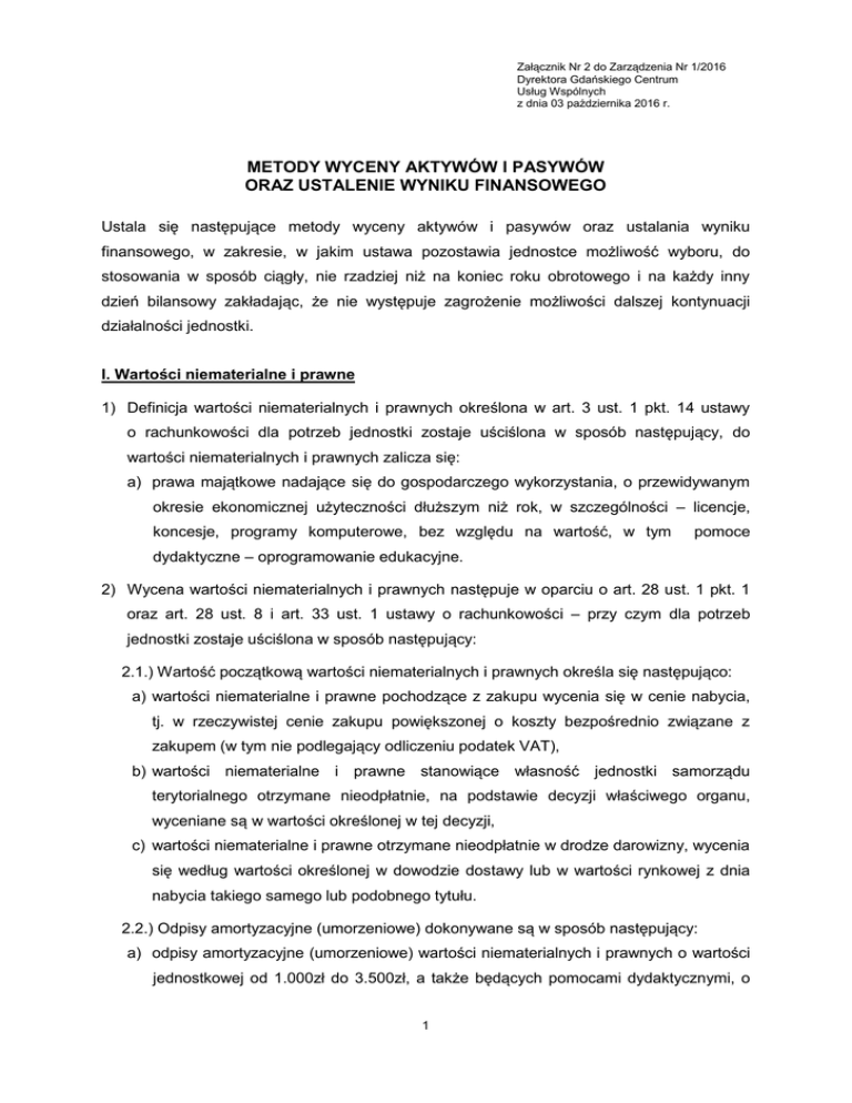 Załącznik Nr 2 do Zarządzenia Nr 1/2016 Dyrektora Gdańskiego Centrum Usług Wspólnych z dnia 03 października 2016 r. METODY WYCENY AKTYWÓW I PASYWÓW ORAZ USTALENIE WYNIKU FINANSOWEGO Ustala się następujące metody wyceny aktywów i pasywów oraz ustalania wyniku finansowego, w zakresie, w jakim ustawa pozostawia jednostce możliwość wyboru, do stosowania w sposób ciągły, nie rzadziej niż na koniec roku obrotowego i na każdy inny dzień bilansowy zakładając, że nie występuje zagrożenie możliwości dalszej kontynuacji działalności jednostki. I. Wartości niematerialne i prawne 1) Definicja wartości niematerialnych i prawnych określona w art. 3 ust. 1 pkt. 14 ustawy o rachunkowości dla potrzeb jednostki zostaje uściślona w sposób następujący, do wartości niematerialnych i prawnych zalicza się: a) prawa majątkowe nadające się do gospodarczego wykorzystania, o przewidywanym okresie ekonomicznej użyteczności dłuższym niż rok, w szczególności – licencje, koncesje, programy komputerowe, bez względu na wartość, w tym pomoce dydaktyczne – oprogramowanie edukacyjne. 2) Wycena wartości niematerialnych i prawnych następuje w oparciu o art. 28 ust. 1 pkt. 1 oraz art. 28 ust. 8 i art. 33 ust. 1 ustawy o rachunkowości – przy czym dla potrzeb jednostki zostaje uściślona w sposób następujący: 2.1.) Wartość początkową wartości niematerialnych i prawnych określa się następująco: a) wartości niematerialne i prawne pochodzące z zakupu wycenia się w cenie nabycia, tj. w rzeczywistej cenie zakupu powiększonej o koszty bezpośrednio związane z zakupem (w tym nie podlegający odliczeniu podatek VAT), b) wartości niematerialne i prawne stanowiące własność jednostki samorządu terytorialnego otrzymane nieodpłatnie, na podstawie decyzji właściwego organu, wyceniane są w wartości określonej w tej decyzji, c) wartości niematerialne i prawne otrzymane nieodpłatnie w drodze darowizny, wycenia się według wartości określonej w dowodzie dostawy lub w wartości rynkowej z dnia nabycia takiego samego lub podobnego tytułu. 2.2.) Odpisy amortyzacyjne (umorzeniowe) dokonywane są w sposób następujący: a) odpisy amortyzacyjne (umorzeniowe) wartości niematerialnych i prawnych o wartości jednostkowej od 1.000zł do 3.500zł, a także będących pomocami dydaktycznymi, o 1 Załącznik Nr 2 do Zarządzenia Nr 1/2016 Dyrektora Gdańskiego Centrum Usług Wspólnych z dnia 03 października 2016 r. wartości początkowej powyżej 1.000zł, dokonywane są jednorazowo w koszty bieżącej działalności operacyjnej w chwili wydania tytułu do użytkowania, b) odpisy amortyzacyjne (umorzeniowe) wartości niematerialnych i prawnych o wartości jednostkowej przekraczającej wartość 3.500zł (poza pomocami dydaktycznymi), dokonywane są w czasie, metodą liniową, przy czym dla każdego tytułu wartości niematerialnych i prawnych określa się indywidualnie okres amortyzacji, lecz nie może on być krótszy niż: od licencji (sublicencji) na programy komputerowe oraz od praw autorskich – 24 miesiące, od pozostałych wartości niematerialnych i prawnych – 60 miesięcy. Odpisów amortyzacyjnych (umorzeniowych) dokonuje się począwszy od pierwszego miesiąca następującego po miesiącu, w którym wartości niematerialne i prawne zostały przyjęte do używania, do końca tego miesiąca, w którym następuje zrównanie sumy odpisów amortyzacyjnych z ich wartością początkową lub w którym przeznaczone zostały do likwidacji, sprzedaży lub stwierdzono ich niedobór. 3) Ewidencja szczegółowa dla objętych ewidencją księgową wartości niematerialnych i prawnych umożliwia ustalenie umorzenia oddzielnie dla poszczególnych tytułów wartości niematerialnych i prawnych. 4) Wartości niematerialne i prawne nie podlegają ulepszeniu, co oznacza, że nie można zwiększać ich wartości początkowej. Wszelkie aktualizacje oprogramowania (licencji) będącego wartościami niematerialnymi i prawnymi podlegają odniesieniu bezpośrednio w koszty jednostki. 5) W sprawozdaniu finansowym wartości niematerialne i prawne wykazywane są w wartości netto tj. wartość początkowa pomniejszona o dotychczasowe umorzenie. II. Środki trwałe 1) Definicja środków trwałych określona w art. 3 ust. 1 pkt. 15 ustawy o rachunkowości dla potrzeb jednostki zostaje rozszerzona i uściślona w sposób następujący - do środków trwałych zalicza się rzeczowe aktywa trwałe o przewidywanym okresie ekonomicznej użyteczności dłużej niż 1 rok, kompletne, zdatne do użytku i przeznaczone na potrzeby jednostki: a) środki trwałe o wartości jednostkowej przekraczającej 1.000,- zł, w tym pomoce dydaktyczne, b) książki i zbiory biblioteczne, 2 Załącznik Nr 2 do Zarządzenia Nr 1/2016 Dyrektora Gdańskiego Centrum Usług Wspólnych z dnia 03 października 2016 r. c) środki trwałe wyspecyfikowane w załączniku nr 6. Nabyte aktywa rzeczowe o okresie użytkowania ponad rok, o wartości niższej niż 1.000,zł, za wyjątkiem środków trwałych wyspecyfikowanych w załączniku nr 6 oraz książek i zbiorów bibliotecznych, odnosi się w miesiącu nabycia bezpośrednio w koszty bieżącej działalności operacyjnej jako wartość zużytych materiałów. 2) Wycena środków trwałych następuje w oparciu o art. 28 ust. 1 pkt. 1 oraz art. 28 ust. 8 i art. 32 – 33 ustawy o rachunkowości, przy czym dla potrzeb jednostki zostaje uściślona w sposób następujący: 2.1.) Wartość początkową środków trwałych określa się następująco: a) środki trwałe pochodzące z zakupu wycenia się w cenie nabycia, a więc w rzeczywistej cenie zakupu powiększonej o koszty bezpośrednio związane z zakupem (w tym nie podlegający odliczeniu VAT), b) środki trwałe stanowiące własność jednostki samorządu terytorialnego otrzymane nieodpłatnie, na podstawie decyzji właściwego organu, wyceniane są w wartości określonej w tej decyzji, c) środki trw