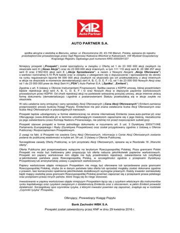 AUTO PARTNER S.A. spółka akcyjna z siedzibą w Bieruniu, adres: ul. Ekonomiczna 20, 43-150 Bieruń, Polska, wpisana do rejestru przedsiębiorców prowadzonego przez Sąd Rejonowy Katowice-Wschód w Katowicach, VIII Wydział Gospodarczy Krajowego Rejestru Sądowego pod numerem KRS 0000291327 Niniejszy prospekt („Prospekt”) został sporządzony w związku z Ofertą od 1 do 23 000 000 akcji zwykłych na okaziciela serii H („Nowe Akcje”) oraz do 23 000 000 akcji imiennych, w tym 111 110 akcji serii B, 20 386 257 akcji serii D oraz 2 502 633 akcji serii E („Akcje Sprzedawane”, a razem z Nowymi Akcjami „Akcje Oferowane”) o wartości nominalnej 0,10 PLN każda oraz w związku z ubieganiem się o dopuszczenie i wprowadzenie do obrotu na rynku regulowanym łącznie 94 000 000 akcji zwykłych na okaziciela (po ich przekształceniu z akcji imiennych w akcje na okaziciela w momencie dematerializacji) serii A, B, C, D, E, F i G, od 1 do 23 000 000 Nowych Akcji oraz od 1 do 23 000 000 praw do Akcji Serii H („PDA”) Auto Partner S.A. („Spółka”, „Emitent”). Zgodnie z art. 5 Ustawy o Obrocie Instrumentami Finansowymi, Spółka zawrze z KDPW umowę, której przedmiotem będzie rejestracja akcji serii A, B, C, D, E, F i G oraz Nowych Akcji w depozycie papierów wartościowych prowadzonym przez KDPW. Od chwili rejestracji akcji na podstawie wskazanej powyżej umowy, akcje imienne utracą formę dokumentu (dematerializacja) i zgodnie z postanowieniami Statutu przekształcą się w akcje zwykłe na okaziciela. W celu ustalenia ceny emisyjnej i ceny sprzedaży Akcji Oferowanych („Cena Akcji Oferowanych”) Emitent zamierza przeprowadzić proces budowy Księgi Popytu. Emitentowi nie jest znana ostateczna liczba Akcji Oferowanych oraz liczba Akcji Oferowanych w poszczególnych transzach. Prospekt będzie udostępniony w formie elektronicznej na stronie internetowej Emitenta (www.auto-partner.pl) oraz Oferującego (www.dmbzwbk.pl) w terminie umożliwiającym inwestorom zapoznanie się z jego treścią, niezwłocznie po jego zatwierdzeniu przez Komisję Nadzoru Finansowego, nie później niż przed rozpoczęciem subskrypcji. Prospekt stanowi prospekt w formie jednolitego dokumentu w rozumieniu art. 5 ust. 3 Dyrektywy 2003/71/WE Parlamentu Europejskiego i Rady (Dyrektywa Prospektowa) oraz został przygotowany zgodnie z Ustawą o Ofercie Publicznej i Rozporządzeniem Prospektowym. Z uwagi na fakt, iż Prospekt nie zawiera Ceny Akcji Oferowanych, informacja o Cenie Akcji Oferowanych zostanie podana do publicznej wiadomości w trybie art. 54 ust. 3 Ustawy o Ofercie Publicznej. Szczegółowe zasady Oferty Publicznej, w tym przydziału Akcji Oferowanych, opisane są w Rozdziale 16 „Warunki oferty”. Oferta Publiczna jest przeprowadzana wyłącznie na terytorium Rzeczypospolitej Polskiej. Poza granicami Polski Prospekt nie może być traktowany jako propozycja lub oferta nabycia jakichkolwiek papierów wartościowych. Prospekt ani papiery wartościowe nim objęte nie były przedmiotem rejestracji, zatwierdzenia lub notyfikacji w jakimkolwiek państwie poza Rzecząpospolitą Polską, w szczególności zgodnie z przepisami Dyrektywy Prospektowej lub amerykańskiej ustawy o papierach wartościowych. Papiery wartościowe objęte niniejszym Prospektem nie mogą być oferowane lub sprzedawane poza granicami Rzeczypospolitej Polskiej, chyba że w danym państwie taka oferta lub sprzedaż mogłaby zostać dokonana zgodnie z prawem, bez konieczności spełnienia jakichkolwiek dodatkowych wymogów prawnych. Każdy inwestor zamieszkały bądź mający siedzibę poza granicami Rzeczypospolitej Polskiej powinien zapoznać się z przepisami prawa polskiego oraz przepisami prawa innych państw, które mogą się do niego stosować. Inwestowanie w papiery wartościowe objęte niniejszym Prospektem łączy się z ryzykiem właściwym dla instrumentów rynku kapitałowego oraz ryzykiem związanym z działalnością Emitenta oraz z otoczeniem, w jakim Emitent prowadzi działalność. Szczegółowy opis czynników ryzyka, z którymi inwestor powinien się zapoznać, znajduje się w rozdziale „Czynniki ryzyka” Prospektu. Oferujący, Prowadzący Księgę Popytu Bank Zachodni WBK S.A. Prospekt został zatwierdzony przez KNF w dniu 29 kwietnia 2016 r. SPIS TREŚCI SPIS TREŚCI 1. PODSUMOWANIE .............................................................................................................................. 5 2. CZYNNIKI RYZYKA .......................................................................................................................... 32 2.1. Czynniki ryzyka związane z otoczeniem, w jakim Grupa prowadzi działalność .................. 32 2.2. Czynniki ryzyka związane z działalnością Grupy................................................................. 35 2.3. Czynniki ryzyka związane ze strukturą akcjonariatu, Ofertą oraz Akcjami .......................... 40 3. WYKORZYSTANIE WPŁYWÓW Z OFERTY ................................................................................... 51 3.1. Oczekiwana wartość wpływów z Oferty ............................................................................... 51 3.2. Wykorzystanie wpływów z Oferty......................................................................................... 51 4. POLITYKA DYWIDENDY.................................................................................................................. 54 4.1. Zasady polityki Emitenta dotyczącej wypłaty dywidendy oraz wszelkie ograniczenia w tym zakresie...................................................................................................................... 54 4.2. Wartość dywidendy na akcję za każdy rok obrotowy okresu objętego Historycznymi Informacjami Finansowymi................................................................................................... 54 5. KAPITALIZACJA I ZADŁUŻENIE........................................