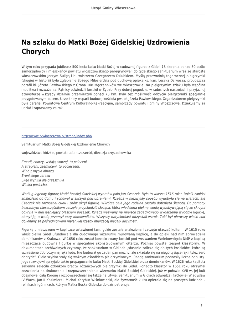 Urząd Gminy Włoszczowa Na szlaku do Matki Bożej Gidelskiej Uzdrowienia Chorych W tym roku przypada Jubileusz 500-lecia kultu Matki Bożej w cudownej figurce z Gidel. 18 sierpnia ponad 30 osób: samorządowcy i mieszkańcy powiatu włoszczowskiego peregrynowali do gidelskiego sanktuarium wraz ze starostą włoszczowskim Jerzym Suligą i burmistrzem Grzegorzem Dziubkiem. Myślą przewodnią tegorocznej pielgrzymki (drugiej w historii) było zgłębianie Bożego Miłosierdzia pod duchową opieką ks. kan. Leszka Dziwosza, proboszcza parafii bł. Józefa Pawłowskiego z Grona 108 Męczenników we Włoszczowie. Na pielgrzymim szlaku była wspólna modlitwa i rozważania. Pątnicy odwiedzili kościół w Żytnie. Przy dobrej pogodzie, w radosnych nastrojach i przyjaznej atmosferze wszyscy dzielnie przemierzyli ponad 70 km. Była też możliwość odbycia pielgrzymki specjalnie przygotowanym busem. Uczestnicy wsparli budowę kościoła pw. bł. Józefa Pawłowskiego. Organizatorem pielgrzymki była parafia, Powiatowe Centrum Kulturalno-Rekreacyjne, samorządy powiatu i gminy Włoszczowa. Dziękujemy za udział i zapraszamy za rok. http://www.tvwloszczowa.pl/strona/index.php Sanktuarium Matki Bożej Gidelskiej Uzdrowienie Chorych województwo łódzkie, powiat radomszczański, diecezja częstochowska Zmarli, chorzy, wstają skorzej, tu poleceni A strapieni, zasmuceni, tu pocieszeni. Wino z mycia obrazu, Broni złego zarazu Skąd wynika dla grzesznika Wielka pociecha. Według legendy figurkę Matki Boskiej Gidelskiej wyorał w polu Jan Czeczek. Było to wiosną 1516 roku. Rolnik zaniósł znalezisko do domu i schował w skrzyni pod ubraniami. Rzeźba w niezwykły sposób wydobyła się na wierzch, ale Czeczek nie rozpoznał cudu i znów ukrył figurkę. Wkrótce cała jego rodzina została dotknięta ślepotą. Do pomocy bezradnym nieszczęśnikom zaczęła przychodzić służąca, która wiedziona piękną wonią wydobywającą się ze skrzyni odkryła w niej jaśniejący blaskiem posążek. Ksiądz wezwany na miejsce zagadkowego wydarzenia wydobył figurkę, obmył ją, a wodą przemył oczy domowników. Wszyscy natychmiast odzyskali wzrok. Taki był pierwszy wielki cud dokonany za pośrednictwem maleńkiej rzeźby mierzącej niecały decymetr. Figurkę umieszczono w kapliczce ustawionej tam, gdzie została znaleziona i zaczęto otaczać kultem. W 1615 roku właścicielka Gidel ufundowała dla cudownego wizerunku murowaną kaplicę, a do opieki nad nim sprowadziła dominikanów z Krakowa. W 1656 roku został konsekrowany kościół pod wezwaniem Wniebowzięcia NMP z kaplicą mieszcząca cudowną figurkę w specjalnie skonstruowanym ołtarzu. Później powstał zespół klasztorny. W dokumentach archiwalnych czytamy, że sanktuarium w Gidlach „słusznie zalicza się do tych kościołów, które są wzniesione dobroczynną ręką ludu. Nie budował go żaden pan możny, ale składało się na niego tysiące rąk i tyleż serc dobrych”. Gidle szybko stały się ważnym ośrodkiem pielgrzymkowym. Rangę sanktuarium podnosiły liczne odpusty. Jego rozwojowi sprzyjało także propagowanie kultu Matki Boskiej Gidelskiej przez dominikanów. W 1626 roku kapituła zakonna zaleciła członkom bractw różańcowych pielgrzymki do Gidel. Ponadto klasztor w 1651 roku otrzymał zezwolenia na drukowanie i rozpowszechnianie wizerunku Matki Boskiej Gidelskiej. Już w połowie XVII w. jej kult obejmował całą Koronę i rozpowszechniał się także na Litwie. Sanktuarium w Gidlach odwiedzali królowie- Władysław IV Waza, Jan II Kazimierz i Michał Korybut Wiśniowiecki, ale żywotność kultu opierała się na prostych ludziach – rolnikach i górnikach, którym Matka Boska Gidelska do dziś patronuje. 1 Urząd Gminy Włoszczowa Sława Gidel wzrastała z roku na rok, a „Księgi cudów” zapełniały się wciąż nowymi wpisami. W 1561 roku zanotowano: „We wsi Rudzie niedaleko Gidel, chłopiec trzy lata mający, syn Pawła Gawina kmiecia, spadłszy z dachu nieżywy znaleziony został; lecz ofiarowany przez rodziców i na to miejsce przyniesiony, po kilku godzinach przyszedł do życia. ”Największą popularnością sanktuarium gidelskie cieszyło się w XVII i XVIII w., wówczas zapisano najwięcej uzdrowień. O tym, że wiara czyni cuda można przekonać się także dziś – opiekunowie sanktuarium gromadzą ich świadectwa. Wiele uzdrowień w Gidlach dokonuje się za pośrednictwem wina poświęconego podczas obrzędu nazywanego „Kąpiółką”. Rytuał ten, praktykowany od 1618 roku, polega na zanurzeniu w poświęconym winie figurki wyjętej z ołtarza. „Kapiółka” nawiązuje do pierwszego obmycia rzeźby wyoranej z ziemi oraz do pierwszego cudu i odbywa się w pierwszą niedzielę maja. Co roku obrzęd przyciąga wielu wiernych, którzy ufają w to, że kropla wina dodana do szczerej wiary w Bożą moc, pomoże im odzyskać zdrowie. Ruch pątniczy w Gidlach związany był w dużej mierze z pielgrzymkami do położonej niedaleko Częstochowy. Sanktuarium także i dziś jest przystankiem w drodze na Jasną Górę. Ponadto do Gidel przybywa wiele grup pątniczych ze Śląska. Główne uroczystości w sanktuarium gromadzące wielu pielgrzymów odbywają się w pierwszą niedzielę maja („Kąpiółka”) oraz w święta: Wniebowzięcia NMP (15 sierpnia), św. Jacka (pierwsza i druga niedziela po 17 sierpnia) i Matki Boskiej Różańcowej (pierwsza niedziela października). Jak dotąd najwięcej pątników, przybyło do Gidel na koronację wizerunku, która odbyła się 19 sierpnia 1923 roku. Uroczystość, która miała niezwykle bogatą oprawę, zgromadziła 300 tys. wiernych. W opisie koronacji czytamy: „Już w przeddzień uroczystości, tj. w sobotę panował ożywiony ruch na ulicach gidelskich. Zdążyło przybyć parę kompanij. Przybyły w sobotę dwa oddziały Straży Ogniowej z Radomska, które zorganizowały pogotowie strażackie i zbudowały namiot obok ołtarza polowego, 