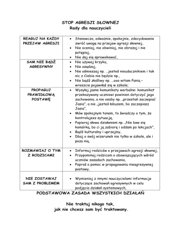 STOP AGRESJI SŁOWNEJ Rady dla nauczycieli REAGUJ NA KAŻDY PRZEJAW AGRESJI SAM NIE BĄDŹ AGRESYWNY PROPAGUJ PRAWIDŁOWĄ POSTAWĘ ROZMAWIAJ O TYM Z RODZICAMI NIE ZOSTAWAJ SAM Z PROBLEMEM Stanowczo, odważnie, spokojnie, zdecydowanie zwróć uwagę na przejaw agresji słownej, Nie oceniaj, nie obwiniaj, nie obrażaj i nie potępiaj, Nie daj się sprowokować, Nie używaj krzyku, Nie osądzaj, Nie ośmieszaj np. …jesteś nieudacznikiem i tak nic z Ciebie nie będzie np., Nie bądź złośliwy np. …ooo witam Panią – wreszcie pojawiłaś się w szkole; Wysyłaj jasne komunikaty werbalne: komunikat przekazywany uczniowi powinien dotyczyć jego zachowania, a nie osoby np. „przestań zaczepiać Jasia”, a nie „jesteś łobuzem, bo zaczepiasz Jasia”, Mów spokojnym tonem, to świadczy o tym, że kontrolujesz sytuację, Popieraj słowa działaniem np. „Nie baw się komórką, bo ci ją zabiorę i oddam po lekcjach”, Bądź kulturalny i uprzejmy, Dbaj o swój wizerunek nie tylko w szkole, ale i poza nią, Informuj rodziców o przejawach agresji słownej, Przypominaj rodzicom o obowiązujących wśród uczniów zasadach zachowania, Poproś o pomoc w propagowaniu nieagresywnej postawy, Wymieniaj z innymi nauczycielami informacje dotyczące zachowań agresywnych w celu podjęcia działań systemowych, PODSTAWOWA ZASADA WSZYSTKICH DZIAŁAŃ Nie traktuj nikogo tak, jak nie chcesz sam być traktowany.