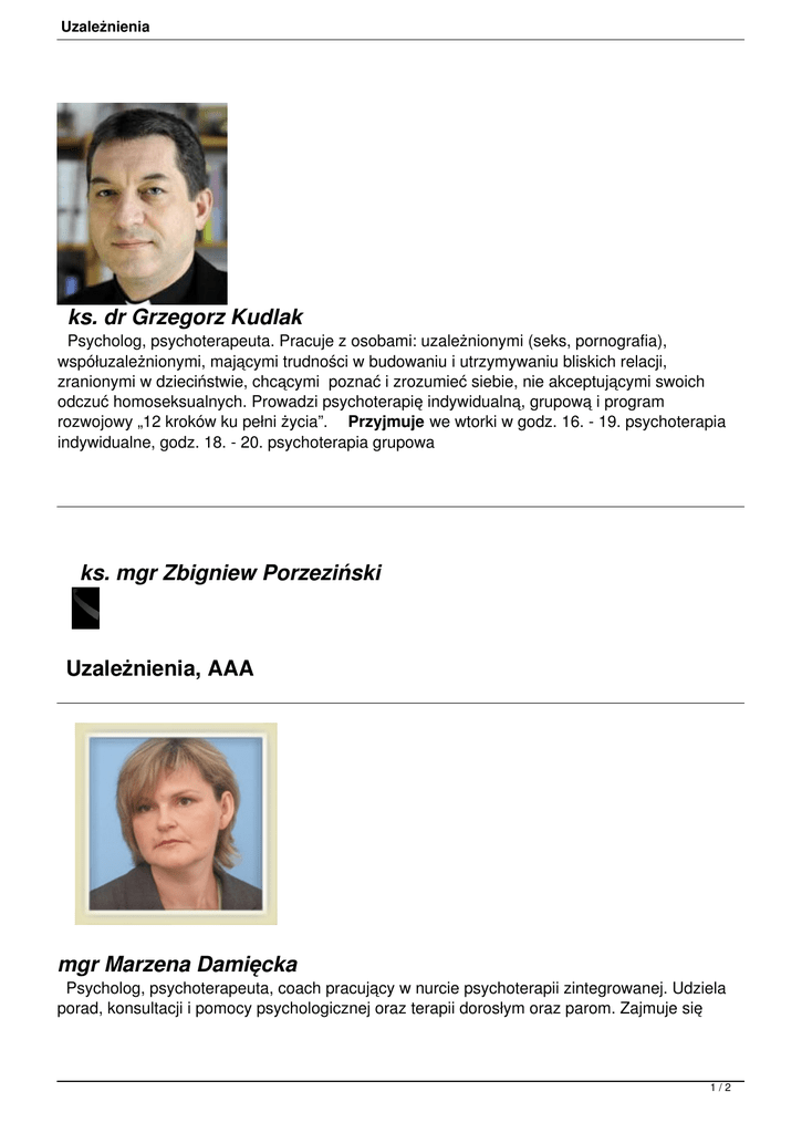 Uzależnienia ks. dr Grzegorz Kudlak Psycholog, psychoterapeuta. Pracuje z osobami: uzależnionymi (seks, pornografia), współuzależnionymi, mającymi trudności w budowaniu i utrzymywaniu bliskich relacji, zranionymi w dzieciństwie, chcącymi poznać i zrozumieć siebie, nie akceptującymi swoich odczuć homoseksualnych. Prowadzi psychoterapię indywidualną, grupową i program rozwojowy „12 kroków ku pełni życia”. Przyjmuje we wtorki w godz. 16. - 19. psychoterapia indywidualne, godz. 18. - 20. psychoterapia grupowa ks. mgr Zbigniew Porzeziński Uzależnienia, AAA mgr Marzena Damięcka Psycholog, psychoterapeuta, coach pracujący w nurcie psychoterapii zintegrowanej. Udziela porad, konsultacji i pomocy psychologicznej oraz terapii dorosłym oraz parom. Zajmuje się 1/2 Uzależnienia zaburzeniami lękowymi, obsesyjno-kompulsywnymi, depresjami, zaburzeniami osobowości, współuzależnieniami i DDA, problemy z własna tożsamością oraz budowaniem trwałych i satysfakcjonujących relacji, zespół lęku pourazowego, straty, fobie społeczne i dodatkowo coaching indywidualny, małżeński. Przyjmuje we wtorki w godz. 15. - 19 2/2