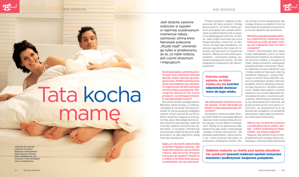 m oi r odz ic e m o i r o dzi ce Jeśli dziecko zastanie rodziców w sypialni w najmniej oczekiwanym momencie należy zachować zimną krew. Nerwowe polecenie „Wyjdź stąd!” utwierdzi go tylko w przekonaniu, że to, co robili rodzice, jest czymś strasznym i krępującym. Tata kocha mamę Jeśli dziecko nakryje rodziców na seksie, idealnym rozwiązaniem będą uśmiech i pytanie typu: obudziłeś się, już kochanie? Potem przyjdzie czas na wyjaśnienia. 9 4 • r o s s m a n n Do dziś pamiętam, jak bardzo przestraszył mnie, kilkuletnie wówczas dziecko, widok rodziców uprawiających seks. Podobno później przez wiele nocy budziłam się z płaczem. To wspomnienie do dziś wywołuje we mnie lekkie zawstydzenie. Dlaczego dla dziecka to tak mocne przeżycie i czy dzisiejsze kilkulatki zareagowałyby inaczej? Nie zawsze dziecko zareaguje lękiem. Wszystko zależy od tego, co zobaczy, i jak będzie to rozumiało. Dzisiejsze kilkulatki nie różnią się pod tym względem istotnie od tych sprzed 20 czy 40 lat. Dzieci wrażliwie reagują na emocje, mimikę, gesty. Dla małego dziecka widok stosunku seksualnego rodziców może być zupełnie niezrozumiały, będzie pytać, co się dzieje, zinterpretuje sytuację jako zwykłe przytulanie albo przeciwnie, np. jako zagrożenie, wtedy może być wystraszone. Sądzę, że i dla moich rodziców była to bardzo krępująca sytuacja. Jak właściwie powinni się zachować rodzice, gdy pociecha wtargnie znienacka do sypialni? (chodzi tu o reakcje w tej konkretnej sytuacji, co powiedzieć, jak się zachować). Przede wszystkim, najlepiej nie dopuszczać do takiej sytuacji. Istnieją pewne granice i te chwile rodzice powinni przeżywać bez udziału dzieci. Jeżeli już jednak dziecko trafi w sypialni na współżyjących rodziców, to ważne, żeby mogło zachować poczucie bezpieczeństwa, zrozumieć, że zdarzenie, którego było świadkiem, nie stanowi zagrożenia dla niego ani rodziców, jest wyrazem ich wzajemnej bliskości. Ważny jest komunikat pozawerbalny – zachowanie spokoju, pokazanie pozytywnych emocji, zamiast reagowania niepokojem lub zdenerwowaniem. Dziecko zadaje pytania, na które należą mu się uczciwe odpowiedzi dostosowane do jego wieku. Jak wytłumaczyć maluchowi w prosty sposób, co tak naprawdę się działo? A może lepiej pominąć milczeniem? Zachowanie milczenia wobec dziecka, które ewidentnie przeżywa odkrycie rodziców w tak niezrozumiałej dla siebie sytuacji, nie jest dobrym rozwiązaniem. Należy mu to wytłumaczyć adekwatnie do jego wieku rozwojowego i wiedzy na temat seksualności. Dla kilkulatka stwierdzenie: rodzice kochali się – może oznaczać tyle samo, co przytulanie, okazywanie czułości. Sło- wa zresztą nie są tu najważniejsze, dla małego dziecka szczególnie liczy się komunikat emocjonalny oraz poczucie, że nie jest zbywane lub oszukiwane. Muszą być sposoby oswajania dziecka z intymnością, erotyzmem najbliższych mu osób, ale jakie? I kiedy jest najlepszy czas na takie oswajanie? Faktem, który dorosłym jest często trudno zaakceptować, jest to, że nasza seksualność kształtuje się praktycznie od momentu urodzin, a na pewno od chwili, kiedy zaczynamy nawiązywać świadomy kontakt z otoczeniem. Dziecko stopniowo zaczyna odróżniać ojca i matkę, kobiety od mężczyzn, staje się świadome swojej płci, czerpie informacje na temat relacji damsko-męskich na podstawie związku rodziców, dziadków, których ekspresja seksualna staje się wzorem i punktem odniesienia. Zadaje także pytania, na które należą mu się uczciwe odpowiedzi dostosowane do wieku i rozumienia seksualności. Zahamowania rodziców stają się zahamowaniami dziecka, ale przekraczanie przez nich granic intymności, np. pozwalanie na to, by dziecko było świadkiem ich kontaktów seksualnych, także zaburza harmonijny rozwój psychoseksualny. Zdarza się, że dziecko przynosi z przedszkola lub ze szkoły „wiedzę” o seksie zasłyszaną od rówieśników. Jak wtedy reagować? Najlepiej, żeby dziecko miało już wtedy adekwatną do swojego okresu rozwojowego, rzetelną wiedzę wyniesioną Oddanie malucha na chwilę pod opiekę dziadków lub opiekunki pozwoli rodzicom spełnić erotyczne marzenia i podtrzymać wzajemne pożądanie. r o s s m a n n • 95