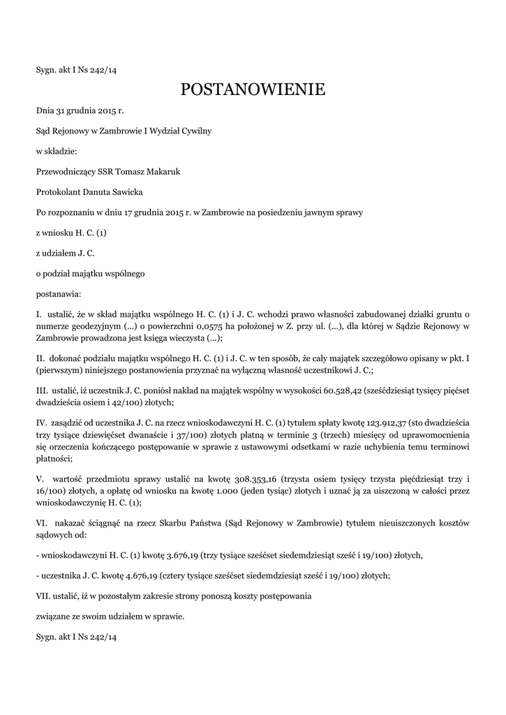 Sygn. akt I Ns 242/14 POSTANOWIENIE Dnia 31 grudnia 2015 r. Sąd Rejonowy w Zambrowie I Wydział Cywilny w składzie: Przewodniczący SSR Tomasz Makaruk Protokolant Danuta Sawicka Po rozpoznaniu w dniu 17 grudnia 2015 r. w Zambrowie na posiedzeniu jawnym sprawy z wniosku H. C. (1) z udziałem J. C. o podział majątku wspólnego postanawia: I. ustalić, że w skład majątku wspólnego H. C. (1) i J. C. wchodzi prawo własności zabudowanej działki gruntu o numerze geodezyjnym (...) o powierzchni 0,0575 ha położonej w Z. przy ul. (...), dla której w Sądzie Rejonowy w Zambrowie prowadzona jest księga wieczysta (...); II. dokonać podziału majątku wspólnego H. C. (1) i J. C. w ten sposób, że cały majątek szczegółowo opisany w pkt. I (pierwszym) niniejszego postanowienia przyznać na wyłączną własność uczestnikowi J. C.; III. ustalić, iż uczestnik J. C. poniósł nakład na majątek wspólny w wysokości 60.528,42 (sześćdziesiąt tysięcy pięćset dwadzieścia osiem i 42/100) złotych; IV. zasądzić od uczestnika J. C. na rzecz wnioskodawczyni H. C. (1) tytułem spłaty kwotę 123.912,37 (sto dwadzieścia trzy tysiące dziewięćset dwanaście i 37/100) złotych płatną w terminie 3 (trzech) miesięcy od uprawomocnienia się orzeczenia kończącego postępowanie w sprawie z ustawowymi odsetkami w razie uchybienia temu terminowi płatności; V. wartość przedmiotu sprawy ustalić na kwotę 308.353,16 (trzysta osiem tysięcy trzysta pięćdziesiąt trzy i 16/100) złotych, a opłatę od wniosku na kwotę 1.000 (jeden tysiąc) złotych i uznać ją za uiszczoną w całości przez wnioskodawczynię H. C. (1); VI. nakazać ściągnąć na rzecz Skarbu Państwa (Sąd Rejonowy w Zambrowie) tytułem nieuiszczonych kosztów sądowych od: - wnioskodawczyni H. C. (1) kwotę 3.676,19 (trzy tysiące sześćset siedemdziesiąt sześć i 19/100) złotych, - uczestnika J. C. kwotę 4.676,19 (cztery tysiące sześćset siedemdziesiąt sześć i 19/100) złotych; VII. ustalić, iż w pozostałym zakresie strony ponoszą koszty postępowania związane ze swoim udziałem w sprawie. Sygn. akt I Ns 242/14 UZASADNIENIE Wnioskodawczyni H. C. (1) wniosła o dokonanie podziału majątku wspólnego nabytego w trakcie małżeństwa z J. C., składającego się z zabudowanej działki gruntu oznaczonej numerem geodezyjnym (...) o powierzchni 0,0575 ha położonej w Z. przy ul. (...). Wskazała, iż z racji tego, że zamieszkuje poza granicami Polski, wnosi o przyznanie przedmiotowej nieruchomości na rzecz uczestnika ze spłatą na swoją rzecz. Uczestnik J. C. poparł, co do zasady wniosek i potwierdził, iż chce przyznania nieruchomości na swoją rzecz. Podniósł jednak, iż nieruchomość została nabyta za środki zgromadzone przez niego na koncie jeszcze przed zawarciem związku małżeńskiego. Domagał się także rozliczenia nakładów poczynionych na nieruchomość wspólną po ustaniu wspólności majątkowej w postaci: zakupu i montażu pieca centralnego ogrzewania, wykonania instalacji centralnego ogrzewania, wykończenia parteru budynku mieszkalnego, wykonania ogrodzenia nieruchomości, nasadzeń. Odnosząc się do stanowiska uczestnika wnioskodawczyni zakwestionowała jego twierdzenia, jakoby nabycie nieruchomości w stanie surowym nastąpiło za jego pieniądze – wskazała na treść aktu notarialnego, z którego wynika, iż nabycie nieruchomości następuje na zasadzie wspólności ustawowej małżeńskiej. Sąd ustalił i zważył, co następuje: Związek małżeński H. C. (2) z domu K. i J. C. zawarty w dniu 17 sierpnia 1995 roku w Urzędzie Stanu Cywilnego w R. został rozwiązany przez rozwód bez orzekania o winie wyrokiem Sądu Okręgowego w Łomży z dnia 22 lutego 2002 r.. Strony przez cały okres trwania małżeństwa obowiązywał ustrój ustawowej wspólności majątkowej. J. C. w 1992 r. wyjechał do Belgii i pracował na budowach. Przez cały okres pobytu za granicą otrzymywał mniej więcej takie samo wynagrodzenie miesięczne. Zaoszczędzone pieniądze przekazywał do Polski, dla siostry T. J., aby wpłacała je na jego konto w banku (...) S.A. Oddział w Z.. W 1993 r. poznał H. K. i zaprosił ją do siebie do Belgii. H. K. przyjechała do Belgii do J. C. w maju 1994 r. Wówczas J. C. na koncie w Polsce posiadał zgromadzone oszczędności w dolarach w kwocie 4.976,78. H. K. po przyjeździe do Belgii zamieszkała razem z J. C. w wynajmowanym mieszkaniu. Prowadzili oni wspólne gospodarstwo domowe, mieli wspólne pieniądze. O. też pracowali. Zaoszczędzone wspólnie pieniądze przekazywali do Polski, aby siostra J. C. wpłacała je na należące do niego konto. W dniu 17 sierpnia 1995 r. strony postępowania zawarły związek małżeński, po czym wróciły z powrotem do Belgii. H. K. przyjęła nazwisko męża – C.. W dniu 17 czerwca 1996 r. T. J., dysponując pełnomocnictwem od J. C. i H. C. (2), na podstawie aktu notarialnego sporządzonego przez notariusz S. M. (1), działając w imieniu i na rzecz małżonków C., nabyła za cenę 50.000 zł działkę gruntu oznaczoną numerem geodezyjnym (...) o powierzchni 0,0575 ha położoną w Z., zabudowaną jednorodzinnym domem mieszkalnym w stanie surowym zamkniętym. Akt notarialny zawiera oświadczenie pełnomocnika, iż nabycie nastąpiło na zasadzie wspólności ustawowej małżeńskiej mocodawców. Cena nabycia została pokryta ze środków zgromadzonych na rachunku dolarowym J. C.. Aktualna wartość nieruchomości według stanu z daty jej nabycia wynosi 224.179,33 zł, z czego kwota 60.528,42 zł stanowi majątek osobisty (uprzednio odrębny) J. C.. W czasie trwania wspólności majątkowej strony poniosły na przedmiotową nieruchomość nakłady w wysokości 84.173,83 zł. J. C. nie posiada umowy o pracę ani też wystarczających oszczędności. Na dokonanie spłaty ma zamiar zaciągnąć kredyt. H. C. (2) obecnie nosi nazwisko C.. Powyższy stan faktyczny Sąd ustalił w oparciu o: częścio