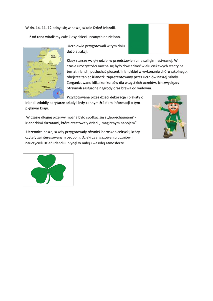 W dn. 14. 11. 12 odbył się w naszej szkole Dzień Irlandii. Już od rana witaliśmy całe klasy dzieci ubranych na zielono. Uczniowie przygotowali w tym dniu dużo atrakcji. Klasy starsze wzięły udział w przedstawieniu na sali gimnastycznej. W czasie uroczystości można się było dowiedzieć wielu ciekawych rzeczy na temat Irlandii, posłuchać piosenki irlandzkiej w wykonaniu chóru szkolnego, obejrzeć taniec irlandzki zaprezentowany przez uczniów naszej szkoły. Zorganizowano kilka konkursów dla wszystkich uczniów. Ich zwycięzcy otrzymali zasłużone nagrody oraz brawa od widowni. Przygotowane przez dzieci dekoracje i plakaty o Irlandii zdobiły korytarze szkoły i były cennym źródłem informacji o tym pięknym kraju. W czasie długiej przerwy można było spotkać się z „leprechaunami”irlandzkimi skrzatami, które częstowały dzieci „ magicznym napojem” . Uczennice naszej szkoły przygotowały również horoskop celtycki, który czytały zainteresowanym osobom. Dzięki zaangażowaniu uczniów i nauczycieli Dzień Irlandii upłynął w miłej i wesołej atmosferze.