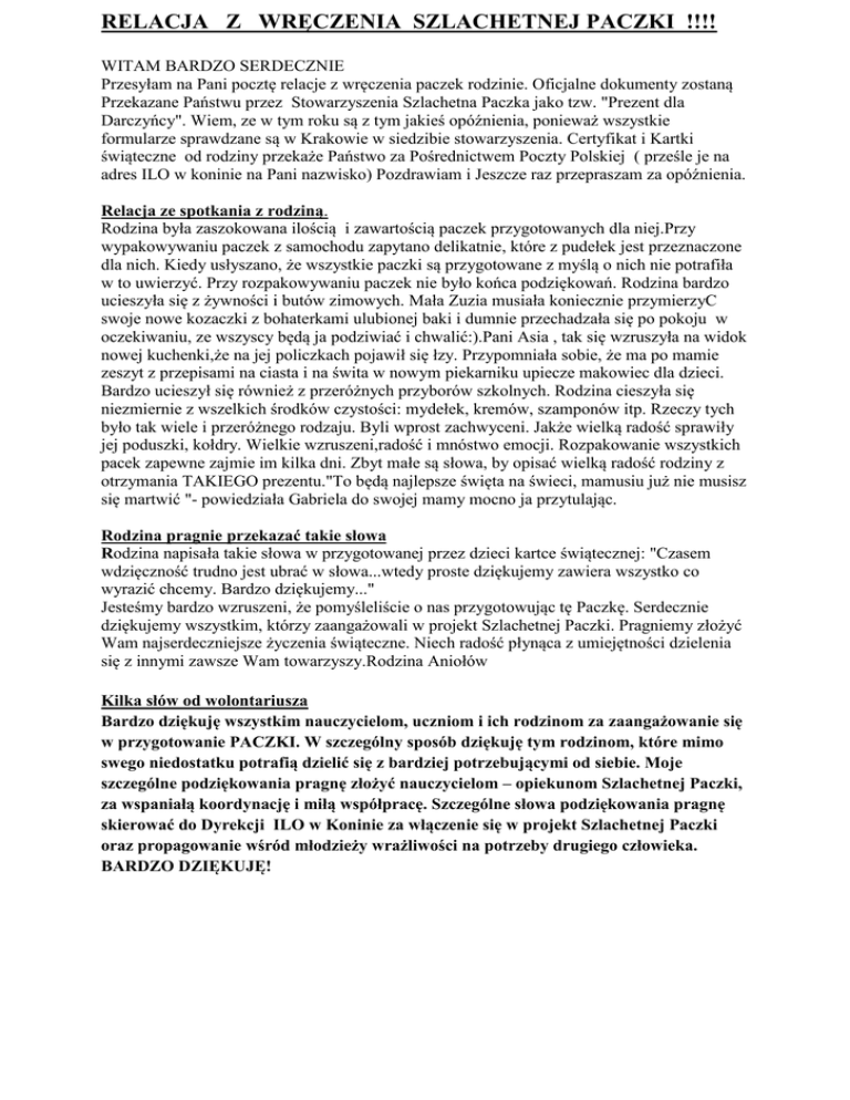RELACJA Z WRĘCZENIA SZLACHETNEJ PACZKI !!!! WITAM BARDZO SERDECZNIE Przesyłam na Pani pocztę relacje z wręczenia paczek rodzinie. Oficjalne dokumenty zostaną Przekazane Państwu przez Stowarzyszenia Szlachetna Paczka jako tzw. "Prezent dla Darczyńcy". Wiem, ze w tym roku są z tym jakieś opóźnienia, ponieważ wszystkie formularze sprawdzane są w Krakowie w siedzibie stowarzyszenia. Certyfikat i Kartki świąteczne od rodziny przekaże Państwo za Pośrednictwem Poczty Polskiej ( prześle je na adres ILO w koninie na Pani nazwisko) Pozdrawiam i Jeszcze raz przepraszam za opóźnienia. Relacja ze spotkania z rodziną. Rodzina była zaszokowana ilością i zawartością paczek przygotowanych dla niej.Przy wypakowywaniu paczek z samochodu zapytano delikatnie, które z pudełek jest przeznaczone dla nich. Kiedy usłyszano, że wszystkie paczki są przygotowane z myślą o nich nie potrafiła w to uwierzyć. Przy rozpakowywaniu paczek nie było końca podziękowań. Rodzina bardzo ucieszyła się z żywności i butów zimowych. Mała Zuzia musiała koniecznie przymierzyC swoje nowe kozaczki z bohaterkami ulubionej baki i dumnie przechadzała się po pokoju w oczekiwaniu, ze wszyscy będą ja podziwiać i chwalić:).Pani Asia , tak się wzruszyła na widok nowej kuchenki,że na jej policzkach pojawił się łzy. Przypomniała sobie, że ma po mamie zeszyt z przepisami na ciasta i na świta w nowym piekarniku upiecze makowiec dla dzieci. Bardzo ucieszył się również z przeróżnych przyborów szkolnych. Rodzina cieszyła się niezmiernie z wszelkich środków czystości: mydełek, kremów, szamponów itp. Rzeczy tych było tak wiele i przeróżnego rodzaju. Byli wprost zachwyceni. Jakże wielką radość sprawiły jej poduszki, kołdry. Wielkie wzruszeni,radość i mnóstwo emocji. Rozpakowanie wszystkich pacek zapewne zajmie im kilka dni. Zbyt małe są słowa, by opisać wielką radość rodziny z otrzymania TAKIEGO prezentu."To będą najlepsze święta na świeci, mamusiu już nie musisz się martwić "- powiedziała Gabriela do swojej mamy mocno ja przytulając. Rodzina pragnie przekazać takie słowa Rodzina napisała takie słowa w przygotowanej przez dzieci kartce świątecznej: "Czasem wdzięczność trudno jest ubrać w słowa...wtedy proste dziękujemy zawiera wszystko co wyrazić chcemy. Bardzo dziękujemy..." Jesteśmy bardzo wzruszeni, że pomyśleliście o nas przygotowując tę Paczkę. Serdecznie dziękujemy wszystkim, którzy zaangażowali w projekt Szlachetnej Paczki. Pragniemy złożyć Wam najserdeczniejsze życzenia świąteczne. Niech radość płynąca z umiejętności dzielenia się z innymi zawsze Wam towarzyszy.Rodzina Aniołów Kilka słów od wolontariusza Bardzo dziękuję wszystkim nauczycielom, uczniom i ich rodzinom za zaangażowanie się w przygotowanie PACZKI. W szczególny sposób dziękuję tym rodzinom, które mimo swego niedostatku potrafią dzielić się z bardziej potrzebującymi od siebie. Moje szczególne podziękowania pragnę złożyć nauczycielom – opiekunom Szlachetnej Paczki, za wspaniałą koordynację i miłą współpracę. Szczególne słowa podziękowania pragnę skierować do Dyrekcji ILO w Koninie za włączenie się w projekt Szlachetnej Paczki oraz propagowanie wśród młodzieży wrażliwości na potrzeby drugiego człowieka. BARDZO DZIĘKUJĘ!