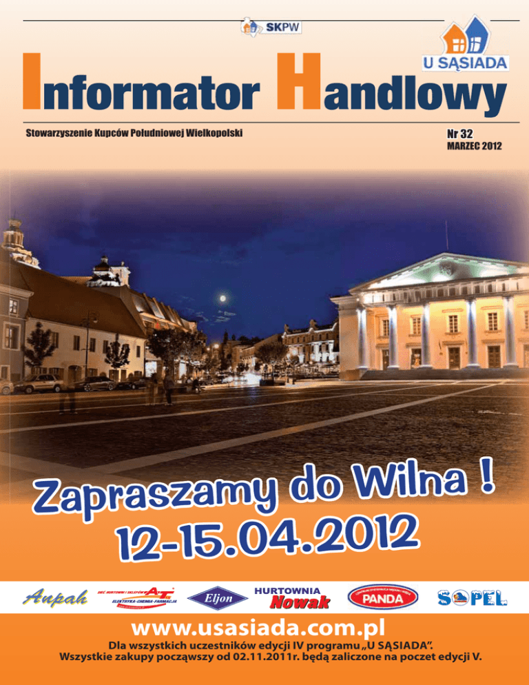 Stowarzyszenie Kupców Południowej Wielkopolski Nr 32 MARZEC 2012 ! a n l i W o d y Zapraszam 2 1 0 2 . 4 0 . 5 1 12www.usasiada.com.pl Dla wszystkich uczestników edycji IV programu „U SĄSIADA”. Wszystkie zakupy począwszy od 02.11.2011r. będą zaliczone na poczet edycji V. 1 III Bal Karnawa³owy 2 wy „U S¥SIADA” 3 Wspomnienia z wyjazdu 4 u szkoleniowego do U.S.A. 5 WILNO Termin wycieczki : 12-15.04.2012 czas trwania: 4dni Wilno – miasto – świadek młodzieńczych lat Mickiewicza i Słowackiego, słynące z pięknych gotyckich i barokowych kościołów, kaplicy z cudownym Obrazem Matki Boskiej Miłosiernej w Ostrej Bramie, najstarszego i najpiękniejszego cmentarza na Rossie z 1769 roku, Uniwersytetu im. Stefana Batorego oraz Góry Trzech Krzyży. 990 punktów m TROKI, czyli miasto na wodzie- dawna stolica Litwy. Na początku XIVw. Troki były ważnym centrum administracyjno-gospodarczym i obronnym. Znajdowały się tu dwa zamki: zamek naa półwyspie oraz gotycki zamek na jednej z wysp jeziora Galve. Zamek na wyspie odbudowa-ny w połowie XXw. jest jedynym zamkiem na wodzie w Europie Wschodniej i główną atrakcjąą Trok. Obecnie w zamku mieści się muzeum, latem natomiast odbywają się spektakle Narodo-wego Teatru Operyi Baletu. 6 BERLIN, POCZDAM, TROPIKALNA WYSPA Termin wycieczki : 20-23.09.2012 czas trwania: 4dni 1190 punktów Berlin – miasto-symbol... Przez lata podzielony, dziś zdaje siê ju¿ na wieki pozostaæ stolic¹ zjednoczonych Niemiec. Jest prawie 3,5-milionow¹ kosmopolityczn¹ metropoli¹, osobnym krajem zwi¹zkowym oraz stolic¹ najludniejszego kraju Unii Europejskiej. Przez ostatnie lata miasto by³o „najwiêkszym placem budowy Europy” – wznoszono gigantyczne nowe gmachy, remontowano ju¿ istniej¹ce, dbano o zabytki tak, aby odwiedzaj¹cy niemieck¹ stolicê mieli świadomośæ rangi tego miejsca. Dziêki temu dzisiejszy Berlin mo¿e pochwaliæ siê wielk¹ ró¿norodności¹ – znajdziemy w nim miejsca historyczne i zarazem symboliczne, jak Bramê Brandenbursk¹, Wie¿ê Telewizyjn¹ (na zdjêciu obok) czy resztki Muru Berliñskiego, nowoczesne obiekty na miarê XXI wieku jak góruj¹ce nad miastem drapacze chmur na Placu Poczdamskim, a tak¿e miejsca, w których zapadaj¹ najwa¿niejsze decyzje dla ca³ych Niemiec, a nieraz równie¿ dla Europy. Dlatego te¿ nie zabraknie w naszym programie zwiedzania s³ynnego gmachu Reichstagu – Parlamentu RFN, z którego znanej na ca³ym świecie szklanej kopu³y bêdziemy mogli ogl¹daæ panoramê miasta jak równie¿ obraduj¹cych w parlamencie deputowanych, przejdziemy obok supernowoczesnego kompleksu ministerstw i komisji rz¹dowych, Urzêdu Kanclerza oraz pa³acyku, w którym urzêduje Prezydent RFN. W czasie naszej wycieczki poznamy najwa¿niejsze zabytki niemieckiej stolicy, po czym odwiedzimy równie¿ po³o¿on¹ nieopodal stolicê Brandenburgii – Poczdam wraz z jego zabytkowy piêknym pa³acem Sannsouci i historyczn¹ starówk¹. Na dobre zakoñczenie wycieczki proponujemy 6-godzinny pobyt w najwiêkszym aquaparku Europy – Tropical Islands, w którym po napiêtym programie zwiedzania Berlina (dziêki któremu w krótkim czasie poznamy jego zabytki) bêdziemy mogli odpocz¹æ i poczuæ siê jak nad ciep³ym egzotycznym morzem. Zapraszamy na wschód Niemiec!!!! 7 K Y KS Meksyk leży w części zwanej Ameryką Środkową. Od Północy sąsiaduje z USA, na południu – z Gwatemalą. Jest krajem dużym, liczy niemal 2 mln km². Meksyk jest krajem hiszpańskojęzycznym, w tym języku porozumiemy się z większością rdzennych mieszkańców należących do licznych tu plemion indiańskich. Znajomość języka angielskiego ograniczona jest przede wszystkim do większych miast i miejscowości turystycznych. Chcąc więc podróżować po całym kraju, warto zapoznać sięę choć z ppodstawami hiszpańskiego. p g ME * Co miesiąc będziemy Państwu prezentować przykladowe wycieczki za granicę. Wybór wycieczki zależeć będzie od Państwa. 8 Półwysep Jukatan Będąc w Meksyku, warto zaplanować kilkudniowy pobyt na półwyspie Jukatan. Atrakcją są tu tropikalne lasy z bujną roślinnością, rafa koralowa i pozostałości po kulturze Majów. Nurkowanie na rafie koralowej to wyjątkowe przeżycie nie tylko dla wielbicieli sportów wodnych. Dzięki licznym szkołom można skorzystać z kursu, który pozwoli cieszyć się podwodną wycieczką, także początkującym nurkom. Na wybrzeżu i okolicznych wyspach znajdziemy też firmy organizujące wyprawy na rafę koralową. Częstym celem wycieczek jest wyspa Contoy – ptasi rezerwat, w którym żyją między innymi kormorany i flamingi. Wielbiciele przygód mogą też odwiedzić El Garrafon, podwodny rezerwat i rekinie jaskinie. Na Półwyspie Jukatan panują też doskonałe warunki do uprawiania różnych sportów; szczególnie popularny jest surfing i kitesurfing. Wyprawa koleją meksykańską W Meksyku znajduje się linia kolejowa, która nie bez przyczyny uważana jest za najbardziej widowiskową na świecie. Biegnie przez malownicze wąwozy, mosty nad przepaściami, wije się wśród wodospadów i indiańskich wiosek. To Ferrocarril Chihuahua al Pacifico. Podróż na trasie o długości 661 km zajmuje 12 godzin. To nie tylko czas na podziwianie widoków. Można też bliżej poznać rdzenną kulturę. Na stacjach często pojawiają się Indianki oferujące lokalne produkty i pamiątki. Meksykańska Fiesta! Kultura meksykańska charakteryzuje się wyjątkowo barwnym obchodzeniem licznych świąt. Warto zaplanować podróż na listopad, by wziąć udział w Święcie Zmarłych. Choć przypada ono na 1 listopada, już od połowy października trwają przygotowania; kupić można np. cukrowe czaszki sprzedawane na ulicznych straganach. Jest to przejaw meksykańskiego - wesołego podejścia do śmierci i życia. 9 *cena za 1szt. 10 sklep internetowy www.e-promedia.com 1111 Za zakup 2 disp. KOPIRYNY czteropak Wafli Original i czteropak Wafli