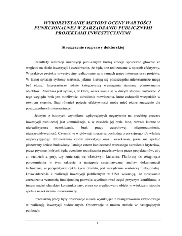 WYKORZYSTANIE METODY OCENY WARTOŚCI FUNKCJONALNEJ W ZARZĄDZANIU PUBLICZNYMI PROJEKTAMI INWESTYCYJNYMI Streszczenie rozprawy doktorskiej Rezultaty realizacji inwestycji publicznych budzą emocje społeczne głównie ze względu na skalę inwestycji i oczekiwanie, że będą one realizowane w sposób efektywny. W praktyce projekty inwestycyjne realizowane są w ramach grupy interesariuszy projektu. W takiej sytuacji systemy wartości, jakimi kierują się poszczególni interesariusze mogą być różne. Interesariusze różnie kategoryzują wymagania stawiane planowanemu obiektowi. Możliwa jest sytuacja, w której oczekiwania są w dużym stopniu rozbieżne. Z tego względu brak jest możliwości określenia rozwiązania, które zadowoli wszystkich w równym stopniu. Stąd również pojęcie efektywności może mieć różne znaczenie dla poszczególnych interesariuszy. Jednym z istotnych czynników wpływających negatywnie na przebieg procesu inwestycji publicznej jest komunikacja, a w zasadzie jej brak. Inne, równie istotne to nierealistyczne oczekiwania, brak pracy zespołowej, nieporozumienia, nieprzewidywalność. Czynniki te w głównej mierze są pochodną precyzyjnego lub właśnie nieprecyzyjnego definiowania celów inwestycji oraz oczekiwań, jakie ma spełnić planowany obiekt budowlany. Istnieje zatem konieczność wczesnego określenia kryteriów, przez pryzmat których będą oceniane rozwiązania przedstawione przez projektantów, aby ci wiedzieli z góry, czy zmierzają we właściwym kierunku. Platformą do osiągnięcia porozumienia w tym zakresie, a następnie systematycznej analizy dokumentacji technicznej w perspektywie cyklu życia obiektu, jest zarządzanie wartością funkcjonalną. Doświadczenia z realizacji inwestycji publicznych w USA wskazują, że stosowanie zarządzania wartością funkcjonalną pozwala wyeliminować część przyczyn konfliktów, a innym nadać charakter konstruktywny, przez co zrealizowany obiekt w większym stopniu spełnia oczekiwania interesariuszy. Przesłanką pracy były obserwacje autora wynikające z zaangażowania zawodowego w realizację inwestycji budowlanych. Obserwacje te można streścić w następujących punktach: 1 brak refleksji nad kosztem cyklu życia obiektu, braki w komunikacji na linii inwestor - projektant, realizacja obiektów drogich w eksploatacji i oferujących niekorzystną relację nakładów do użyteczności. Obserwacje te z kolei skłoniły autora do zbadania aplikowalności koncepcji zarządzania wartością funkcjonalną do oceny inwestycji publicznych w Polsce na etapie projektowania technicznego obiektu budowlanego. Wyniki stosowania tej metody za granicą dowodzą sensu zaangażowania środków w jej użycie. Efekty te sprowadzają się do podniesienia funkcjonalności obiektu i racjonalizacji kosztu życia obiektu budowlanego, zwłaszcza w ujęciu relacji kosztu do uzyskanej funkcjonalności. Dysertacja skupia się na procesie planowania inwestycji publicznej, w tym projektowania technicznego, które jest złożonym procesem decydującym o produkcie finalnym realizowanego projektu inwestycyjnego. Na etapie planowania ścierają się interesy projektanta i szeroko pojętego inwestora (wraz z użytkownikiem). W pracy skupiono się na inwestorze będącym podmiotem publicznym realizującym inwestycję będącą odpowiedzią na pewną zidentyfikowaną potrzebę publiczną. O ile niedostateczne przygotowanie inwestora do prowadzenia inwestycji jest wskazywane jako powód komplikacji przebiegu procesu, o tyle brak odpowiedzi dlaczego tak się dzieje. Przeprowadzone badania wskazały na często dobre przygotowanie merytoryczne osób prowadzących inwestycję w ramach analizowanej instytucji, posiadających niezbędne doświadczenie, a mimo to borykających się z brakiem zrozumienia procesu przez przyszłych użytkowników lub swoich mocodawców, co ma zasadniczy wpływ na przebieg procesu projektowania technicznego w ramach procesu inwestycyjnego. Skutkuje to ogólnie niską oceną przygotowania merytorycznego inwestora, gdyż wpływa na całokształt przebiegu procesu projektowania. Na podstawie przeprowadzonych studiów literaturowych obejmujących zagadnienia związane z etapem planowania i projektowania inwestycji publicznej zdefiniowano problem badawczy w formie dwóch pytań badawczych: P1: Czy polski inwestor publiczny, planując realizację obiektu budowlanego, analizuje koszty cyklu życia obiektu budowlanego? P2: W jakich obszarach cykle inwestycji publicznych w Polsce i w USA są podobne, a na czym polega luka? 2 Odpowiedzi na pytania badawcze stanowiły punkt wyjścia do realizacji dwóch głównych celów pracy. Celem o charakterze poznawczym jest zbadanie możliwości wykorzystania analizy funkcji techniczno-użytkowych do zwiększenia efektywności realizacji obiektów budowlanych w sektorze publicznym. Cel praktyczny to zaproponowanie metodyki badania spełniania funkcji techniczno użytkowych obiektu budowlanego w sektorze publicznym na etapie projektowania. Cele główne zostały zdekomponowane do postaci celów szczegółowych wymienionych poniżej. CS1: Określenie aktualnego stanu wiedzy na temat procesu inwestycyjnego w Polsce, ze szczególnym uwzględnieniem etapu planowania. CS2: Analiza praktyki i skutków stosowania metod opartych na analizie funkcji w USA. CS3: Empiryczne zbadanie przebiegu procesu inwestycyjnego na etapie projektowania technicznego. CS4: Koncepcja wprowadzenia zarządzania wartością funkcjonalną do polskich inwestycji publicznych. CS5: Case studies wybranych inwestycji na podstawie zebranych w trakcie badań empirycznych danych. CS6: Analiza porównawcza opracowanej metody z analogiczną praktyką w USA. Odpowiedź na pytanie badawcze P1 uzyskano w trakcie realizacji celu CS3. Natomiast odpowiedź na pytanie badawcze P2 była punktem wyjścia do realizacji celów CS4, CS5 i CS6. Cel poznawczy realizowany był odpowiednio w ramach celów szczegółowych CS1