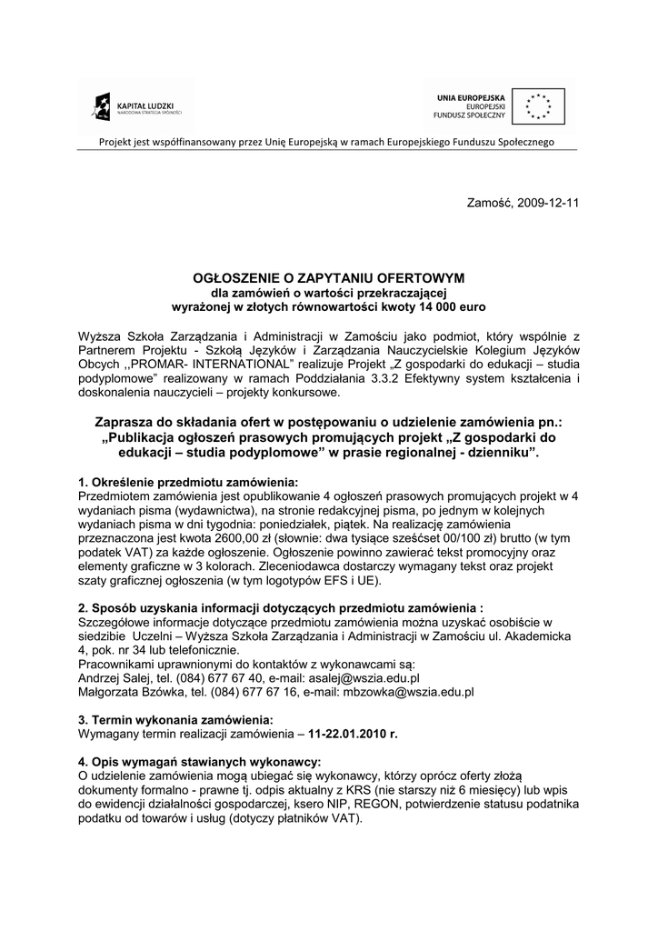Projekt jest współfinansowany przez Unię Europejską w ramach Europejskiego Funduszu Społecznego Zamość, 2009-12-11 OGŁOSZENIE O ZAPYTANIU OFERTOWYM dla zamówień o wartości przekraczającej wyrażonej w złotych równowartości kwoty 14 000 euro Wyższa Szkoła Zarządzania i Administracji w Zamościu jako podmiot, który wspólnie z Partnerem Projektu - Szkołą Języków i Zarządzania Nauczycielskie Kolegium Języków Obcych ,,PROMAR- INTERNATIONAL” realizuje Projekt „Z gospodarki do edukacji – studia podyplomowe” realizowany w ramach Poddziałania 3.3.2 Efektywny system kształcenia i doskonalenia nauczycieli – projekty konkursowe. Zaprasza do składania ofert w postępowaniu o udzielenie zamówienia pn.: „Publikacja ogłoszeń prasowych promujących projekt „Z gospodarki do edukacji – studia podyplomowe” w prasie regionalnej - dzienniku”. 1. Określenie przedmiotu zamówienia: Przedmiotem zamówienia jest opublikowanie 4 ogłoszeń prasowych promujących projekt w 4 wydaniach pisma (wydawnictwa), na stronie redakcyjnej pisma, po jednym w kolejnych wydaniach pisma w dni tygodnia: poniedziałek, piątek. Na realizację zamówienia przeznaczona jest kwota 2600,00 zł (słownie: dwa tysiące sześćset 00/100 zł) brutto (w tym podatek VAT) za każde ogłoszenie. Ogłoszenie powinno zawierać tekst promocyjny oraz elementy graficzne w 3 kolorach. Zleceniodawca dostarczy wymagany tekst oraz projekt szaty graficznej ogłoszenia (w tym logotypów EFS i UE). 2. Sposób uzyskania informacji dotyczących przedmiotu zamówienia : Szczegółowe informacje dotyczące przedmiotu zamówienia można uzyskać osobiście w siedzibie Uczelni – Wyższa Szkoła Zarządzania i Administracji w Zamościu ul. Akademicka 4, pok. nr 34 lub telefonicznie. Pracownikami uprawnionymi do kontaktów z wykonawcami są: Andrzej Salej, tel. (084) 677 67 40, e-mail: [email protected] Małgorzata Bzówka, tel. (084) 677 67 16, e-mail: [email protected] 3. Termin wykonania zamówienia: Wymagany termin realizacji zamówienia – 11-22.01.2010 r. 4. Opis wymagań stawianych wykonawcy: O udzielenie zamówienia mogą ubiegać się wykonawcy, którzy oprócz oferty złożą dokumenty formalno - prawne tj. odpis aktualny z KRS (nie starszy niż 6 miesięcy) lub wpis do ewidencji działalności gospodarczej, ksero NIP, REGON, potwierdzenie statusu podatnika podatku od towarów i usług (dotyczy płatników VAT). O udzielenie zamówienia mogą ubiegać się wykonawcy, których wydawnictwo (pismo) swoim zasięgiem obejmuje całe województwo lubelskie, a nakład wydawnictwa jednorazowo, średnio przekracza 20 tys. egzemplarzy. Potwierdzeniem wysokości nakładu winno być zaświadczenie wystawione przez Związek Kontroli Dystrybucji Prasy, za III kwartał 2009 r. Dodatkowym wymogiem jest zobowiązanie wykonawcy do publikacji ogłoszenia o powierzchni wynikającej z ilorazu kwoty przeznaczonej na jedno ogłoszenie do oferowanej ceny za jeden cm2. 5. Kryteria wyboru oferty. Kryterium wyboru jest skalkulowany iloraz: wynikającego z zaświadczenia, średniego nakładu wydawnictwa do podanej w ofercie ceny za jeden cm2 powierzchni ogłoszenia (100%). 6. Opis sposobu wyboru oferty najkorzystniejszej: Oferta z najkorzystniejszym ilorazem nakładu pisma w stosunku do ceny za jeden cm2 powierzchni ogłoszenia złożona przez wykonawcę, spełniającego wymagania określone w zaproszeniu zostanie wybrana jako oferta najkorzystniejsza. 7. Miejsce i termin składania ofert: Oferty należy składać w siedzibie Wyższej Szkoły Zarządzania i Administracji w Zamościu ul. Akademicka 4, pok. nr 34 lub pocztą w terminie do dnia 05.01.2010 r. do godz. 15.30. Oferta, zawierająca zaświadczenie o nakładzie pisma, cenę za jeden cm2 powierzchni ogłoszenia oraz zobowiązanie wykonawcy do publikacji ogłoszenia o powierzchni wynikającej z ilorazu kwoty przeznaczonej na jedno ogłoszenie do oferowanej ceny za jeden cm2, winna być sporządzona na „Formularzu oferty” - druk do pobrania na stronie internetowej www.wszia.edu.pl . 8. Informacja o wyborze najkorzystniejszej oferty: Informacja o wyborze najkorzystniejszej oferty zawierająca: nazwę (firmę), siedzibę i adres wykonawcy, którego ofertę wybrano zostanie opublikowana na stronie internetowej www.wszia.edu.pl. 9. Informacja o terminie i miejscu podpisania umowy: Informacja o terminie i miejscu podpisania umowy zostanie przekazana wykonawcy, którego ofertę wybrano. 10. Niniejsze zamówienie nie jest realizowane w oparciu o ustawę z dnia 29 stycznia 2004 Prawo zamówień publicznych. Rektor Wyższej Szkoły Zarządzania i Administracji w Zamościu