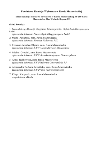 Powiatowa Komisja Wyborcza w Rawie Mazowieckiej adres siedziby: Starostwo Powiatowe w Rawie Mazowieckiej, 96-200 Rawa Mazowiecka, Plac Wolności 1, pok. 112 skład komisji: 1. Przewodniczący Komisji: Zbigniew Mierzejewski, Sędzia Sądu Okręgowego w Łodzi zgłoszenia dokonał: Prezes Sądu Okręgowego w Łodzi 2. Maria Aptapska, zam. Rawa Mazowiecka zgłoszenia dokonał: Komitet Wyborczy PSL 3. Ireneusz Jarosław Błądek, zam. Rawa Mazowiecka zgłoszenia dokonał: KWW Gospodarność-Skuteczność 4. Michał Grochal, zam. Rawa Mazowiecka zgłoszenia dokonał: KWW Rawska Inicjatywa Samorządowa 5. Anna Idzikowska, zam. Rawa Mazowiecka zgłoszenia dokonał: KW Platforma Obywatelska RP 6. Aleksandra Barbara Jarosińska, zam. Rawa Mazowiecka zgłoszenia dokonał: KW Prawo i Sprawiedliwość 7. Kinga Kacprzak, zam. Rawa Mazowiecka uzupełnienie składu
