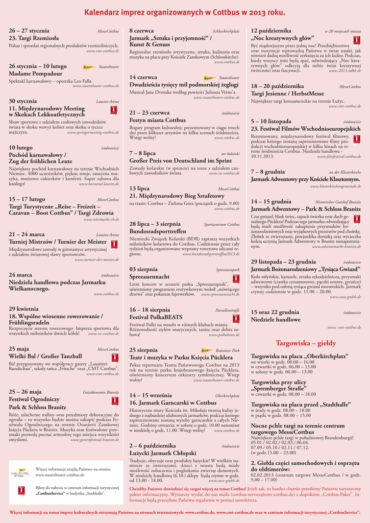 Kalendarz imprez organizowanych w Cottbus w 2013 roku. 26 – 27 stycznia 23. Targi Rzemiosła MesseCottbus Pokaz i sprzedaż regionalnych produktów rzemieślniczych. www.cmt-cottbus.de 8 czerwca Schlosskirchplatz Jarmark „Sztuka i przyjemność“ / Kunst & Genuss Regionalne rzemiosło artystyczne, sztuka, kulinaria oraz muzyka na placu przy Kościele Zamkowym (Schlosskirche). www.cottbus.de 26 stycznia – 10 lutego Madame Pompadour Staatstheater Spektakl karnawałowy – operetka Leo Falla. www.staatstheater-cottbus.de 14 czerwca Staatstheater Dwadzieścia tysięcy mil podmorskiej żeglugi Musical Jana Dvoraka według powieści Juliusza Verne’a. 30 stycznia 11. Międzynarodowy Meeting w Skokach Lekkoatletycznych 21 – 23 czerwca Festyn miasta Cottbus Być mądrzejszym przez jedną noc! Przedsiębiorstwa oraz instytucje wprowadzą Państwa w świat nauki, jak również dadzą możliwość zerknięcia za ich kulisy. Podczas, kiedy wszyscy inni będą spać, odwiedzający „Noc kreatywnych głów” odkryją dla siebie świat kreatywnej twórczości oraz fascynacji. www.2013.ndkk.de 18 – 20 października Targi Jesienne / HerbstMesse MesseCottbus Największe targi konsumenckie na terenie Łużyc. śródmieście Bogaty program kulturalny, prezentowany w ciągu trzech dni przez kilkuset artystów na kilku scenach śródmieścia. Wstęp wolny! www.cottbus.de śródmieście 7 – 8 lipca tor kolarski Großer Preis von Deutschland im Sprint Największy pochód karnawałowy na terenie Wschodnich Niemiec. 4000 uczestników, piękne stroje, taneczna muzyka, mnóstwo cukierków i konfetti. Super zabawa dla każdego! www.karneval-lausitz.de 15 – 17 lutego MesseCottbus Targi Turystyczne „Reise – Freizeit – Caravan – Boot Cottbus” / Targi Zdrowia www.reisemarkt-cb.de 21 – 24 marca Lausitz-Arena Turniej Mistrzów / Turnier der Meister Międzynarodowe zawody w gimnastyce artystycznej z udziałem światowej sławy sportowców. Zawody kolarskie (w sprincie) na torze z udziałem czołowych zawodników świata. www.rsc-cottbus.de 13 lipca MesseCottbus 21. Międzynarodowy Bieg Sztafetowy na trasie: Cottbus – Zielona Góra (początek o godz. 9.00) www.cottbus.de 28 lipca – 3 sierpnia Bundesradsporttreffen Sportzentrum Cottbus Niemiecki Związek Kolarski (BDR) zaprasza wszystkich miłośników kolarstwa do Cottbus. Codziennie przez cały tydzień będą organizowane wyprawy rowerowe ulicami regionu. www.bundesradsporttreffen2013.de www.turnier-der-meister.de 24 marca śródmieście Niedziela handlowa podczas Jarmarku Wielkanocnego. www.cottbus.de 29 kwietnia 18. Wspólne wiosenne rowerowanie / Frühlingsradeln 03 sierpnia Spreeauennacht Spreeauenpark 5 – 10 listopada śródmieście 23. Festiwal Filmów Wschodnioeuropejskich Renomowany, międzynarodowy festiwal filmowy, podczas którego zostaną zaprezentowane filmy produkcji wschodnioeuropejskiej w kilku kinach na terenie śródmieścia Cottbus. Niedziela handlowa 10.11.2013. www.filmfestival-cottbus.de 7 – 8 grudnia an der Klosterkirche Jarmark Adwentowy przy Kościele Klasztornym. www.klosterkirchengemeinde.de 14 – 15 grudnia Historischer Gutshof Branitz Jarmark Adwentowy – Park & Schloss Branitz Czar gwiazd, blask świec, zapach świerku oraz duch genialnego Pücklera! Podczas tego jarmarku odwiedzający będą mieli możliwość zakupienia przysmaków bożonarodzeniowych oraz wyjątkowych prezentów pod choinkę. Żłobek ze zwierzętami, przejażdżka dorożką oraz wycieczka łodzią uczynią Jarmark Adwentowy w Branitz niezapomnianym. www.adventsmarkt-branitz.de 29 listopada – 23 grudnia śródmieście Jarmark Bożonarodzeniowy „Tysiąca Gwiazd” Letni koncert w scenerii parku „Spreeauenpark”, uświetniony programem rozrywkowym wokół „mówiącego drzewa” oraz pokazem fajerwerków. www.spreeauennacht.de Koło młyńskie, karuzele, sztuka rękodzielnicza, przysmaki adwentowe (ciastka cynamonowe, pączki serowe, grzańce) – wszystko pod osłoną tysiąca gwiazd morawskich. Jarmark czynny codziennie w godz. 11.00 – 20.00. 16 – 18 sierpnia Festival PolkaBEATS 15 oraz 22 grudnia Niedziele handlowe Parzellenstraße Rozpoczęcie sezonu rowerowego. Impreza sportowa dla wszystkich miłośników dwóch kółek! www.rsc-cottbus.de Festiwal Polki na wesoło w różnych klubach miasta. Różnorodność stylów muzycznych, taniec oraz dobra zabawa! www.polkabeats.de 25 maja Wielki Bal / Großer Tanzball MesseCottbus 25 sierpnia Branitzer Park Teatr i muzyka w Parku Księcia Pücklera Bal przygotowany we współpracy gazety „Lausitzer Rundschau”, szkoły tańca „Fritsche” oraz „CMT Cottbus”. Pokaz repertuaru Teatru Państwowego Cottbus na 2013 rok na terenie parku krajobrazowego księcia Pücklera, uświetniony koncertem orkiestry symfonicznej. Wstęp wolny! www.staatstheater-cottbus.de www.coex-gmbh.de śródmieście www. cmt-cottbus.de Targowiska – giełdy www.cmt-cottbus.de 25 – 26 maja Festiwal Ogrodniczy Park & Schloss Branitz w 20 miejscach miasta www.cmt-cottbus.de Show sportowe z udziałem czołowych zawodników świata w skoku wzwyż kobiet oraz skoku o tyczce mężczyzn. www.springermeeting-cottbus.de 10 lutego Pochód karnawałowy / Zug der fröhlichen Leute www.staatstheater-cottbus.de Lausitz-Arena 12 października „Noc kreatywnych głów” Gutsökonomie Branitz Róże, szlachetne rośliny oraz przedmioty dekoracyjne do ogrodu – to wszystko będzie można zakupić podczas Festiwalu Ogrodniczego na terenie Oranżerii Zamkowej księcia Pückera w Branitz. Muzyka oraz festiwalowe przysmaki pozwolą poczuć atmosferę tego miejsca wszystkimi zmysłami. www.gartenfestival-branitz.de Targowiska na placu „Oberkirchplatz” we wtorki w godz. 08.00 – 16.00 w czwartki w godz. 06.00 – 13.00 w soboty w godz. 06.00 – 13.00 Targowiska przy ulicy „Spremberger Straße” 14 – 15 września Oberkirchplatz 16. Jarmark Garncarski w Cottbus w czwartki w godz. 08.00 – 18.00 Historyczne m