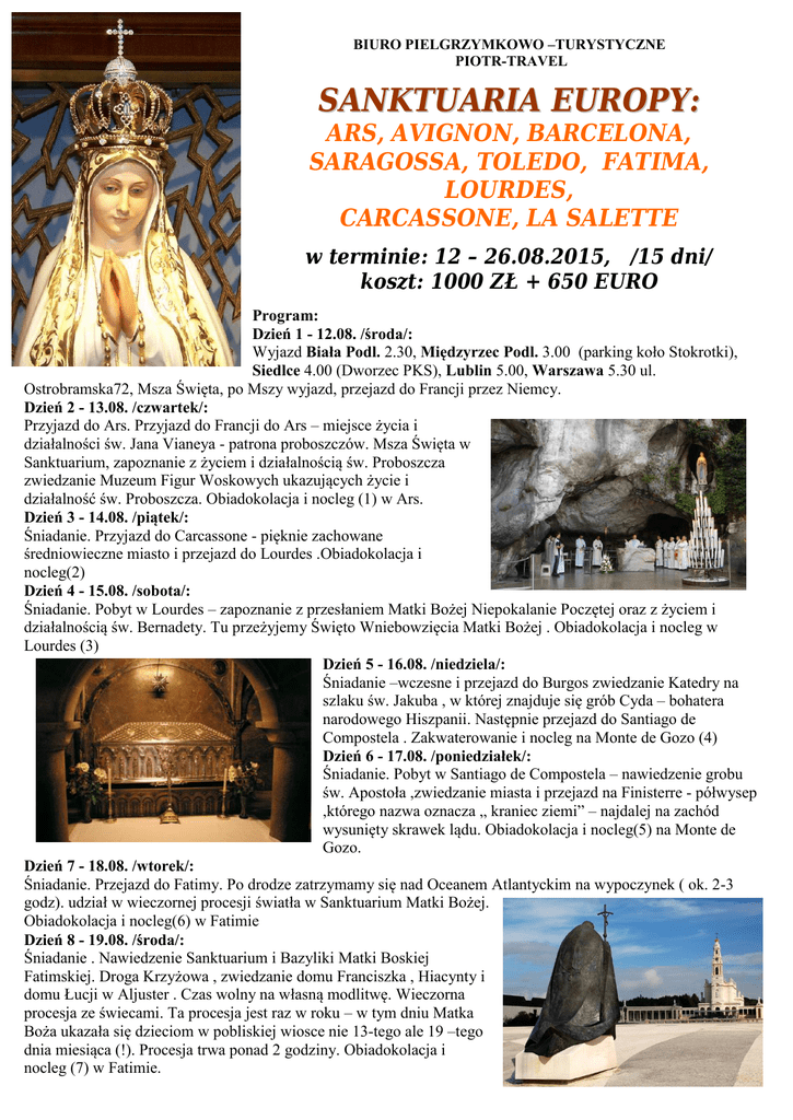 BIURO PIELGRZYMKOWO –TURYSTYCZNE PIOTR-TRAVEL SANKTUARIA EUROPY: ARS, AVIGNON, BARCELONA, SARAGOSSA, TOLEDO, FATIMA, LOURDES, CARCASSONE, LA SALETTE w terminie: 12 – 26.08.2015, /15 dni/ koszt: 1000 ZŁ + 650 EURO Program: Dzień 1 - 12.08. /środa/: Wyjazd Biała Podl. 2.30, Międzyrzec Podl. 3.00 (parking koło Stokrotki), Siedlce 4.00 (Dworzec PKS), Lublin 5.00, Warszawa 5.30 ul. Ostrobramska72, Msza Święta, po Mszy wyjazd, przejazd do Francji przez Niemcy. Dzień 2 - 13.08. /czwartek/: Przyjazd do Ars. Przyjazd do Francji do Ars – miejsce życia i działalności św. Jana Vianeya - patrona proboszczów. Msza Święta w Sanktuarium, zapoznanie z życiem i działalnością św. Proboszcza zwiedzanie Muzeum Figur Woskowych ukazujących życie i działalność św. Proboszcza. Obiadokolacja i nocleg (1) w Ars. Dzień 3 - 14.08. /piątek/: Śniadanie. Przyjazd do Carcassone - pięknie zachowane średniowieczne miasto i przejazd do Lourdes .Obiadokolacja i nocleg(2) Dzień 4 - 15.08. /sobota/: Śniadanie. Pobyt w Lourdes – zapoznanie z przesłaniem Matki Bożej Niepokalanie Poczętej oraz z życiem i działalnością św. Bernadety. Tu przeżyjemy Święto Wniebowzięcia Matki Bożej . Obiadokolacja i nocleg w Lourdes (3) Dzień 5 - 16.08. /niedziela/: Śniadanie –wczesne i przejazd do Burgos zwiedzanie Katedry na szlaku św. Jakuba , w której znajduje się grób Cyda – bohatera narodowego Hiszpanii. Następnie przejazd do Santiago de Compostela . Zakwaterowanie i nocleg na Monte de Gozo (4) Dzień 6 - 17.08. /poniedziałek/: Śniadanie. Pobyt w Santiago de Compostela – nawiedzenie grobu św. Apostoła ,zwiedzanie miasta i przejazd na Finisterre - półwysep ,którego nazwa oznacza „ kraniec ziemi” – najdalej na zachód wysunięty skrawek lądu. Obiadokolacja i nocleg(5) na Monte de Gozo. Dzień 7 - 18.08. /wtorek/: Śniadanie. Przejazd do Fatimy. Po drodze zatrzymamy się nad Oceanem Atlantyckim na wypoczynek ( ok. 2-3 godz). udział w wieczornej procesji światła w Sanktuarium Matki Bożej. Obiadokolacja i nocleg(6) w Fatimie Dzień 8 - 19.08. /środa/: Śniadanie . Nawiedzenie Sanktuarium i Bazyliki Matki Boskiej Fatimskiej. Droga Krzyżowa , zwiedzanie domu Franciszka , Hiacynty i domu Łucji w Aljuster . Czas wolny na własną modlitwę. Wieczorna procesja ze świecami. Ta procesja jest raz w roku – w tym dniu Matka Boża ukazała się dzieciom w pobliskiej wiosce nie 13-tego ale 19 –tego dnia miesiąca (!). Procesja trwa ponad 2 godziny. Obiadokolacja i nocleg (7) w Fatimie. Dzień 9 - 20. 08. /czwartek/: Msza Świeta pożegnalna, śniadanie. Wyjazd do Hiszpanii. Nocleg i obiadokolacja pod Toledo (8) Dzień 10 - 21. 08. /piątek/: Śniadanie. Zwiedzanie przepięknego Toledo – pierwszej stolicy Hiszpanii i wejście płatne do Katedry a następnie przejazd w okolice Saragossy. Obiadokolacja i nocleg (9) Dzień 11 - 22.08. /sobota/: Śniadanie. Dojazd do Saragossy i zwiedzanie miasta i katedry św. Zbawiciela – wejście płatne, oraz nawiedzenia Sanktuarium Matki Bożej de Pilar – miejsce objawienia Matki Bożej św. Jakubowi ApostołowiMsza Święta. Następnie przejazd na Montserrat – Sanktuarium narodowe Katalończyków. Obiadokolacja i nocleg(10) w okolicy Barcelony Dzień 12 - 23.08. /niedziela/: Śniadanie. Przejazd do Barcelony – zwiedzanie miasta katedra św. Eulalii, kolumny Krzysztofa Kolumba, budowle zaprojektowane przez A. Gaudiego- szczególnie Sagrada Familia. Zwiedzanie wnętrz /ok. 15euro/ Msza Święta. Obiadokolacja i nocleg (11) w okolicy Barcelony. Dzień 13 - 24.08. /poniedziałek/: Śniadanie. Przejazd do Avignon – stolica papieży na wygnaniu ( przez 73 lata). Zwiedzanie miasta: Pałac Papieży, Katedra, słynny most św. Benedykta na rzece Rodan – obecnie pozostały tylko 4 przęsła(!). Obiadokolacja i nocleg(12) w La Salette – Sanktuarium Matki Bożej. Udział w procesji światła. Dzień 14 - 25.08. /wtorek/: Śniadanie , nawiedzenie Sanktuarium i przepięknej górskiej okolicy, obiad w Sanktuarium i wyjazd do Polski, pozostałe posiłki we własnym zakresie. Dzień 15 - 26.08. /środa/: Przyjazd do Wrocławia. Zakończenie pielgrzymki Mszą Świętą we Wrocławiu. Świadczenia zawarte w cenie: - Przejazd autokarem LUX - 12 noclegów w hotelach 3*/4* - 12 śniadań (7 kontynentalnych – kawa, herbata, bułka, masło, dżem i 5 wzmocnionych –z serem i wędliną) - 12 obiadokolacji - opieka duszpasterska i codzienna Msza Święta - opieka licencjonowanego pilota wycieczek - ubezpieczenie NW i KL do 15 000 € - ubezpieczenie od skutków zaostrzenia choroby przewlekłej ! Świadczenia nie zawarte w cenie: - bilety do zwiedzanych obiektów , przewodnicy miejscowi i parkingi - ok. 60 € - napoje do kolacji płatne dodatkowo - ubezpieczenie od kosztów rezygnacji z imprezy Organizator zastrzega sobie prawo wprowadzenia zmian w programie w przypadku zaistnienia sytuacji od organizatora niezależnych. Szczegóły ustala pilot w porozumieniu z kierownikiem grupy. Rezerwację potwierdza wpłata zaliczki. Pełną kwotę w złotówkach i euro należy dokonać miesiąc przed wyjazdem na konto Biura. Przyjmujemy zamówienia na wyjazdy grupowe i organizowane przez parafie. Wyjazdy pielgrzymów: Lublin, Siedlce, Warszawa, Piotrków Trybunalski, Łódź, Częstochowa, Katowice, Radom, Kielce, Kraków, Bielsk Podlaski, Opole, Wrocław i innych miejsc Polski. Informacje i zapisy: 21-560 Międzyrzec Podlaski ul. Brzeska 23 tel./fax: 083/ 371 68 31 w godz. 9.00–17.00 lub kom., 604 464 878 w godz. 8.00-22.00, 604 464 877 E-mail: [email protected] lub [email protected], www.piotrtravel.pl Nr konta: P.H.U.”PIOTREX” Eksport-Import, Piotr Łosicki ul. Brzeska 23, 21-560 Międzyrzec Podl. PKO BP PLN: 41 1020 1260 0000 0202 0053 9171 EURO: 72 1020 1260 0000 0102 0063 SERDECZNIE ZAPRASZAMY