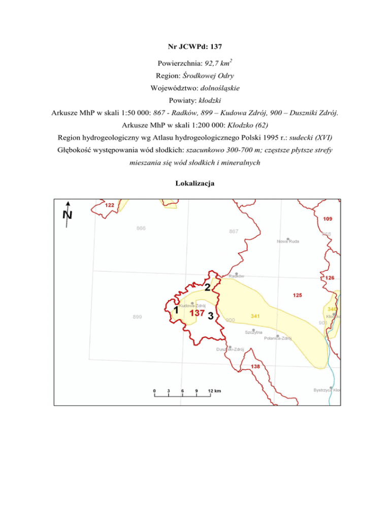 Nr JCWPd: 137 Powierzchnia: 92,7 km2 Region: Środkowej Odry Województwo: dolnośląskie Powiaty: kłodzki Arkusze MhP w skali 1:50 000: 867 - Radków, 899 – Kudowa Zdrój, 900 – Duszniki Zdrój. Arkusze MhP w skali 1:200 000: Kłodzko (62) Region hydrogeologiczny wg Atlasu hydrogeologicznego Polski 1995 r.: sudecki (XVI) Głębokość występowania wód słodkich: szacunkowo 300-700 m; częstsze płytsze strefy mieszania się wód słodkich i mineralnych Lokalizacja Profile m n.p.m. m n.p.m. 1 2 3 Q Q Pz-Pt Cr Cr P Pz-Pt warstwy wodonośne utwory słabo przepuszczalne SYMBOL całej JCWPd uwzględniający wszystkie profile: (Q-Cr), (Cr),(P), (Pz-Pt) Opis symbolu: W czwartorzędzie w rejonie Kudowa – Słone – Jeleniów występuje jeden poziom wodonośny będący w łączności hydraulicznej z górnym poziomem kredowym (Q-Cr), poniŜej – równieŜ w utworach górnokredowych występują strefy wodonośne z wodami szczelinowymi (Cr), podłoŜe tworzą słabowodonośne skały krystaliczne z wodami szczelinowymi (Pz-Pt). W północnej części JCWPd w utworach górnokredowych występują strefy wodonośne z wodami szczelinowym (Cr)i, poniŜej nieprzepuszczalne utwory permu (P). We wschodniej i południowej części JCWPd w obrębie wystąpień skał krystalicznych(Pz-Pt) przykrytych zawodnioną zwietrzeliną o miąŜszości średniej do kilku m (Q) występują lokalnie wody w strefach uszczelinowionych zazwyczaj do głębokości 50 m. Q, - wody porowe w utworach piaszczystych i zwietrzelinowych Q-Cr3 - wody porowe w utworach piaszczystych i piaskowcach Cr3 – wody szczelinowe w piaskowcach i marglach Pz-Pt - wody szczelinowe w utworach krystalicznych Cecha szczególna JCWPd (ilościowa, chemiczna): współwystępowanie wód słodkich i leczniczych (w tym mineralnych) GZWP występujące w obrębie JCWPd (symbol i numer): GZWP 341, - Niecka śródsudecka-wewnątrzsudecka Kudowa,(Cr). Schemat przepływu wód podziemnych