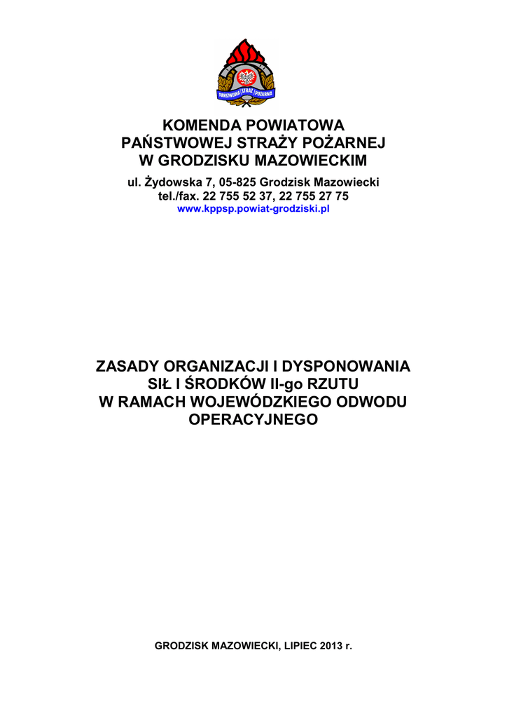 KOMENDA POWIATOWA PAŃSTWOWEJ STRAŻY POŻARNEJ W GRODZISKU MAZOWIECKIM ul. Żydowska 7, 05-825 Grodzisk Mazowiecki tel./fax. 22 755 52 37, 22 755 27 75 www.kppsp.powiat-grodziski.pl ZASADY ORGANIZACJI I DYSPONOWANIA SIŁ I ŚRODKÓW II-go RZUTU W RAMACH WOJEWÓDZKIEGO ODWODU OPERACYJNEGO GRODZISK MAZOWIECKI, LIPIEC 2013 r. INFORMACJA Komenda Powiatowa Państwowej Straży Pożarnej w Grodzisku Mazowieckim w związku z poleceniem Mazowieckiego Komendanta Wojewódzkiego (MKW) utworzyła na terenie własnego powiatu pododdziały taktyczne (plutony), z których utworzone zostały siły i środki II -go rzutu w ramach Wojewódzkiego Odwodu Operacyjnego. Plutony z terenu powiatu grodziskiego zostały uzupełnione o dodatkowe siły i środki, które ewentualnie mogą zostać zadysponowane w przypadku niesprawności wyznaczonych pojazdów lub prowadzenia podobnych działań na terenie własnego powiatu. Skład plutonów został zaakceptowany przez MKW Rozkazem nr 91/2013 z dnia 21 sierpnia 2013 r. w sprawie zorganizowania powiatowych plutonów ratowniczych. W związku z powyższym informujemy, że od dnia 21 sierpnia 2013 roku, plutony na polecenie WSKR Warszawa (lub bezpośrednio PSK Grodzisk Mazowiecki) mogą być dysponowane na terenie województwa mazowieckiego. Ponadto informujemy, że Rozkazem Nr 92/2013 Mazowieckiego Komendanta Wojewódzkiego PSP z dnia 21 sierpnia 2013 r. w sprawie wyznaczenia funkcjonariuszy do pełnienia nieetatowych funkcji „oficerów wsparcia” podczas kierowania dużymi działaniami ratowniczymi został wyznaczony oficer z KP PSP Grodzisk Mazowiecki do dowodzenia plutonem ratowniczym. Jednym z podstawowych zadań zadysponowanych przez WSKR oficerów wsparcia ma być m. in. dowodzenie siłami przekraczającymi dwa plutony, w tym dowodzenie przybyłymi z sąsiednich powiatów (np. plutonami wsparcia). W każdym powiecie na terenie województwa mazowieckiego zostało utworzonych pięć typów plutonów ratowniczych: 1. „Pożar - Las” 2. „Pożar – Fabryka” 3. „Katastrofa” 4. „Ulewa” 5. „Wichura” 2 TYPY RATOWNICZYCH PLUTONÓW POWIATOWYCH 1.A. Pluton „Pożar –Las” Zadania • Dojazd w trudnym terenie, • Gaszenie pożaru lasu, nieużytków, • Wykonywanie przecinek, • Zaopatrzenie wodne do celów gaśniczych. Środki • JRG Grodzisk Mazowiecki GCBA 5/34 (441M25) + pompa pływająca – (4 ratowników); • OSP Skuły GBA 2,5/16 Mercedes-Benz Atego (449M40) + pompa pływająca, piła spalinowa – (5 ratowników); • OSP Kłudno Stare GBA 2,5/16 (449M72) + pompa pływająca, piła spalinowa – (5 ratowników); • OSP Kaski GBA 2,5/16 (449M53) + pompa pływająca, piła spalinowa – (5 ratowników); W wszystkie wyżej wymienione pojazdy z napędem terenowym, a obsady zastępów (PSP oraz OSP) spełniają warunki czynnego udziału w działaniach ratowniczych oraz posiadają pełne umundurowanie ochronne. UWAGA: Dodatkowo (ewentualnie) na polecenie WSKR Warszawa lub PSK Grodzisk Mazowiecki należy zamiennie dysponować: • OSP Jaktorów GBA 2,8/20 (449M60) + pompa pływająca, piła spalinowa – (5 ratowników); • OSP Grodzisk Mazowiecki GBA 2,7/16 (449M70) + pompa pływająca, piła spalinowa – (5 ratowników); • OSP Baranów GBA 3,5/25 (449M56) + pompa pływająca, piła spalinowa – (5 ratowników); 3 1.B. Pluton „Pożar - Fabryka” Zadania • Uzupełnienie zaopatrzenia wodnego, • Działania poza strefą bezpośrednich działań, • Wsparcie logistyczne. Środki • JRG Grodzisk Mazowiecki GCBA 5/34 (441M25) + przenośne lub przewoźne działko wodno-pianowe, aparaty powietrzne nadciśnieniowe, sprzęt do podawania piany średniej i ciężkiej (wytwornice, prądownice pianowe) – (4 ratowników). UWAGA: Na polecenie WSKR w składzie plutonu opcjonalnie JRG Grodzisk Mazowiecki SCH-40 (441M53) zamiast GCBA 5/34 – (2 ratowników); • OSP Jaktorów GCBA 8/50 (449M61) + aparaty powietrzne nadciśnieniowe, pompa pływająca – (3 ratowników); • OSP Grodzisk Mazowiecki GCBA 5/32 (449M71) + aparaty powietrzne nadciśnieniowe, pompa pływająca – (5 ratowników); • OSP Baranów GBA 3,5/25 (449M56) + aparaty powietrzne nadciśnieniowe, pompa pływająca – (5 ratowników); Wyznaczone samochody z jednostek OSP z KSRG mają obowiązek posiadania środka pianotwórczego i sprawnej instalacji, sprzętu oraz armatury do podawania piany. UWAGA: Dodatkowo (ewentualnie) na polecenie WSKR Warszawa lub PSK Grodzisk Mazowiecki należy zamiennie dysponować: • OSP Międzyborów GCBA 5/32 (449M65) + aparaty powietrzne nadciśnieniowe, pompa pływająca – (5 ratowników); • OSP Milanówek GBA 2,5/16 (449M30) + aparaty powietrzne nadciśnieniowe, pompa pływająca – (5 ratowników); • OSP Kaski GBA 2,5/16 (449M53) + aparaty powietrzne nadciśnieniowe, pompa pływająca – (5 ratowników); 4 2. Pluton „Katastrofa” Zadania • Dojazd do zdarzenia w trudnym terenie, • Wykonywanie dostępu do osób poszkodowanych (katastrofa drogowa, kolejowa itp.), • Udzielenie kwalifikowanej pierwszej pomocy poszkodowanym, • Sprawdzenie i obsługa namiotu ewakuacyjnego, • Zabezpieczenie gaśnicze miejsca zdarzenia, • Oświetlenie miejsca działań, przygotowanie do pracy bez napięcia elektrycznego. Środki • JRG Grodzisk Mazowiecki GBA 2/16 (449M21) + zestaw PSP R1 (torba + deska + szyny), zestaw hydraulicznych narzędzi ratowniczych, agregat prądotwórczy z masztem oświetleniowym, piła do cięcia betonu i stali, sprzęt burzący – (4 ratowników). Na polecenie WSKR dodatkowo przyczepa z namiotem ewakuacyjnym. • OSP Milanówek GBA 2,5/16 (449M30) + zestaw PSP R1, zestaw hydraulicznych narzędzi ratowniczych, z masztem oświetleniowym, piła do cięcia betonu i stali, sprzęt burzący – (5 ratowników). • OSP Międzyborów GCBA 5/32 (449M65) + zestaw PSP R1, zestaw hydraulicznych narzędzi ratowniczych, z masztem oświetleniowym, piła do cięcia betonu i stali, sprzęt burzący – (5 ratowników). • OSP Kas