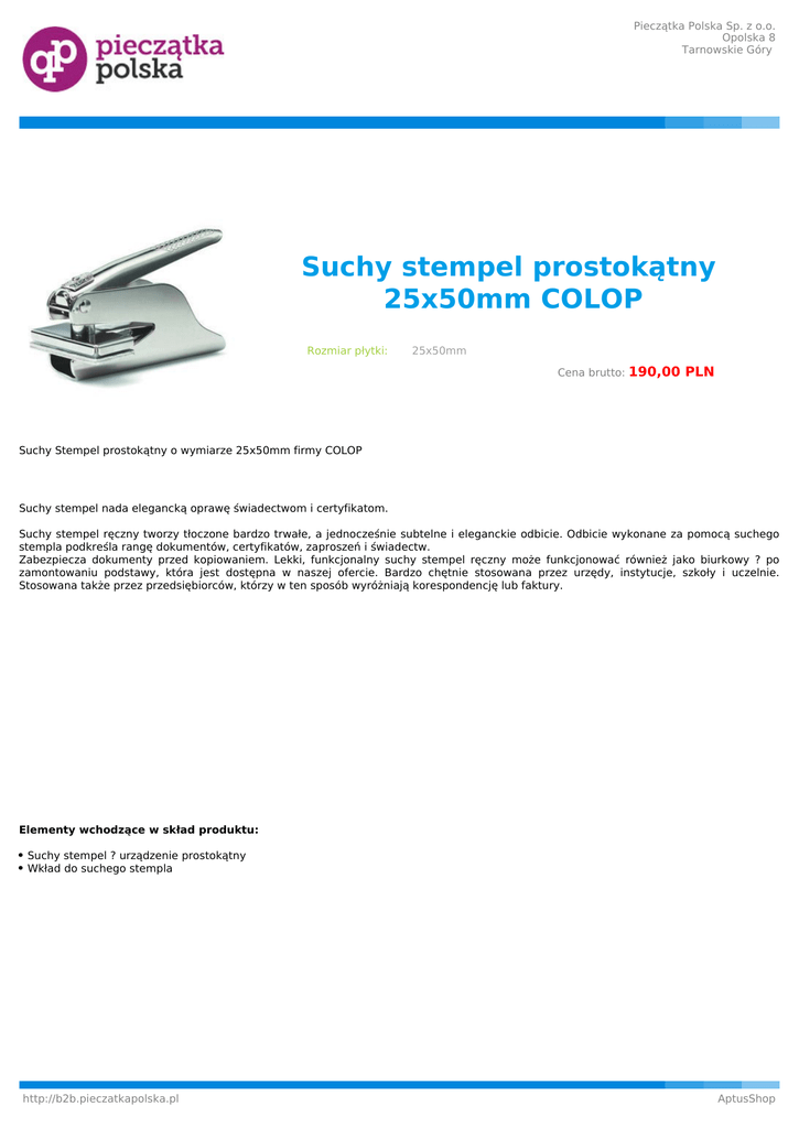 Pieczątka Polska Sp. z o.o. Opolska 8 Tarnowskie Góry Suchy stempel prostokątny 25x50mm COLOP Rozmiar płytki: 25x50mm Cena brutto: 190,00 PLN Suchy Stempel prostokątny o wymiarze 25x50mm firmy COLOP Suchy stempel nada elegancką oprawę świadectwom i certyfikatom. Suchy stempel ręczny tworzy tłoczone bardzo trwałe, a jednocześnie subtelne i eleganckie odbicie. Odbicie wykonane za pomocą suchego stempla podkreśla rangę dokumentów, certyfikatów, zaproszeń i świadectw. Zabezpiecza dokumenty przed kopiowaniem. Lekki, funkcjonalny suchy stempel ręczny może funkcjonować również jako biurkowy ? po zamontowaniu podstawy, która jest dostępna w naszej ofercie. Bardzo chętnie stosowana przez urzędy, instytucje, szkoły i uczelnie. Stosowana także przez przedsiębiorców, którzy w ten sposób wyróżniają korespondencję lub faktury. Elementy wchodzące w skład produktu: Suchy stempel ? urządzenie prostokątny Wkład do suchego stempla http://b2b.pieczatkapolska.pl AptusShop Pieczątka Polska Sp. z o.o. Opolska 8 Tarnowskie Góry Aby podkreślić tłoczone odbicie można użyć złotej lub srebrnej naklejki. Przykłady użycia suchego stempla bez naklejek: http://b2b.pieczatkapolska.pl AptusShop