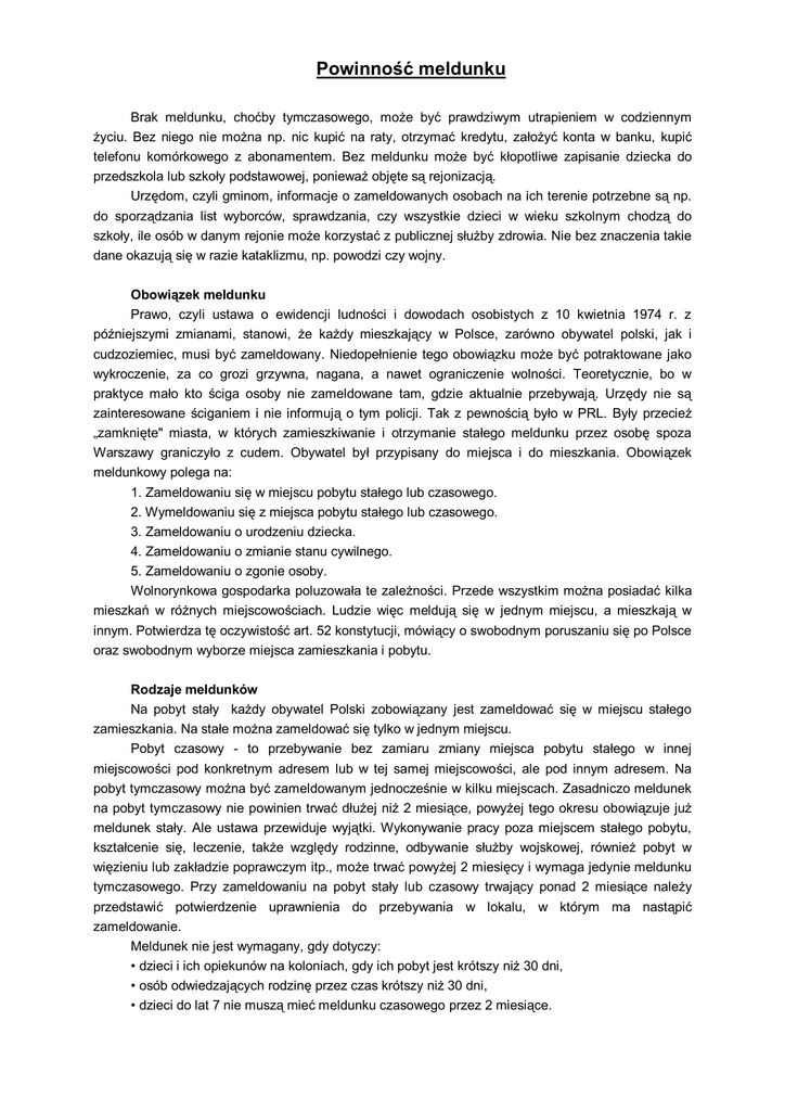 Powinność meldunku Brak meldunku, choćby tymczasowego, może być prawdziwym utrapieniem w codziennym życiu. Bez niego nie można np. nic kupić na raty, otrzymać kredytu, założyć konta w banku, kupić telefonu komórkowego z abonamentem. Bez meldunku może być kłopotliwe zapisanie dziecka do przedszkola lub szkoły podstawowej, ponieważ objęte są rejonizacją. Urzędom, czyli gminom, informacje o zameldowanych osobach na ich terenie potrzebne są np. do sporządzania list wyborców, sprawdzania, czy wszystkie dzieci w wieku szkolnym chodzą do szkoły, ile osób w danym rejonie może korzystać z publicznej służby zdrowia. Nie bez znaczenia takie dane okazują się w razie kataklizmu, np. powodzi czy wojny. Obowiązek meldunku Prawo, czyli ustawa o ewidencji ludności i dowodach osobistych z 10 kwietnia 1974 r. z późniejszymi zmianami, stanowi, że każdy mieszkający w Polsce, zarówno obywatel polski, jak i cudzoziemiec, musi być zameldowany. Niedopełnienie tego obowiązku może być potraktowane jako wykroczenie, za co grozi grzywna, nagana, a nawet ograniczenie wolności. Teoretycznie, bo w praktyce mało kto ściga osoby nie zameldowane tam, gdzie aktualnie przebywają. Urzędy nie są zainteresowane ściganiem i nie informują o tym policji. Tak z pewnością było w PRL. Były przecież „zamknięte" miasta, w których zamieszkiwanie i otrzymanie stałego meldunku przez osobę spoza Warszawy graniczyło z cudem. Obywatel był przypisany do miejsca i do mieszkania. Obowiązek meldunkowy polega na: 1. Zameldowaniu się w miejscu pobytu stałego lub czasowego. 2. Wymeldowaniu się z miejsca pobytu stałego lub czasowego. 3. Zameldowaniu o urodzeniu dziecka. 4. Zameldowaniu o zmianie stanu cywilnego. 5. Zameldowaniu o zgonie osoby. Wolnorynkowa gospodarka poluzowała te zależności. Przede wszystkim można posiadać kilka mieszkań w różnych miejscowościach. Ludzie więc meldują się w jednym miejscu, a mieszkają w innym. Potwierdza tę oczywistość art. 52 konstytucji, mówiący o swobodnym poruszaniu się po Polsce oraz swobodnym wyborze miejsca zamieszkania i pobytu. Rodzaje meldunków Na pobyt stały każdy obywatel Polski zobowiązany jest zameldować się w miejscu stałego zamieszkania. Na stałe można zameldować się tylko w jednym miejscu. Pobyt czasowy - to przebywanie bez zamiaru zmiany miejsca pobytu stałego w innej miejscowości pod konkretnym adresem lub w tej samej miejscowości, ale pod innym adresem. Na pobyt tymczasowy można być zameldowanym jednocześnie w kilku miejscach. Zasadniczo meldunek na pobyt tymczasowy nie powinien trwać dłużej niż 2 miesiące, powyżej tego okresu obowiązuje już meldunek stały. Ale ustawa przewiduje wyjątki. Wykonywanie pracy poza miejscem stałego pobytu, kształcenie się, leczenie, także względy rodzinne, odbywanie służby wojskowej, również pobyt w więzieniu lub zakładzie poprawczym itp., może trwać powyżej 2 miesięcy i wymaga jedynie meldunku tymczasowego. Przy zameldowaniu na pobyt stały lub czasowy trwający ponad 2 miesiące należy przedstawić potwierdzenie uprawnienia do przebywania w lokalu, w którym ma nastąpić zameldowanie. Meldunek nie jest wymagany, gdy dotyczy: • dzieci i ich opiekunów na koloniach, gdy ich pobyt jest krótszy niż 30 dni, • osób odwiedzających rodzinę przez czas krótszy niż 30 dni, • dzieci do lat 7 nie muszą mieć meldunku czasowego przez 2 miesiące. Prawo do mieszkania Meldunek daje prawo do przebywania w miejscu, w którym dana osoba jest zameldowana. I tak np. w przypadku konfliktu między najemcą a wynajmującym ten ostatni może prosić o pomoc policję i domagać się, aby wpuszczono go do mieszkania. Ale jednocześnie wynajmujący nie ma prawa do meldowania następnych osób bez zgody właściciela mieszkania, czyli głównego lokatora. Zgodę na zameldowanie dodatkowych osób krewnych czy obcych zawsze musi wyrazić właściciel lokalu. Gdy mieszkanie ma kilku właścicieli, wystarczy zgoda jednego z ich. W przypadku lokum komunalnego główny najemca zwraca się z pisemną prośbą do ZBK czy ZGM o zgodę na meldunek, a po jej uzyskaniu, co na ogół jest zwykłą formalnością, urząd dzielnicy wydaje stosowne zaświadczenie. Wynajmujący mieszkanie powinni być w nim zameldowani na pobyt czasowy. Obowiązku meldunkowego mogą dopełnić sami wynajmujący, składając pisemne oświadczenie właściciela, że tam mieszkają i wniosek o tymczasowy meldunek. Główny lokator lokalu spółdzielczego, niezależnie od tego czy jest to mieszkanie lokatorskie, czy własnościowe, nie musi pytać o zgodę spółdzielni mieszkaniowej na wynajem. Ale to on musi wyrazić zgodę na zameldowanie u siebie dodatkowych lokatorów i powinien o tym powiadomić zarząd spółdzielni. Niechciany lokator Jeżeli osoba zameldowana na stałe przez najemcę nie chce, mimo próśb, wyprowadzić się, pozostaje tylko sąd i sprawa o eksmisję. Ale zanim zapadnie wyrok, zgodnie z prawem lokator będzie mieszkał. Wymeldować zaocznie można jedynie osobę, która od dłuższego czasu (od pół roku) nie mieszka i nie pojawia się w miejscu stałego zameldowania. Bywają, wcale nierzadkie, przypadki zakupu mieszkania (na rynku wtórnym) wraz z zameldowaną tam osobą czy osobami. Zaczynają się „schody" administracyjne. Na początek należy złożyć pisemny wniosek o wymeldowanie do wydziału ewidencji ludności w urzędzie gminy. Z reguły sprawa jest załatwiona. Trudności zaczynają się mnożyć, gdy nie sposób ustalić, gdzie przebywa zameldowany lokator lub gdy zgłasza on pretensje do zamieszkania. Sprawa musi wówczas trafić do sądu. Wyznaczony kurator bada wszystkie okoliczności. Do wymeldowania może dojść dopiero po orzeczeniu sądu. Formalności meldunkowe Zameldować się pod konkretnym adresem trzeba najpóźniej przed upływem czwartej doby, licząc od dnia przybycia. Do meldunku potrzebne są dokumenty: • dowód osobisty l