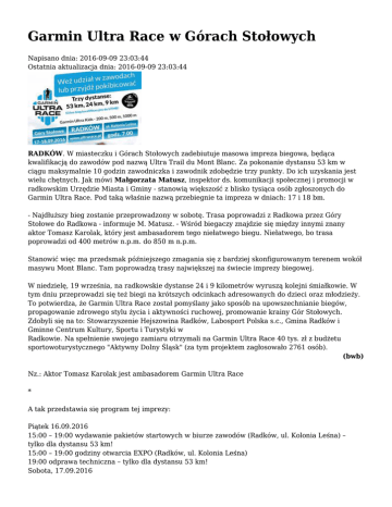 Garmin Ultra Race w Górach Stołowych Napisano dnia: 2016-09-09 23:03:44 Ostatnia aktualizacja dnia: 2016-09-09 23:03:44 RADKÓW. W miasteczku i Górach Stołowych zadebiutuje masowa impreza biegowa, będąca kwalifikacją do zawodów pod nazwą Ultra Trail du Mont Blanc. Za pokonanie dystansu 53 km w ciągu maksymalnie 10 godzin zawodniczka i zawodnik zdobędzie trzy punkty. Do ich uzyskania jest wielu chętnych. Jak mówi Małgorzata Matusz, inspektor ds. komunikacji społecznej i promocji w radkowskim Urzędzie Miasta i Gminy - stanowią większość z blisko tysiąca osób zgłoszonych do Garmin Ultra Race. Pod taką właśnie nazwą przebiegnie ta impreza w dniach: 17 i 18 bm. - Najdłuższy bieg zostanie przeprowadzony w sobotę. Trasa poprowadzi z Radkowa przez Góry Stołowe do Radkowa - informuje M. Matusz. - Wśród biegaczy znajdzie się między innymi znany aktor Tomasz Karolak, który jest ambasadorem tego niełatwego biegu. Niełatwego, bo trasa poprowadzi od 400 metrów n.p.m. do 850 m n.p.m. Stanowić więc ma przedsmak późniejszego zmagania się z bardziej skonfigurowanym terenem wokół masywu Mont Blanc. Tam poprowadzą trasy największej na świecie imprezy biegowej. W niedzielę, 19 września, na radkowskie dystanse 24 i 9 kilometrów wyruszą kolejni śmiałkowie. W tym dniu przeprowadzi się też biegi na krótszych odcinkach adresowanych do dzieci oraz młodzieży. To potwierdza, że Garmin Ultra Race został pomyślany jako sposób na upowszechnianie biegów, propagowanie zdrowego stylu życia i aktywności ruchowej, promowanie krainy Gór Stołowych. Zdobyli się na to: Stowarzyszenie Hejszowina Radków, Labosport Polska s.c., Gmina Radków i Gminne Centrum Kultury, Sportu i Turystyki w Radkowie. Na spełnienie swojego zamiaru otrzymali na Garmin Ultra Race 40 tys. zł z budżetu sportowoturystycznego "Aktywny Dolny Śląsk" (za tym projektem zagłosowało 2761 osób). (bwb) Nz.: Aktor Tomasz Karolak jest ambasadorem Garmin Ultra Race * A tak przedstawia się program tej imprezy: Piątek 16.09.2016 15:00 – 19:00 wydawanie pakietów startowych w biurze zawodów (Radków, ul. Kolonia Leśna) – tylko dla dystansu 53 km! 15:00 – 19:00 godziny otwarcia EXPO (Radków, ul. Kolonia Leśna) 19:00 odprawa techniczna – tylko dla dystansu 53 km! Sobota, 17.09.2016 06:00-19:00 godziny otwarcia EXPO (Radków, ul. Kolonia Leśna) 07:00 – start GARMIN Ultra Race, dystans 53 km (Radków, ul. Kolonia Leśna) 10:00 – 17:00 wydawanie pakietów startowych w biurze zawodów (Radków, ul. Kolonia Leśna) – dystanse 24 i 9 km oraz Garmin Ultra Kids ok. 12:30 pierwsi zawodnicy na mecie (Radków, ul. Kolonia Leśna) 17:00 zamknięcie trasy wyścigu 17:00 ceremonia dekoracji (Radków, ul. Kolonia Leśna) 18:00 odprawa techniczna – tylko dystans 24 km i 9 km Niedziela,18.09.2016 07:00 – 09:00 wydawanie pakietów startowych w biurze zawodów (Radków, ul. Kolonia Leśna) 07:00 – 15:00 godziny otwarcia EXPO (Radków, ul. Kolonia Leśna) 09:30 – start Garmin Ultra Kids 1-7 lat – bieg na 200 m 09:40 – start Garmin Ultra Kids 8-11 lat – bieg na 500 m 09:50 – start Garmin Ultra Kids 12-17 lat – bieg na 1000 m 10:00 start GARMIN Ultra Race, dystans 24 km (Radków, ul. Kolonia Leśna) 10:30 start GARMIN Ultra Race, dystans 9 km (Radków, ul. Kolonia Leśna) ok. 11:10 pierwsi zawodnicy na mecie, dystans 9 km (Radków, ul. Kolonia Leśna) 12:30 zamknięcie trasy – dystans 9 km ok. 12:30 pierwsi zawodnicy na mecie, dystans 24 km (Radków, ul. Kolonia Leśna) 15:00 zamknięcie trasy – dystans 24 km 15:00 ceremonia dekoracji (Radków, ul. Kolonia Leśna) 15:30 zakończenie GARMIN Ultra Race (Radków, ul. Kolonia Leśna)