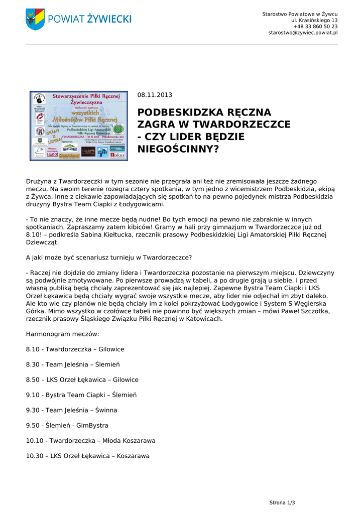 Starostwo Powiatowe w Żywcu ul. Krasińskiego 13 +48 33 860 50 23 [email protected] 08.11.2013 PODBESKIDZKA RĘCZNA ZAGRA W TWARDORZECZCE - CZY LIDER BĘDZIE NIEGOŚCINNY? Drużyna z Twardorzeczki w tym sezonie nie przegrała ani też nie zremisowała jeszcze żadnego meczu. Na swoim terenie rozegra cztery spotkania, w tym jedno z wicemistrzem Podbeskidzia, ekipą z Żywca. Inne z ciekawie zapowiadających się spotkań to na pewno pojedynek mistrza Podbeskidzia drużyny Bystra Team Ciapki z Łodygowicami. - To nie znaczy, że inne mecze będą nudne! Bo tych emocji na pewno nie zabraknie w innych spotkaniach. Zapraszamy zatem kibiców! Gramy w hali przy gimnazjum w Twardorzeczce już od 8.10! – podkreśla Sabina Kiełtucka, rzecznik prasowy Podbeskidzkiej Ligi Amatorskiej Piłki Ręcznej Dziewcząt. A jaki może być scenariusz turnieju w Twardorzeczce? - Raczej nie dojdzie do zmiany lidera i Twardorzeczka pozostanie na pierwszym miejscu. Dziewczyny są podwójnie zmotywowane. Po pierwsze prowadzą w tabeli, a po drugie grają u siebie. I przed własną publiką będą chciały zaprezentować się jak najlepiej. Zapewne Bystra Team Ciapki i LKS Orzeł Łękawica będą chciały wygrać swoje wszystkie mecze, aby lider nie odjechał im zbyt daleko. Ale kto wie czy planów nie będą chciały im z kolei pokrzyżować Łodygowice i System S Węgierska Górka. Mimo wszystko w czołówce tabeli nie powinno być większych zmian – mówi Paweł Szczotka, rzecznik prasowy Śląskiego Związku Piłki Ręcznej w Katowicach. Harmonogram meczów: 8.10 - Twardorzeczka – Gilowice 8.30 - Team Jeleśnia – Ślemień 8.50 – LKS Orzeł Łękawica – Gilowice 9.10 - Bystra Team Ciapki – Ślemień 9.30 - Team Jeleśnia – Świnna 9.50 - Ślemień - GimBystra 10.10 - Twardorzeczka – Młoda Koszarawa 10.30 – LKS Orzeł Łękawica – Koszarawa Strona 1/3 Starostwo Powiatowe w Żywcu ul. Krasińskiego 13 +48 33 860 50 23 [email protected] 10.50 - Gilowice - GimBystra 11.10 - LKS Orzeł Łękawica – Młoda Koszarawa 11.30 - GimBystra – Koszarawa 11.50 – LKS Orzeł Łękawica – System S Węgierska Górka 12.10 - Team Jeleśnia – Młoda Koszarawa 12.30 - Twardorzeczka – Świnna 12.50 - Bystra Team Ciapki – Młoda Koszarawa 13.10 - Ślemień – Wieprz 13.30 - Żywiec – Młoda Koszarawa 13.50 - Łodygowice – Bystra Team Ciapki 14.10 - Twardorzeczka – Żywiec 14.30 - Bystra Team Ciapki – Koszarawa 14.50 – Łodygowice – System S Węgierska Górka 15.10 - Świnna – Milówka 15.30 – Stowarzyszenie 16 Bielsko-Biała – Wieprz 15.50 – Łodygowice – Koszarawa 16.10 - Świnna - Rajcza 16.30 - System S Węgierska Górka – Ujsoły 16.50 - Wieprz – Rajcza 17.10 - Żywiec – Milówka 17.30 - Ujsoły – Rajcza 17.50 - Łodygowice – Stowarzyszenie 16 Bielsko-Biała 18.10 – Ujsoły – PTG Sokół w Gminie Czernichów 18.30 - Milówka – Stowarzyszenie 16 Bielsko-Biała 18.50 - PTG Sokół w Gminie Czernichów – Wieprz 19.10 - Ujsoły – Milówka 19.30 - PTG Sokół w Gminie Czernichów – Rajcza Strona 2/3 Starostwo Powiatowe w Żywcu ul. Krasińskiego 13 +48 33 860 50 23 [email protected] Podbeskidzka Liga Amatorska Piłki Ręcznej Dziewcząt rozgrywana jest pod honorowymi patronatami: Związku Piłki Ręcznej w Polsce Śląskiego Związku Piłki Ręcznej w Katowicach Marszałka Województwa Śląskiego Starosty Żywieckiego Andrzeja Zielińskiego Oficjalnymi sponsorami Podbeskidzkiej Ligi Amatorskiej Piłki Ręcznej Dziewcząt są: Firma Żywiec Zdrój Western Chicken – Kurczak w panierce z Żywca Stowarzyszenie Przedsiębiorców Ziemi Żywieckiej w Żywcu Biuro Rachunkowe Fiskus w Tresnej Kawiarnia-Restauracja DeKaffe Wiedeńska w Żywcu Ile jeszcze pozostało czasu do turnieju w Twardorzeczce? Tu można sprawdzić odliczanie czasu http://www.recznazywiecczyzna.ubf.pl/news.php?readmore=165 Strona 3/3 Powered by TCPDF (www.tcpdf.org)