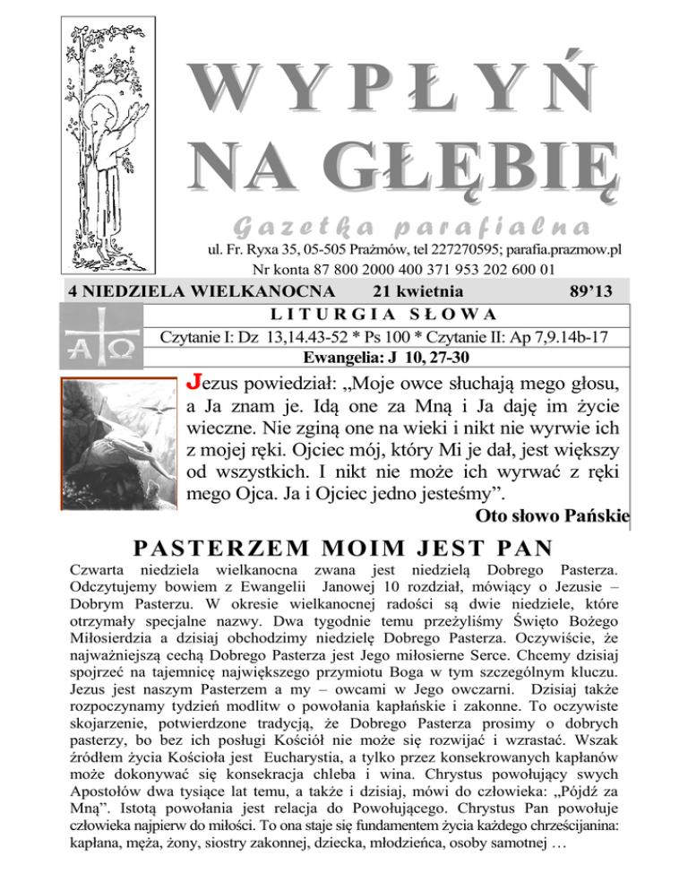 WYPŁYŃ NA GŁĘBIĘ Gazetka parafialna ul. Fr. Ryxa 35, 05-505 Prażmów, tel 227270595; parafia.prazmow.pl Nr konta 87 800 2000 400 371 953 202 600 01 4 NIEDZIELA WIELKANOCNA 21 kwietnia 89’13 LITURGIA SŁOWA Czytanie I: Dz 13,14.43-52 * Ps 100 * Czytanie II: Ap 7,9.14b-17 Ewangelia: J 10, 27-30 Jezus powiedział: „Moje owce słuchają mego głosu, a Ja znam je. Idą one za Mną i Ja daję im życie wieczne. Nie zginą one na wieki i nikt nie wyrwie ich z mojej ręki. Ojciec mój, który Mi je dał, jest większy od wszystkich. I nikt nie może ich wyrwać z ręki mego Ojca. Ja i Ojciec jedno jesteśmy”. Oto słowo Pańskie PASTERZEM MOIM J EST PAN Czwarta niedziela wielkanocna zwana jest niedzielą Dobrego Pasterza. Odczytujemy bowiem z Ewangelii Janowej 10 rozdział, mówiący o Jezusie – Dobrym Pasterzu. W okresie wielkanocnej radości są dwie niedziele, które otrzymały specjalne nazwy. Dwa tygodnie temu przeżyliśmy Święto Bożego Miłosierdzia a dzisiaj obchodzimy niedzielę Dobrego Pasterza. Oczywiście, że najważniejszą cechą Dobrego Pasterza jest Jego miłosierne Serce. Chcemy dzisiaj spojrzeć na tajemnicę największego przymiotu Boga w tym szczególnym kluczu. Jezus jest naszym Pasterzem a my – owcami w Jego owczarni. Dzisiaj także rozpoczynamy tydzień modlitw o powołania kapłańskie i zakonne. To oczywiste skojarzenie, potwierdzone tradycją, że Dobrego Pasterza prosimy o dobrych pasterzy, bo bez ich posługi Kościół nie może się rozwijać i wzrastać. Wszak źródłem życia Kościoła jest Eucharystia, a tylko przez konsekrowanych kapłanów może dokonywać się konsekracja chleba i wina. Chrystus powołujący swych Apostołów dwa tysiące lat temu, a także i dzisiaj, mówi do człowieka: „Pójdź za Mną”. Istotą powołania jest relacja do Powołującego. Chrystus Pan powołuje człowieka najpierw do miłości. To ona staje się fundamentem życia każdego chrześcijanina: kapłana, męża, żony, siostry zakonnej, dziecka, młodzieńca, osoby samotnej … 1 „Pójdź za Mną” – to zaproszenie w relację miłości. Wchodzimy do owczarni Dobrego Pasterza przez łaskę Chrztu świętego. Ale trwamy w Jego owczarni i budujemy wspólnotę wiary i miłości tylko wówczas, gdy „słuchamy Jego głosu i za Nim idziemy” (por. J 10, 27). Dobry Pasterz – Miłosierny Jezus daje nam dzisiaj obietnicę, iż nie tylko troszczy się o „tu i teraz” swoich owiec ale wiedzie nas ku życiu wiecznemu. Perspektywa wieczności i spraw ostatecznych coraz mniej zajmuje miejsca w świadomości współczesnego człowieka. Nawet wierzący bardziej skupiają się na sprawach doczesnych, widząc dobro tylko w płaszczyźnie socjalnej. Dlatego często człowiek, który uważa się za chrześcijanina nie przejmuje się za bardzo pogłębianiem i pielęgnowaniem więzi wiary łączącej go z Chrystusem. Można powiedzieć, że jest coraz więcej niewierzących chrześcijan, którzy przestali powierzać się Jezusowi z ufnością i pokorą. Uważają się za chrześcijan traktując bardzo subiektywnie i wybiórczo zasady Ewangelii i nauczanie Kościoła. Pan Jezus nie pozostawia tu żadnej wątpliwości: „Moje owce słuchają mego głosu”. Tylko wtedy jestem naprawdę w owczarni Pana Jezusa. Słuchać i być posłusznym – to jest postawa prawdziwej wiary i tylko wtedy pozwalamy się prowadzić na pastwiska Bożych obietnic. Jestem w owczarni Dobrego Pasterza. Czy zawsze Go słucham, czy znam Jego głos pośród zgiełku świata, czy idę za Nim także wtedy, gdy droga trudna, wąska i pod górę. Święty Augustyn wiele lat błądził po bezdrożach grzechu, by wreszcie usłyszeć Chrystusowe: „Pójdź za Mną”. Odkrył, że jest kochany, że Miłosierny wszystko mu wybaczył i na tę powołującą miłość Zbawiciela wielkodusznie odpowiedział. Tak pisze o miłości, czerpiąc wiedzę ze swoich doświadczeń: „Nie ma człowieka, który by nie kochał, lecz wolno spytać, co kocha? Nie każe się nam porzucać miłości, ale wybrać przedmiot naszej miłości. Lecz cóż możemy wybrać, jeśli nie zostaliśmy wybrani? O tym, że nie miłujemy, jeżeli wpierw nie zostaliśmy umiłowani, mówi nam apostoł Jan: „My miłujemy, ponieważ Bóg sam pierwszy nas umiłował". Spytaj, skąd bierze się w człowieku miłość do Boga, a nie znajdziesz innej odpowiedzi niż ta, że Bóg pierwszy go umiłował. Samego siebie dał nam Bóg do umiłowania, dał nam także to, przez co możemy Go miłować. Czym jest jednak to, przez co Go miłujemy, mówi nam jasno święty Paweł: „A Miłość Boża jest rozlana w naszych sercach". A kto ją tam rozlał? Może my sami? O nie! A więc, skąd pochodzi? „Przez Ducha Świętego, który został nam dany". Mając więc tę ufność, miłujmy Boga Jego miłością. Posłuchajmy, co o tym jeszcze jaśniej mówi Jan Apostoł: „Bóg jest miłością, kto trwa w miłości, trwa w Bogu, a Bóg trwa w nim". Nie wystarcza powiedzieć: „Miłość jest z Boga". Ale kto z nas ośmieliłby się powiedzieć to, co mówi Jan: „Bóg jest miłością". Ten, kto tak mówił, wiedział, co miał w swoim sercu. A więc Bóg daje się nam całkowicie. Woła do nas: „Miłujcie Mnie, a będziecie Mnie posiadali, bo nie możecie Mnie miłować, jeśli Mnie nie posiadacie". (św. Augustyn, Godz. Czyt., Wtorek, 3 Tydz. Wielkanocny). Miłość jednoczy i upodabnia do osoby kochanej. Chrystus stał się do nas podobny we wszystkim oprócz grzechu. On, Wielki Pasterz, stał się bezbronnym Barankiem, aby być „Bogiem z nami”, aby doświadczyć naszej doli i poprowadzić nas na żyzne pastwiska swojej łaski. Święty Jan w swej wizji czytanej dzisiaj w Liturgii Słowa, tak opisuje rzeczywistość nieba: „Nie będą już łaknąć ani nie będą już pragnąć, i nie porazi ich słońce ani żaden upał, bo paść ich będzie Baranek, który jest w pośrodku 2 tronu, i poprowadzi ich do źródeł wód życia i ka