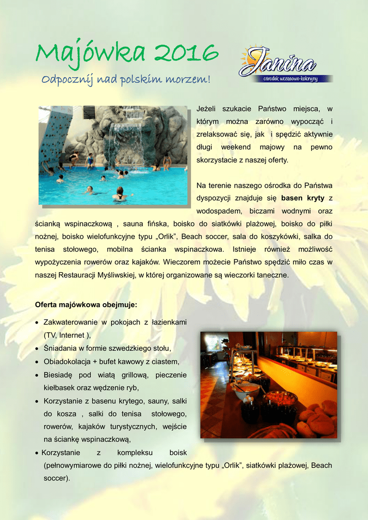Majówka 2016 Odpocznij nad polskim morzem! Jeżeli szukacie Państwo miejsca, w którym można zarówno wypocząć i zrelaksować się, jak i spędzić aktywnie długi weekend majowy na pewno skorzystacie z naszej oferty. Na terenie naszego ośrodka do Państwa dyspozycji znajduje się basen kryty z wodospadem, biczami wodnymi oraz ścianką wspinaczkową , sauna fińska, boisko do siatkówki plażowej, boisko do piłki nożnej, boisko wielofunkcyjne typu „Orlik”, Beach soccer, sala do koszykówki, salka do tenisa stołowego, mobilna ścianka wspinaczkowa. Istnieje również możliwość wypożyczenia rowerów oraz kajaków. Wieczorem możecie Państwo spędzić miło czas w naszej Restauracji Myśliwskiej, w której organizowane są wieczorki taneczne. Oferta majówkowa obejmuje: Zakwaterowanie w pokojach z łazienkami (TV, Internet ), Śniadania w formie szwedzkiego stołu, Obiadokolacja + bufet kawowy z ciastem, Biesiadę pod wiatą grillową, pieczenie kiełbasek oraz wędzenie ryb, Korzystanie z basenu krytego, sauny, salki do kosza , salki do tenisa stołowego, rowerów, kajaków turystycznych, wejście na ściankę wspinaczkową, Korzystanie z kompleksu boisk (pełnowymiarowe do piłki nożnej, wielofunkcyjne typu „Orlik”, siatkówki plażowej, Beach soccer). W najbliższej okolicy warto odwiedzić: (Oferujemy pomoc przy organizacji wycieczek) ▪ Słowiński Park Narodowy, ruchome wydmy ▪ Park Dinozaurów (www.lebapark.pl) ▪ Fokarium (www.seapark.pl) ▪ Skansen Słowińców w Klukach (w dniach 01.05 – 03.05 obywać się będzie "Czarne Wesele") ▪ Latarnia Morska w Stilo ▪ Stadniny koni, jezioro Sarbsko(200m) Kontakt Wszelkie informacje oraz rezerwacje Koszt pobytu +48 696 423 562 lub [email protected] Osoba dorosła - 100 zł za dobę dzieci do lat 3 - bezpłatnie Dane do przelewu: dzieci od 3 lat do 7 lat - 50% ceny P.U.H „JK” dzieci od 8 lat do 17 lat - 80% ceny Nowęcin ul. Łebska 13 84-360 Łeba 83 2490 0005 0000 4500 1578 2724 Więcej informacji oraz galeria zdjęć na stronach: www.leba-janina.pl www.facebook.com/lebajanina