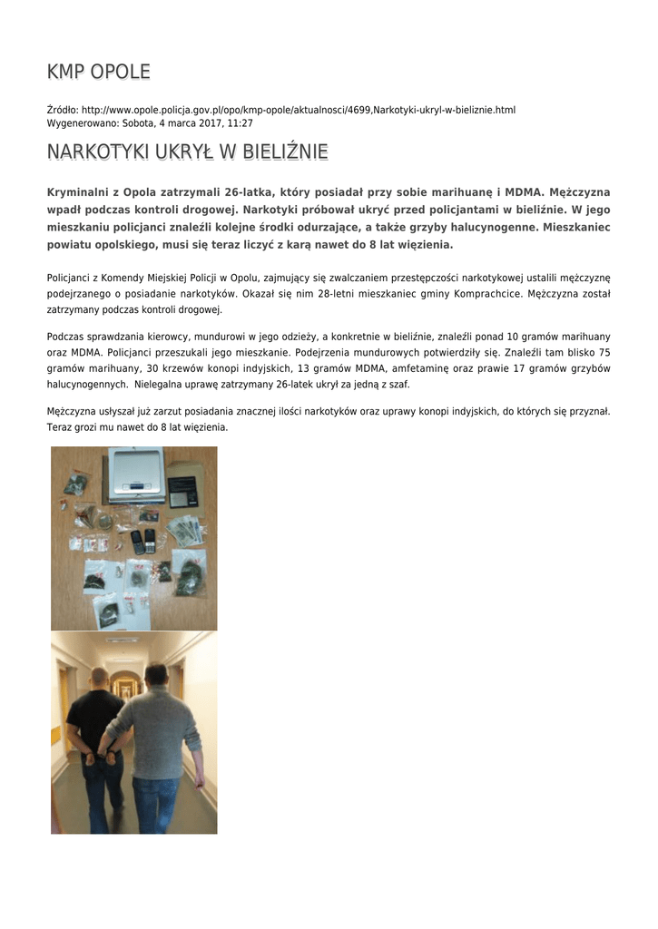 KMP OPOLE Źródło: http://www.opole.policja.gov.pl/opo/kmp-opole/aktualnosci/4699,Narkotyki-ukryl-w-bieliznie.html Wygenerowano: Sobota, 4 marca 2017, 11:27 NARKOTYKI UKRYŁ W BIELIŹNIE Kryminalni z Opola zatrzymali 26-latka, który posiadał przy sobie marihuanę i MDMA. Mężczyzna wpadł podczas kontroli drogowej. Narkotyki próbował ukryć przed policjantami w bieliźnie. W jego mieszkaniu policjanci znaleźli kolejne środki odurzające, a także grzyby halucynogenne. Mieszkaniec powiatu opolskiego, musi się teraz liczyć z karą nawet do 8 lat więzienia. Policjanci z Komendy Miejskiej Policji w Opolu, zajmujący się zwalczaniem przestępczości narkotykowej ustalili mężczyznę podejrzanego o posiadanie narkotyków. Okazał się nim 28-letni mieszkaniec gminy Komprachcice. Mężczyzna został zatrzymany podczas kontroli drogowej. Podczas sprawdzania kierowcy, mundurowi w jego odzieży, a konkretnie w bieliźnie, znaleźli ponad 10 gramów marihuany oraz MDMA. Policjanci przeszukali jego mieszkanie. Podejrzenia mundurowych potwierdziły się. Znaleźli tam blisko 75 gramów marihuany, 30 krzewów konopi indyjskich, 13 gramów MDMA, amfetaminę oraz prawie 17 gramów grzybów halucynogennych. Nielegalna uprawę zatrzymany 26-latek ukrył za jedną z szaf. Mężczyzna usłyszał już zarzut posiadania znacznej ilości narkotyków oraz uprawy konopi indyjskich, do których się przyznał. Teraz grozi mu nawet do 8 lat więzienia. Ocena: 0/5 (0) Tweetnij zabezpieczone narkotyki