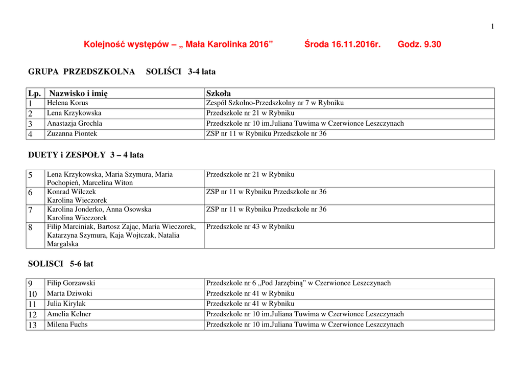 1 Kolejność występów – „ Mała Karolinka 2016” GRUPA PRZEDSZKOLNA Lp. 1 2 3 4 Środa 16.11.2016r. Godz. 9.30 SOLIŚCI 3-4 lata Nazwisko i imię Szkoła Helena Korus Lena Krzykowska Anastazja Grochla Zuzanna Piontek Zespół Szkolno-Przedszkolny nr 7 w Rybniku Przedszkole nr 21 w Rybniku Przedszkole nr 10 im.Juliana Tuwima w Czerwionce Leszczynach ZSP nr 11 w Rybniku Przedszkole nr 36 DUETY i ZESPOŁY 3 – 4 lata 5 6 7 8 Lena Krzykowska, Maria Szymura, Maria Pochopień, Marcelina Witon Konrad Wilczek Karolina Wieczorek Karolina Jonderko, Anna Osowska Karolina Wieczorek Filip Marciniak, Bartosz Zając, Maria Wieczorek, Katarzyna Szymura, Kaja Wojtczak, Natalia Margalska Przedszkole nr 21 w Rybniku ZSP nr 11 w Rybniku Przedszkole nr 36 ZSP nr 11 w Rybniku Przedszkole nr 36 Przedszkole nr 43 w Rybniku SOLISCI 5-6 lat 9 10 11 12 13 Filip Gorzawski Marta Dziwoki Julia Kirylak Amelia Kelner Milena Fuchs Przedszkole nr 6 „Pod Jarzębiną” w Czerwionce Leszczynach Przedszkole nr 41 w Rybniku Przedszkole nr 41 w Rybniku Przedszkole nr 10 im.Juliana Tuwima w Czerwionce Leszczynach Przedszkole nr 10 im.Juliana Tuwima w Czerwionce Leszczynach 2 14 15 16 17 18 Maja Feliks Hanna Gwoka Maja Juszczakiewicz Patrycja Sekta Jan Kowol Oddział Przedszkolny przy SP w Stanowicach ZSP nr 11 w Rybniku Przedszkole nr 36 Przedszkole nr 22 w Rybniku Przedszkole nr 22 w Rybniku MOK Czerwionka – Leszczyny, Świetlica w Bełku DUETY i ZESPOŁY 19 20 21 22 23 24 25 26 27 28 Edyta Warzecha, Martyna Kubasa Nadia Kranc, Natalia Kisiel Hanna Krawczyk, Magdalena Juraszczyk Oskar Kowalski, Filip Czesuła, Alan Stefunyn, Kacper Koza, Dorota Siekaniec Zuzana Stabla, Maja Pelczar Magdalena Siekaniec Martyna Ganiek, Oliwia Nosiadek Wiktor Kozik Paulina Niewęgłowska, Oliwia Cipcer Amelia Pochopień, Eliza Pakuła Julia Gawrońska, Milena Grzenik Gabriela Pachucy Oskar Majdanik, Ignacy Socki, Bartek Piełka, Aleksandra Kupczyk, Barbara Kościuszko, Lena Stolarczuk Paulina Grzegorzek, Martyna Lasia, Eliza Sokalska, Rafał Kurpanik, Paweł Czerwiński, Paweł Jasiulek MOK Czerwionka – Leszczyny, Świetlica w Bełku Przedszkole nr 15 w Rybniku Przedszkole nr 21 w Rybniku ZSP nr 11 w Rybniku Przedszkole nr 36 ZSP nr 11 w Rybniku Przedszkole nr 36 Przedszkole nr 21 w Rybniku Przedszkole nr 21 w Rybniku Przedszkole nr 11 w Rybniku Przedszkole nr 14 im. Jana Korczaka w Rybniku Szkoła Podstawowa im Stefana Żeromskiego w Palowicach 3 Kolejność występów – „ Karolinka 2016” SZKOŁA PODSTAWOWA I – III 29 30 31 32 33 34 35 Środa 16.11.2016r. SOLIŚCI Paulina Olejak Maksymilian Sikora Hanna Hanusek Kamil Konsek Marta Podleśny Emilia Tobiczyk Julia Krótki Szkoła Podstawowa nr 19 w Rybniku Ognisko Pracy Pozaszkolnej - Zespół „Przygoda” Szkoła Podstawowa nr 19 w Rybniku Szkoła Podstawowa nr 18 w Rybniku Zespół Szkolno-Przedszkolny nr 12 w Rybniku Ognisko Pracy Pozaszkolnej - Zespół „Przygoda” Szkoła Podstawowa nr 20 w Rybniku DUETY i ZESPOŁY 36 37 38 Sara Piecha, Dominika Niesłańczyk, Jakub Gansiniec Marta Podleśny, Martyna Guzy, Justyna Grzondziel, Łukasz Radecki, Paweł Bluszcz, Dominik Gibas, Emilia Zielonka, Anna Gacek Zespół wokalno instrumentalny Szkoła Podstawowa nr 19 w Rybniku Zespół Szkolno-Przedszkolny nr 12 w Rybniku Zespół Szkolno – Przedszkolny w Pawłowie Kl. IV – VI SOLIŚCI 39 40 41 42 43 44 Jan Bizgwa Zofia Romaniuk - Demonchaux Zuzanna Kondrot Daria Prządkiewicz Zofia Brząkalik Nikola Kruk Szkoła podstawowa nr 21 w Rybniku Szkoła Podstawowa nr 12 w Rybniku Szkoła Podstawowa Sióstr Urszulanek w Rybniku POPP przy SP Jejkowice Ognisko Pracy Pozaszkolnej - Zespół „Przygoda” Zespół Szkolno Przedszkolny nr 11 w Rybniku Godz. 11.00 4 45 46 47 Anna Majka Julia Hajduk Natalia Bernard Szkoła Podstawowa nr 5 w Rybniku POPP przy Szkole Podstawowej w Stanowicach POPP przy Szkole Podstawowej w Stanowicach DUETY i ZESPOŁY 48 49 50 51 Anna Metryka, Kasper Borczykowski Anna Wojaczek, Wiktoria Zielonka Zespół wokalno -instrumentalny „Trzynastka” Ognisko Pracy Pozaszkolnej - Zespół „Przygoda” Szkoła Podstawowa im. Jana III Sobieskiego w Jejkowicach Szkoła Podstawowa w Raszczycach Szkoła Podstawowa nr 13 w Rybniku 5 Kolejność występów – „ Mała Karolinka 2016” Czwartek 17.11.2016 GRUPA PRZEDSZKOLNA SOLIŚCI 3-4 lata Lp. Nazwisko i imię Aleksander Wasela 1 Szkoła Zespół Szkolno- Przedszkolny nr 4 w Rybniku SOLISCI 5-6 lat 2 3 4 5 Julia Kirylak Fojcik Laura Liliana Gaszka Barbara Cebula Ognisko Pracy Pozaszkolnej - Zespół „Przygoda” Zespół Szkolno- Przedszkolny nr 4 w Rybniku Ognisko Pracy Pozaszkolnej - Zespół „Przygoda” Ognisko Pracy Pozaszkolnej - Zespół „Przygoda” DUETY i ZESPOŁY 6 7 Karol Miera, Maciej Zimoń Alicja Honisz,Wojciech Fojcik, Laura Kąsek, Maciej Smyczek, Ewelina Szafraniec, Filip Piazdecki Zespół Szkolno- Przedszkolny nr 4 w Rybniku Zespół Szkolno- Przedszkolny nr 4 w Rybniku Kolejność występów – „ Karolinka 2016” SZKOŁA PODSTAWOWA I – III 8 9 10 Zuzanna Horny Wiktor Szweda Zuzanna Okseniuk Czwartek 17.11.2016r. SOLIŚCI Ognisko Pracy Pozaszkolnej - Zespół „Przygoda” Szkoła Podstawowa w Palowicach POPP przy SP8 w Czerwionce-Leszczynach godz. 9. 30 6 DUETY i ZESPOŁY 11 12 13 Patrycja Mentel, Michał Mentel Daria Kuczera, Milena Wasela Zespół „Ósemeczka” Zespół Szkolno – Przedszkolny nr 4 w Rybniku Zespół Szkolno – Przedszkolny nr 4 w Rybniku Zespół Szkolno – Przedszkolny z Oddziałami Integracyjnymi nr 1 w Rybniku SZKOŁA PODSTAWOWA IV – VI SOLIŚCI 14 15 16 17 18 19 20 Anna Pawliczek Matylda Wajner Julia Gatnar Marta Filec Wiktoria Gaszka Dawid Sikora Michał Słupik ok. godz. 10.30 ZSP nr 15 w Rybniku Ognisko Pracy Pozaszkolnej - Zespół „Przygoda” Zespół Szkolno Przedszkolny w Rydułtowach Szkoła Podstawowa nr 2 Szkoła Podstawowa nr 1 z Oddziałami Integracyjnymi im. Janusza Korczaka w Rybniku Zespół Szkolno – Przedszkolny nr 15 w Rybn