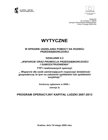 Załącznik do Uchwały nr 169/09 Zarządu Województwa Małopolskiego z dnia 19 lutego 2009 roku WYTYCZNE W SPRAWIE UDZIELANIA POMOCY NA ROZWÓJ PRZEDSIĘBIORCZOŚCI DZIAŁANIE 6.2 „WSPARCIE ORAZ PROMOCJA PRZEDSIĘBIORCZOŚCI I SAMOZATRUDNIENIA” TYP I realizowanych operacji: „ Wsparcie dla osób zamierzających rozpocząć działalność gospodarczą /w tym na założenie spółdzielni lub spółdzielni socjalnej/.” Konkursy ogłaszane w 2008 r. (wersja 2) PROGRAM OPERACYJNY KAPITAŁ LUDZKI 2007-2013 Kraków, dnia 19 lutego 2009 roku SPIS TREŚCI 1 CEL WSPARCIA REALIZOWANEGO W RAMACH DZIAŁANIA 6.2 POKL. .................................. 3 2 ZASADY UDZIELANIA WSPARCIA W RAMACH DZIAŁANIA 6.2................................................... 3 3 TYPY REALIZOWANYCH PROJEKTÓW. ............................................................................................. 3 4 SZCZEGÓŁOWE WYMAGANIA WOBEC BENEFICJENTÓW (PROJEKTODAWCÓW) I BENEFICJENTÓW POMOCY (UCZESTNIKÓW PROJEKTU) W RAMACH TYPU I DZIAŁANIA 6.2. 4 4.1 WYMAGANIA WOBEC BENEFICJENTÓW (PROJEKTODAWCÓW)................................................................. 4 4.1.1 Obowiązki Beneficjenta (Projektodawcy). ......................................................................................... 4 4.2 BENEFICJENCI POMOCY (UCZESTNICY PROJEKTU).................................................................................... 6 4.2.1 Rekrutacja uczestników projektu........................................................................................................ 7 5 ZASADY REALIZACJI PROJEKTU W RAMACH TYPU I DZIAŁANIA 6.2 PRZEZ BENEFICJENTA..................................................................................................................................................... 8 5.1 5.2 WSPARCIE SZKOLENIOWO-DORADCZE ..................................................................................................... 9 PRZYZNANIE ŚRODKÓW FINANSOWYCH NA ROZWÓJ PRZEDSIĘBIORCZOŚCI DLA WYBRANYCH UCZESTNIKÓW PROJEKTU, KTÓRZY PO OTRZYMANIU INFORMACJI O MOŻLIWOŚCI PRZYZNANIA DOFINANSOWANIA ZAREJESTROWALI DZIAŁALNOŚĆ GOSPODARCZĄ W EWIDENCJI DZIAŁALNOŚCI GOSPODARCZEJ LUB ZAREJESTROWALI SPÓŁDZIELNIĘ/SPÓŁDZIELNIĘ SOCJALNĄ W REJESTRZE PRZEDSIĘBIORCÓW KRAJOWEGO REJESTRU SĄDOWEGO (KRS). .............................................................................................................................. 9 5.3 PRZYZNANIE WSPARCIA POMOSTOWEGO W OKRESIE DO 6, A W UZASADNIONYCH PRZYPADKACH DO 12 MIESIĘCY OD DNIA ROZPOCZĘCIA DZIAŁALNOŚCI GOSPODARCZEJ (WYŁĄCZNIE DLA OSÓB, KTÓRE ROZPOCZĘŁY DZIAŁALNOŚĆ W RAMACH DANEGO PROJEKTU).................................................................................................... 10 6 OCENA BIZNES PLANÓW ORAZ PRZYZNANIE PRZEZ BENEFICJENTA ŚRODKÓW NA ROZWÓJ PRZEDSIĘBIORCZOŚCI.................................................................................................................. 11 7 POMOC DE MINIMIS ................................................................................................................................ 13 7.1 7.2 7.3 DOPUSZCZALNOŚĆ POMOCY DE MINIMIS................................................................................................ 13 POMOC PUBLICZNA W PROJEKCIE BENEFICJENTA.................................................................................. 14 OBOWIĄZKI BENEFICJENTA W ZAKRESIE UDZIELONEJ POMOCY PUBLICZNEJ. ........................................ 15 ZAŁĄCZNIKI. ........................................................................................................................................................ 15 2 1 Cel wsparcia realizowanego w ramach Działania 6.2 POKL. Celem wsparcia realizowanego w ramach Działania 6.2 PO KL jest promowanie postaw kreatywnych i przedsiębiorczych oraz wspieranie rozwiązań i inicjatyw służących tworzeniu nowych miejsc pracy w obszarze przedsiębiorczości i samozatrudnienia. Dla realizacji tego celu przewidziany został m.in.: zestaw form wsparcia i instrumentów adresowanych do osób fizycznych zamierzających rozpocząć działalność gospodarczą (w tym w formie spółdzielni lub spółdzielni socjalnej), obejmujący wsparcie doradcze i szkoleniowe, przyznanie środków finansowych na rozwój przedsiębiorczości, a także możliwość uzyskania wsparcia pomostowego o charakterze doradczym i finansowym przez okres do 6, a w uzasadnionych przypadkach do 12 miesięcy od dnia rozpoczęcia działalności gospodarczej. Wsparcie przewidziane w ramach Działania 6.2 stanowi uzupełnienie dla pozostałych działań aktywizacyjno-zawodowych realizowanych w ramach Priorytetu VI, a także dla działań wspierających rozwój przedsiębiorczości podejmowanych w ramach Priorytetu II i VIII PO KL. 2 Zasady udzielania wsparcia w ramach Działania 6.2. W ramach Działania 6.2 przewidziany został kompleksowy zestaw form wsparcia służących rozwojowi przedsiębiorczości, obejmujący: pomoc szkoleniowo-doradczą, przyznanie środków finansowych na rozwój przedsiębiorczości, wsparcie pomostowe jak również upowszechnianie najbardziej efektywnych i innowacyjnych rozwiązań w postaci dobrych praktyk, a także promocję przedsiębiorczości poprzez kampanie promocyjno-informacyjne. W celu zapewnienia trwałości i operacyjności realizowanych przedsięwzięć z zakresu wsparcia dla osób zamierzających rozpocząć działalność gospodarczą, opracowane zostały „Wytyczne w sprawie udzielania pomocy na rozwój przedsiębiorczości” określające wymagania dotyczące Beneficjentów (Projektodawców), typu i zakresu tematycznego projektów, uczestników projektów (Beneficjentów pomocy) oraz szczegółowych zasad przyznawania im wsparcia. 3 Typy realizowanych projektów. Projekty realizowane w ramach Działania 6.2 mogą obejmować wszystkie wymienione poniżej typy operacji, przy czym niniejsze Wytyczne reguluj