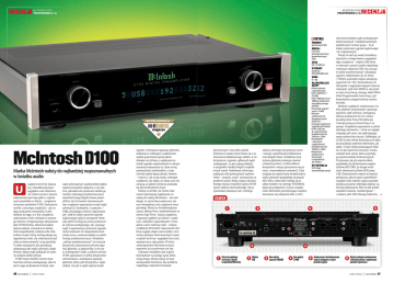 D100 RECENZJA MCINTOSH PRZETWORNIK C/A MCINTOSH D100 PRZETWORNIK C/A DETALE McIntosh D100 Marka McIntosh należy do najbardziej rozpoznawalnych w światku audio rządzenia tej firmy kojarzą się z charakterystycznym wyglądem oraz niekoniecznie niskimi cenami. Sporym zaskoczeniem jest więc jeden z najnowszych produktów w ofercie – urządzenie oznaczone symbolem D100. Zaskoczenie wynika z ceny tego urządzenia – jak na tego producenta niewysokiej. A jeśli dodamy do tego, iż w tym urządzeniu wykorzystano wiele rozwiązań z topowego obecnie, zintegrowanego odtwarzacza płyt CD McIntosha, zdziwienie będzie jeszcze większe. Oczywiście to bardzo miła niespodzianka, zwłaszcza dla miłośników muzyki, którzy kochają design tej legendarnej marki, ale niekoniecznie byli sobie w stanie pozwolić na jej produkty. To także rozwiązanie dla posiadaczy odtwarzaczy bez wejść cyfrowych, dzięki któremu będą mogli podłączyć do systemu kolejne źródła cyfrowe. D100 można określić mianem przetwornika cyfrowo-analogowego, jako że jest to jego podstawowa funkcja, więc U 46 HI-FI CHOICE | HOME CINEMA część potencjalnych użytkowników będzie zapewne korzystać wyłącznie z niej właśnie, jednakże sam producent określa go mianem cyfrowego przedwzmacniacza stereofonicznego (digital stereo preamplifier). Jest to bowiem sterowane pilotem urządzenie wyposażone w pięć wejść cyfrowych (2 koaksjalne, 2 optyczne, 1 USB), posiadające zarówno regulowane, jak i stałe (o stałym poziomie sygnału wyjściowego) wyjścia analogowe. Może więc pełnić funkcję po prostu przetwornika cyfrowo-analogowego, ale, używając wyjść z regulowanym poziomem sygnału, można sterować nim bezpośrednio końcówką mocy, a wówczas będzie on pełnił funkcję przedwzmacniacza. Określenie „cyfrowy przedwzmacniacz” nie oznacza bynajmniej zastosowania cyfrowej regulacji głośności, a jedynie fakt, iż nie ma tu analogowych wejść, a jedynie cyfrowe. D100 wyposażono w pełną sekcję przedwzmacniacza, z analogową regulacją głośności, która, jeśli korzystamy z wyjść stałych, nie jest w ogóle częścią ścieżki sygnału. Analogowa regulacja głośności, zwłaszcza w niedrogich urządzeniach, zwykle gwarantuje wyższą jakość dźwięku niż cyfrowa, a wyłączanie ze ścieżki sygnału niepotrzebnych w danym momencie elementów to z kolei mniej potencjalnych zniekształceń, a więc również zwykle lepszy dźwięk. Słowem – może to i, jak na tę markę, niedrogie urządzenie, ale widać, że niższa cena nie oznacza, że jakość brzmienia przestała się dla konstruktorów liczyć. Patrząc na D100, nie można mieć nawet najmniejszej wątpliwości, że należy do rodziny McIntosha – ten sam design, ta sama klasa wykonania, ten sam niewątpliwy urok urządzenia vintage’owego. Mamy tu charakterystyczny czarny, szklany front z podświetlanym na zielono logo firmy i nazwą urządzenia, z typowymi gałkami po bokach i czytelnym, niebieskim wyświetlaczem. To też jedna z cech/zalet tej marki – kolejne urządzenia McIntosha mają zawsze określony wygląd, dzięki czemu każde z nich można postawić obok dowolnych innych urządzeń tej firmy i wyglądem bez trudu wpasuje się w cały system. W końcu nawet gramofon McIntosha można rozpoznać już na pierwszy rzut oka. Ciekawym dodatkiem jest wyjście słuchawkowe na dużego jacka, które, swoją drogą, oferuje więcej niż przyzwoitą jakość brzmienia, bez problemu napędzając większość słuchawek wejścia cyfrowego korzystamy (numer i nazwę), częstotliwość próbkowania oraz długość słowa. Dodatkowo przy zmianie głośności pokazuje również ustawiony poziom, a także ułatwia korzystanie z setupu (poruszania się po menu i wprowadzania ustawień). Z tyłu znajduje się wspomniany komplet pięciu wejść cyfrowych (przydałoby się jeszcze AES/EBU, nawet jeśli miałoby się to odbyć kosztem np. jednego TOSLINKA), złącza do połączenia z innymi urządzeniami McIntosha (umożliwiające wspólne sterowanie czy włączanie kilku z nich) dynamicznych. Owa dobra jakość brzmienia w dużej mierze bierze się z zastosowania dedykowanego układu, a nie korzystania z sygnału z głównych wyjść analogowych, co jest częstą praktyką w przypadku niezbyt drogich urządzeń innych marek. Dodatkowa informacja praktyczna dla potencjalnych użytkowników – przycisk „mute” umieszczony na przednim panelu blisko wyjścia słuchawkowego wycisza wszystkie wyjścia D100 oprócz właśnie słuchawkowego. Spory wyświetlacz pokazuje nam, z którego ZŁĄCZA 1 3 urządzeniami McIntosha 2 Wejście USB oraz dwa komplety wyjść analogowych: zbalansowanych i niezbalansowanych, podzielonych na dwie grupy – te ze stałym poziomem sygnału wyjściowego i te z regulowanym. Proszę nie dać się zwieść charakterystycznemu vintage’owemu wyglądowi tego urządzenia – wejście USB, które w obecnych czasach zwykle najbardziej interesuje nabywców DAC-ów, pracuje w trybie asynchronicznym i akceptuje sygnał o rozdzielczości do 32 bitów i 192kHz; pozostałe wejścia akceptują sygnał do 24/192. Konstruktorzy nie skorzystali z najpopularniejszych obecnie rozwiązań, czyli kości XMOS-a, ale poszli w nieco inną stronę, stosując układ FPGA (Field Programmable Gate Array, czyli bezpośrednio programowalną macierz bramek). Wnętrze urządzenia rozplanowano na kilku płytkach drukowanych, separując zasilanie, część cyfrową i analogową. Główny przetwornik D/A to ośmiokanałowa kość firmy ESS Sabre (po 4 kanały pracują na kanał lewy i na prawy). Urządzenie wyposażono w pilota zdalnego sterowania – może nie najpiękniejszego jaki znam, ale spełniającego swoje zadanie bez zarzutu. Zakładając, że D100 ma być ofertą skierowaną nie tylko do posiadaczy systemów McIntosha, ale także i innych osób poszukujących DACów na tym poziomie cenowym, można wskazać dwie rzeczy, które 