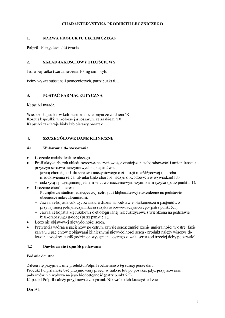 CHARAKTERYSTYKA PRODUKTU LECZNICZEGO 1. NAZWA PRODUKTU LECZNICZEGO Polpril 10 mg, kapsułki twarde SKŁAD JAKOŚCIOWY I ILOŚCIOWY 2. Jedna kapsułka twarda zawiera 10 mg ramiprylu. Pełny wykaz substancji pomocniczych, patrz punkt 6.1. POSTAĆ FARMACEUTYCZNA 3. Kapsułki twarde. Wieczko kapsułki: w kolorze ciemnozielonym ze znakiem ‘R’ Korpus kapsułki: w kolorze jasnoszarym ze znakiem ’10’ Kapsułki zawierają biały lub białawy proszek. 4. SZCZEGÓŁOWE DANE KLINICZNE 4.1 Wskazania do stosowania • • • • • Leczenie nadciśnienia tętniczego. Profilaktyka chorób układu sercowo-naczyniowego: zmniejszenie chorobowości i umieralności z przyczyn sercowo-naczyniowych u pacjentów z: − jawną chorobą układu sercowo-naczyniowego o etiologii miażdżycowej (choroba niedokrwienna serca lub udar bądź choroba naczyń obwodowych w wywiadzie) lub − cukrzycą i przynajmniej jednym sercowo-naczyniowym czynnikiem ryzyka (patrz punkt 5.1). Leczenie chorób nerek: − Początkowe stadium cukrzycowej nefropatii kłębuszkowej stwierdzone na podstawie obecności mikroalbuminurii. − Jawna nefropatia cukrzycowa stwierdzona na podstawie białkomoczu u pacjentów z przynajmniej jednym czynnikiem ryzyka sercowo-naczyniowego (patrz punkt 5.1). − Jawna nefropatia kłębuszkowa o etiologii innej niż cukrzycowa stwierdzona na podstawie białkomoczu ≥3 g/dobę (patrz punkt 5.1). Leczenie objawowej niewydolności serca. Prewencja wtórna u pacjentów po ostrym zawale serca: zmniejszenie umieralności w ostrej fazie zawału u pacjentów z objawami klinicznymi niewydolności serca - produkt należy włączyć do leczenia w okresie >48 godzin od wystąpienia ostrego zawału serca (od trzeciej doby po zawale). 4.2 Dawkowanie i sposób podawania Podanie doustne. Zaleca się przyjmowanie produktu Polpril codziennie o tej samej porze dnia. Produkt Polpril może być przyjmowany przed, w trakcie lub po posiłku, gdyż przyjmowanie pokarmów nie wpływa na jego biodostępność (patrz punkt 5.2). Kapsułki Polpril należy przyjmować z płynami. Nie wolno ich kruszyć ani żuć. Dorośli 1 Pacjenci leczeni lekami moczopędnymi Po włączeniu ramiprylu do leczenia może występować hipotonia; częstość występowania wzrasta u pacjentów leczonych jednocześnie diuretykami. Należy zachować ostrożność, ponieważ w tej grupie pacjentów może występować odwodnienie i (lub) hiponatremia. Jeśli jest to możliwe, leki moczopędne powinny być odstawione 2 do 3 dni przed rozpoczęciem leczenia ramiprylem (patrz punkt 4.4). U pacjentów z nadciśnieniem tętniczym, u których stosowane są diuretyki, leczenie ramiprylem powinno być rozpoczynane od dawki 1,25 mg. Należy kontrolować czynność nerek i stężenie potasu w surowicy. Dalsze dawkowanie ramiprylu powinno być ustalane w zależności od docelowych wartości ciśnienia tętniczego. Nadciśnienie tętnicze Dawka powinna być zindywidualizowana w zależności od profilu pacjenta (patrz punkt 4.4) i kontroli ciśnienia tętniczego. Ramipryl może być stosowany w monoterapii lub w skojarzeniu z lekami hipotensyjnymi z innych grup. Dawka początkowa: Ramipryl powinien być włączany do leczenia stopniowo z dawką początkową 2,5 mg na dobę. W grupie pacjentów z silną aktywacją układu renina–angiotensyna–aldosteron może dojść do nadmiernego obniżenia ciśnienia tętniczego po podaniu dawki początkowej. W tej grupie pacjentów zalecane jest rozpoczynanie od dawki 1,25 mg i rozpoczynanie leczenia pod nadzorem lekarskim (patrz punkt 4.4). Modyfikacja dawkowania i dawka podtrzymująca: Dawka może być zwiększona dwukrotnie w okresie od dwóch do czterech tygodni w celu osiągnięcia docelowych wartości ciśnienia tętniczego; maksymalna dawka ramiprylu wynosi 10 mg/dobę. Lek jest zwykle dawkowany raz na dobę. Prewencja chorób układu sercowo-naczyniowego Dawka początkowa Zalecana dawka początkowa ramiprylu wynosi 2,5 mg raz na dobę. Modyfikacja dawkowania i dawka podtrzymująca Dawka powinna być stopniowo zwiększana w zależności od tolerancji substancji czynnej przez pacjenta. Zalecane jest podwojenie dawki po jednym do dwóch tygodni leczenia, a po kolejnych dwóch do trzech tygodni zwiększenie do docelowej dawki podtrzymującej wynoszącej 10 mg ramiprylu raz na dobę. Patrz także wyżej – dawkowanie u pacjentów leczonych lekami moczopędnymi. Leczenie choroby nerek U chorych na cukrzycę z mikroalbuminurią: Dawka początkowa Zalecana dawka początkowa ramiprylu wynosi 1,25 mg raz na dobę. Modyfikacja dawkowania i dawka podtrzymująca Dawka powinna być stopniowo zwiększana w zależności od tolerancji substancji czynnej przez pacjenta. Zalecane jest podwojenie dawki do 2,5 mg raz na dobę po dwóch tygodniach leczenia, a następnie do 5 mg po kolejnych dwóch tygodniach. U chorych na cukrzycę z przynajmniej jednym czynnikiem ryzyka sercowo-naczyniowego Dawka początkowa 2 Zalecana dawka początkowa ramiprylu wynosi 2,5 mg raz na dobę. Modyfikacja dawkowania i dawka podtrzymująca Dawka powinna być stopniowo zwiększana w zależności od tolerancji substancji czynnej przez pacjenta. Zalecane jest podwojenie dawki do 5 mg raz na dobę po jednym do dwóch tygodni leczenia, a następnie do 10 mg po kolejnych dwóch lub trzech tygodniach. Dawka docelowa wynosi 10 mg. U pacjentów z nefropatią o etiologii innej niż cukrzycowa, określonej na podstawie białkomoczu ≥3 g/dobę. Dawka początkowa Zalecana dawka początkowa ramiprylu wynosi 1,25 mg raz na dobę. Modyfikacja dawkowania i dawka podtrzymująca Dawka powinna być stopniowo zwiększana w zależności od tolerancji substancji czynnej przez pacjenta. Zalecane jest podwojenie dawki do 2,5 mg raz na dobę po dwóch tygodniach leczenia, a następnie do 5 mg po kolejnych dwóch tygodniach. Objawowa niewydolność serca Dawka początkowa U pacjentów stabilnych, których stan ustabilizowano lekiem moczopędnym zalecana dawka początkowa ramip