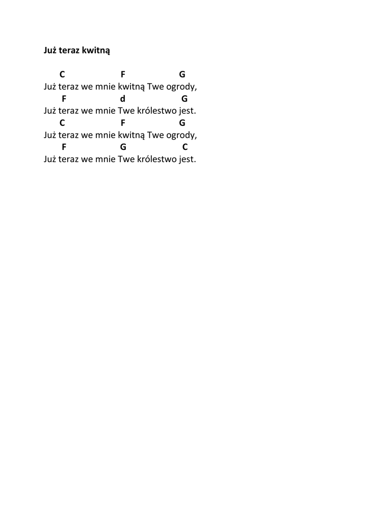 Już teraz kwitną C F G Już teraz we mnie kwitną Twe ogrody, F d G Już teraz we mnie Twe królestwo jest. C F G Już teraz we mnie kwitną Twe ogrody, F G C Już teraz we mnie Twe królestwo jest.