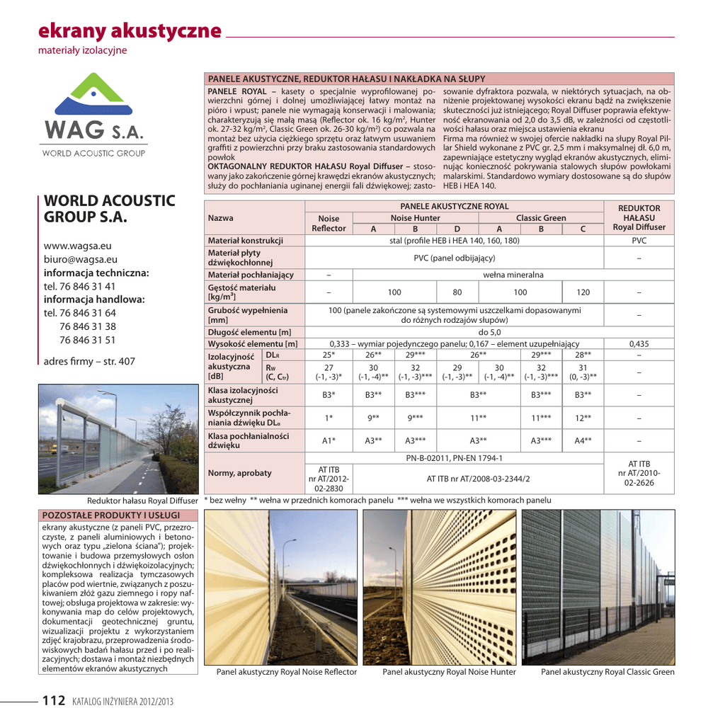 ekrany akustyczne materiały izolacyjne PANELE AKUSTYCZNE, REDUKTOR HAŁASU I NAKŁADKA NA SŁUPY PANELE ROYAL – kasety o specjalnie wyprofilowanej powierzchni górnej i dolnej umożliwiającej łatwy montaż na pióro i wpust; panele nie wymagają konserwacji i malowania; charakteryzują się małą masą (Reflector ok. 16 kg/m2, Hunter ok. 27-32 kg/m2, Classic Green ok. 26-30 kg/m2) co pozwala na montaż bez użycia ciężkiego sprzętu oraz łatwym usuwaniem graffiti z powierzchni przy braku zastosowania standardowych powłok OKTAGONALNY REDUKTOR HAŁASU Royal Diffuser – stosowany jako zakończenie górnej krawędzi ekranów akustycznych; służy do pochłaniania uginanej energii fali dźwiękowej; zasto- WORLD ACOUSTIC GROUP S.A. www.wagsa.eu [email protected] informacja techniczna: tel. 76 846 31 41 informacja handlowa: tel. 76 846 31 64 76 846 31 38 76 846 31 51 adres firmy – str. 407 Nazwa Materiał konstrukcji Materiał płyty dźwiękochłonnej Materiał pochłaniający Gęstość materiału [kg/m3] Grubość wypełnienia [mm] Długość elementu [m] Wysokość elementu [m] Izolacyjność DLR akustyczna RW [dB] (C, Ctr) Noise Reflector A sowanie dyfraktora pozwala, w niektórych sytuacjach, na obniżenie projektowanej wysokości ekranu bądź na zwiększenie skuteczności już istniejącego; Royal Diffuser poprawia efektywność ekranowania od 2,0 do 3,5 dB, w zależności od częstotliwości hałasu oraz miejsca ustawienia ekranu Firma ma również w swojej ofercie nakładki na słupy Royal Pillar Shield wykonane z PVC gr. 2,5 mm i maksymalnej dł. 6,0 m, zapewniające estetyczny wygląd ekranów akustycznych, eliminując konieczność pokrywania stalowych słupów powłokami malarskimi. Standardowo wymiary dostosowane są do słupów HEB i HEA 140. PANELE AKUSTYCZNE ROYAL Noise Hunter Classic Green B D A B stal (profile HEB i HEA 140, 160, 180) C PVC PVC (panel odbijający) – REDUKTOR HAŁASU Royal Diffuser – wełna mineralna – 100 80 100 120 100 (panele zakończone są systemowymi uszczelkami dopasowanymi do różnych rodzajów słupów) do 5,0 0,333 – wymiar pojedynczego panelu; 0,167 – element uzupełniający 25* 26** 29*** 26** 29*** 28** 27 30 32 29 30 32 31 (-1, -3)* (-1, -4)** (-1, -3)*** (-1, -3)** (-1, -4)** (-1, -3)*** (0, -3)** – – 0,435 – – Klasa izolacyjności akustycznej B3* B3** B3*** B3** B3*** B3** – Współczynnik pochłaniania dźwięku DLα 1* 9** 9*** 11** 11*** 12** – Klasa pochłanialności dźwięku A1* A3** A3*** A3** A3*** A4** – PN-B-02011, PN-EN 1794-1 AT ITB nr AT/2012AT ITB nr AT/2008-03-2344/2 02-2830 Reduktor hałasu Royal Diffuser * bez wełny ** wełna w przednich komorach panelu *** wełna we wszystkich komorach panelu Normy, aprobaty AT ITB nr AT/201002-2626 POZOSTAŁE PRODUKTY I USŁUGI ekrany akustyczne (z paneli PVC, przezroczyste, z paneli aluminiowych i betonowych oraz typu „zielona ściana”); projektowanie i budowa przemysłowych osłon dźwiękochłonnych i dźwiękoizolacyjnych; kompleksowa realizacja tymczasowych placów pod wiertnie, związanych z poszukiwaniem złóż gazu ziemnego i ropy naftowej; obsługa projektowa w zakresie: wykonywania map do celów projektowych, dokumentacji geotechnicznej gruntu, wizualizacji projektu z wykorzystaniem zdjęć krajobrazu, przeprowadzenia środowiskowych badań hałasu przed i po realizacyjnych; dostawa i montaż niezbędnych elementów ekranów akustycznych 112 KATALOG INŻYNIERA 2012/2013 Panel akustyczny Royal Noise Reflector Panel akustyczny Royal Noise Hunter Panel akustyczny Royal Classic Green