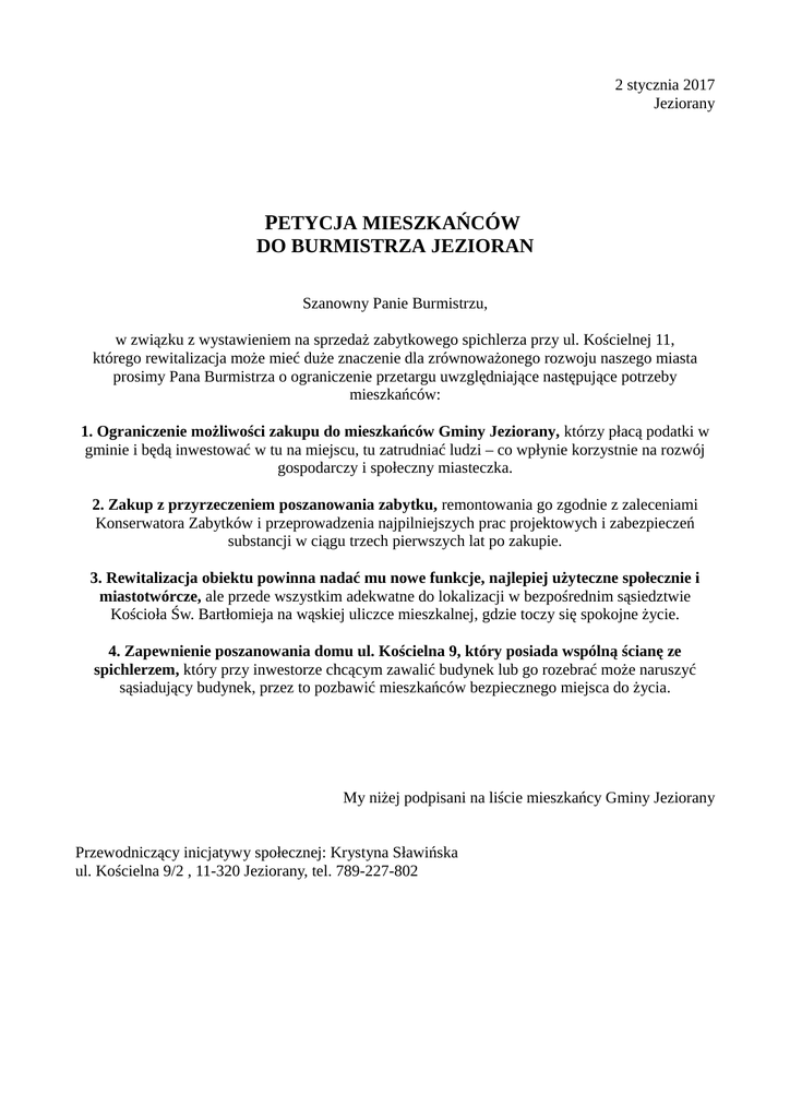 2 stycznia 2017 Jeziorany PETYCJA MIESZKAŃCÓW DO BURMISTRZA JEZIORAN Szanowny Panie Burmistrzu, w związku z wystawieniem na sprzedaż zabytkowego spichlerza przy ul. Kościelnej 11, którego rewitalizacja może mieć duże znaczenie dla zrównoważonego rozwoju naszego miasta prosimy Pana Burmistrza o ograniczenie przetargu uwzględniające następujące potrzeby mieszkańców: 1. Ograniczenie możliwości zakupu do mieszkańców Gminy Jeziorany, którzy płacą podatki w gminie i będą inwestować w tu na miejscu, tu zatrudniać ludzi – co wpłynie korzystnie na rozwój gospodarczy i społeczny miasteczka. 2. Zakup z przyrzeczeniem poszanowania zabytku, remontowania go zgodnie z zaleceniami Konserwatora Zabytków i przeprowadzenia najpilniejszych prac projektowych i zabezpieczeń substancji w ciągu trzech pierwszych lat po zakupie. 3. Rewitalizacja obiektu powinna nadać mu nowe funkcje, najlepiej użyteczne społecznie i miastotwórcze, ale przede wszystkim adekwatne do lokalizacji w bezpośrednim sąsiedztwie Kościoła Św. Bartłomieja na wąskiej uliczce mieszkalnej, gdzie toczy się spokojne życie. 4. Zapewnienie poszanowania domu ul. Kościelna 9, który posiada wspólną ścianę ze spichlerzem, który przy inwestorze chcącym zawalić budynek lub go rozebrać może naruszyć sąsiadujący budynek, przez to pozbawić mieszkańców bezpiecznego miejsca do życia. My niżej podpisani na liście mieszkańcy Gminy Jeziorany Przewodniczący inicjatywy społecznej: Krystyna Sławińska ul. Kościelna 9/2 , 11-320 Jeziorany, tel. 789-227-802 Lista mieszkańców Gminy Jeziorany popierająca petycję o ograniczenie przetargu na zbycie zabytkowego Spichlerza przy ul. Kościelnej w Jezioranach z postulatami zawartymi w piśmie przewodnim. Lp. 1 2 3 4 5 6 7 8 9 10 11 12 13 14 15 16 17 18 19 20 21 22 23 24 25 26 27 28 29 30 31 32 33 Imię i Nazwisko Adres PESEL Podpis 34 35 36 37 38 39 40 41 42 43 44 45 46 47 48 49 50 51 52 53 54 56 57 58 59 60 61 62 63 64 65 66 67 68 69 70 71 72 73 74 75 76 77 78 79 80 81 82 83 84 85 86 87 88 89 90 91 92 93 94 95 96 97 98 99 100 101 102 103 104 105 106 107 108 109 110 111 112 113 114 115 116 117 118 119 120 121 122 123 124 125 126 127 128 129 130 131 132 133 134 135 136 137 138 139 140 141 142 143 144 145
