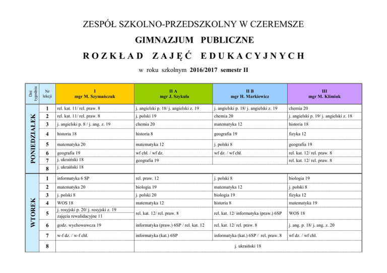 ZESPÓŁ SZKOLNO-PRZEDSZKOLNY W CZEREMSZE GIMNAZJUM PUBLICZNE ROZKŁAD ZAJĘĆ EDUKACYJNYCH WTOREK PONIEDZIAŁEK Dni tygodnia w roku szkolnym 2016/2017 semestr II Nr lekcji I mgr M. Szymańczuk II A mgr J. Szykuła II B mgr H. Markiewicz III mgr M. Klimiuk 1 2 3 rel. kat. 11/ rel. praw. 8 j. angielski p. 18/ j. angielski z. 19 j. angielski p. 18/ j. angielski z. 19 chemia 20 rel. kat. 11/ rel. praw. 8 j. polski 19 chemia 20 j. angielski p. 19/ j. angielski z. 18 j. angielski p. 8 / j. ang. z. 19 chemia 20 matematyka 12 historia 18 4 historia 18 historia 8 geografia 19 fizyka 12 5 matematyka 20 matematyka 12 j. polski 8 geografia 19 6 7 8 geografia 19 j. ukraiński 18 wf chł. / wf dz. wf dz. / wf chł. rel. kat. 12/ rel. praw. 8 1 informatyka 6 SP rel. praw. 12 j. polski 8 biologia 19 2 3 4 matematyka 20 biologia 19 matematyka 12 j. polski 8 j. polski 8 j. polski 20 biologia 19 fizyka 12 matematyka 12 historia 8 matematyka 19 5 WOS 18 j. rosyjski p. 20/ j. rosyjski z. 19 zajęcia rewalidacyjne 11 rel. kat. 12/ rel. praw. 8 rel. kat. 12/ informatyka (praw.) 6SP WOS 18 6 godz. wychowawcza 19 informatyka (praw.) 6SP / rel. kat. 12 rel. kat. 12/ rel. praw. 8 j. ang. p. 18/ j. ang. z. 20 7 w-f dz. / w-f chł. informatyka (kat.) 6SP informatyka (kat.) 6SP / rel. praw. 8 wf dz. / wf chł. 8 geografia 19 rel. kat. 12/ rel. praw. 8 j. ukraiński 18 j. ukraiński 18 ŚRODA CZWARTEK 1 2 3 4 5 6 7 8 9 chemia 20 j. ang. p. 12/ j. ang. z. 19 j. ang. p. 12/ j. ang. z. 19 j. polski 8 j. polski 8 chemia 20/ fizyka 12 (co 2 tydzień) chemia 20/ fizyka 12 (co 2 tydzień) j. rosyjski p. 18/ j. rosyjski z. 19 j. ang. p. 18/ j. ang. z. 19 matematyka 12 j. polski 8 chemia 20 muzyka 18 historia 8 matematyka 12 matematyka 19 matematyka 19 j. polski 20 zaj. artystyczne 18 j. polski 8 w-f dz. / w-f chł. zaj. artystyczne 18 historia 8 w-f dz. / w-f chł. j. ukraiński 19 w-f dz. / w-f chł. w-f dz. / w-f chł. plastyka 18 1 2 3 4 j. polski 8 w-f dz. / w-f chł. w-f dz. / w-f chł. WDŻ 18 j. ang. p. 18/ j. ang. z. 20 geografia 19 matematyka 12 j. polski 8 historia 18 j. ang. p. 8/ j. ang. z. 20 j. ang. p. 8/ j. ang. z. 20 matematyka 19 w-f dz. / w-f chł. j. rosyjski p. 20/ j. rosyjski z. 8 zajęcia rewalidacyjne 11 matematyka 12 geografia 19 w-f dz. / w-f chł. zaj. techniczne 18 godz. wychowawcza 12 geografia 19 zaj. techniczne 18 j. polski 20 biologia 19 j. ang. p. 12/ j. ang. z. 8 5 6 7 zajęcia rewalidacyjne 12 / j. ukraiński 18 j. ukraiński 18 j. ukraiński 18 godz. wychowawcza 20 PIĄTEK 8 1 2 3 4 biologia 19 godz. wychowawcza 18 fizyka 12 j. polski 8 fizyka 12 biologia 19 j. polski 8 edukacja dla bezpieczeństwa 18 wf dz. / wf chł. fizyka 12 zaj. techniczne 18 w-f dz. /wf chł. matematyka 19 j. polski 20 j. polski 8 historia 18 5 j. polski 8 j. rosyjski p. 20/ j. rosyjski z. 18 j. rosyjski p. 20/ j. rosyjski z. 18 6 7 8 zaj. artystyczne 19 wf dz. / wf chł. zaj. korekc.-komp. 12 WDŻ 18 zajęcia rewalidacyjne 12 wf dz. / wf chł. matematyka 19 j. rosyjski p. 12/ j. rosyjski z. 18 zaj. korekcyjno – kompensacyjne 12