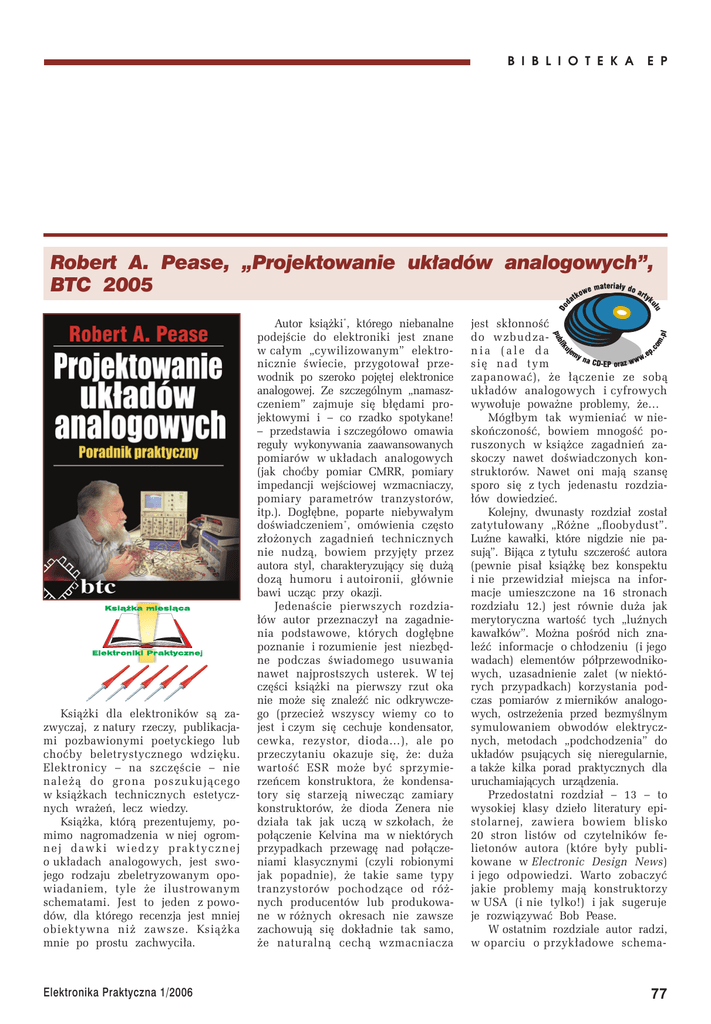B I B L I O T E K A E P Robert A. Pease, „Projektowanie układów analogowych”, BTC 2005 Książki dla elektroników są zazwyczaj, z natury rzeczy, publikacjami pozbawionymi poetyckiego lub choćby beletrystycznego wdzięku. Elektronicy – na szczęście – nie należą do grona poszukującego w książkach technicznych estetycznych wrażeń, lecz wiedzy. Książka, którą prezentujemy, pomimo nagromadzenia w niej ogromnej dawki wiedzy praktycznej o układach analogowych, jest swojego rodzaju zbeletryzowanym opowiadaniem, tyle że ilustrowanym schematami. Jest to jeden z powodów, dla którego recenzja jest mniej obiektywna niż zawsze. Książka mnie po prostu zachwyciła. Elektronika Praktyczna 1/2006 Autor książki*, którego niebanalne podejście do elektroniki jest znane w całym „cywilizowanym” elektronicznie świecie, przygotował przewodnik po szeroko pojętej elektronice analogowej. Ze szczególnym „namaszczeniem” zajmuje się błędami projektowymi i – co rzadko spotykane! – przedstawia i szczegółowo omawia reguły wykonywania zaawansowanych pomiarów w układach analogowych (jak choćby pomiar CMRR, pomiary impedancji wejściowej wzmacniaczy, pomiary parametrów tranzystorów, itp.). Dogłębne, poparte niebywałym doświadczeniem*, omówienia często złożonych zagadnień technicznych nie nudzą, bowiem przyjęty przez autora styl, charakteryzujący się dużą dozą humoru i autoironii, głównie bawi ucząc przy okazji. Jedenaście pierwszych rozdziałów autor przeznaczył na zagadnienia podstawowe, których dogłębne poznanie i rozumienie jest niezbędne podczas świadomego usuwania nawet najprostszych usterek. W tej części książki na pierwszy rzut oka nie może się znaleźć nic odkrywczego (przecież wszyscy wiemy co to jest i czym się cechuje kondensator, cewka, rezystor, dioda…), ale po przeczytaniu okazuje się, że: duża wartość ESR może być sprzymierzeńcem konstruktora, że kondensatory się starzeją niwecząc zamiary konstruktorów, że dioda Zenera nie działa tak jak uczą w szkołach, że połączenie Kelvina ma w niektórych przypadkach przewagę nad połączeniami klasycznymi (czyli robionymi jak popadnie), że takie same typy tranzystorów pochodzące od różnych producentów lub produkowane w różnych okresach nie zawsze zachowują się dokładnie tak samo, że naturalną cechą wzmacniacza jest skłonność do wzbudzania (ale da się nad tym zapanować), że łączenie ze sobą układów analogowych i cyfrowych wywołuje poważne problemy, że… Mógłbym tak wymieniać w nieskończoność, bowiem mnogość poruszonych w książce zagadnień zaskoczy nawet doświadczonych konstruktorów. Nawet oni mają szansę sporo się z tych jedenastu rozdziałów dowiedzieć. Kolejny, dwunasty rozdział został zatytułowany „Różne „floobydust”. Luźne kawałki, które nigdzie nie pasują”. Bijąca z tytułu szczerość autora (pewnie pisał książkę bez konspektu i nie przewidział miejsca na informacje umieszczone na 16 stronach rozdziału 12.) jest równie duża jak merytoryczna wartość tych „luźnych kawałków”. Można pośród nich znaleźć informacje o chłodzeniu (i jego wadach) elementów półprzewodnikowych, uzasadnienie zalet (w niektórych przypadkach) korzystania podczas pomiarów z mierników analogowych, ostrzeżenia przed bezmyślnym symulowaniem obwodów elektrycznych, metodach „podchodzenia” do układów psujących się nieregularnie, a także kilka porad praktycznych dla uruchamiających urządzenia. Przedostatni rozdział – 13 – to wysokiej klasy dzieło literatury epistolarnej, zawiera bowiem blisko 20 stron listów od czytelników felietonów autora (które były publikowane w Electronic Design News) i jego odpowiedzi. Warto zobaczyć jakie problemy mają konstruktorzy w USA (i nie tylko!) i jak sugeruje je rozwiązywać Bob Pease. W ostatnim rozdziale autor radzi, w oparciu o przykładowe schema- 77 B I B L I O T E K A E P ty niezbyt rozbudowanych układów elektronicznych, jak je uruchamiać, znajdować w nich usterki i jak optymalizować proces ich uruchamiania. Wiele rysunków i tablic zawierających zestawienia usterek i możliwych rozwiązań dodatkowo „upraktyczniają” treść tego rozdziału. Ostatnią częścią książki są dodatki (jest ich 8), z których szczególnie polecam (przeczytać warto jednakże wszystkie) oznaczony literą „F” – „Jak 78 wydobyć właściwą informację z karty katalogowej”, czyli lekcja uodparniania się na zabiegi Działów Marketingu. Dość zachwytów, czas na ocenę – oczywiście pięć lutownic! Drugie pięć lutownic przyznaję tłumaczowi, którego lekkość pióra idzie w parze z umiejętnością przenoszenia do polskiego wydania książki nie tylko tekstu, ale także klimatu książki. Słowa uznania! Piotr Zbysiński * )Robert Pease jest (od 1976 roku) pracownikiem firmy National Semiconductor, w której zajmuje się m.in. projektowaniem układów analogowych. Ma na koncie m.in. układy LM331 i LM334, tworzył i współtworzył wiele typów wzmacniaczy operacyjnych, długi czas współpracował z Robertem Widlarem (uznanym za twórcę półprzewodnikowej wersji wzmacniacza operacyjnego). Fragmenty książki publikujemy na CD-EP1/2006B Elektronika Praktyczna 1/2006