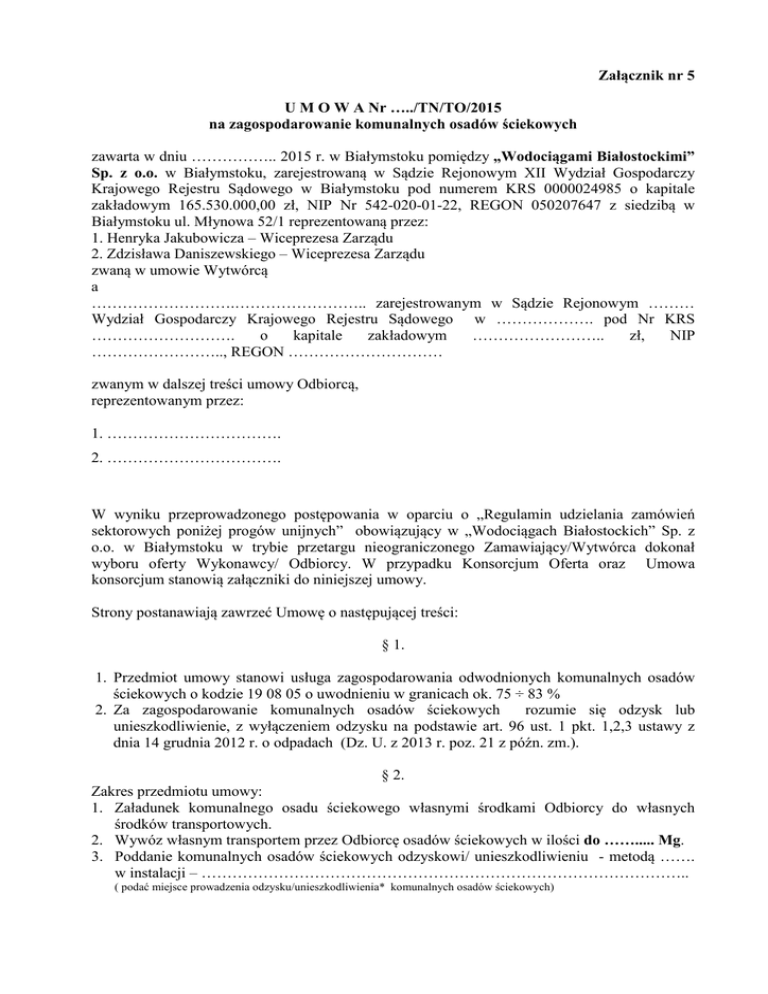 Załącznik nr 5 U M O W A Nr …../TN/TO/2015 na zagospodarowanie komunalnych osadów ściekowych zawarta w dniu …………….. 2015 r. w Białymstoku pomiędzy „Wodociągami Białostockimi” Sp. z o.o. w Białymstoku, zarejestrowaną w Sądzie Rejonowym XII Wydział Gospodarczy Krajowego Rejestru Sądowego w Białymstoku pod numerem KRS 0000024985 o kapitale zakładowym 165.530.000,00 zł, NIP Nr 542-020-01-22, REGON 050207647 z siedzibą w Białymstoku ul. Młynowa 52/1 reprezentowaną przez: 1. Henryka Jakubowicza – Wiceprezesa Zarządu 2. Zdzisława Daniszewskiego – Wiceprezesa Zarządu zwaną w umowie Wytwórcą a ……………………….…………………….. zarejestrowanym w Sądzie Rejonowym ……… Wydział Gospodarczy Krajowego Rejestru Sądowego w ………………. pod Nr KRS ………………………. o kapitale zakładowym …………………….. zł, NIP …………………….., REGON ………………………… zwanym w dalszej treści umowy Odbiorcą, reprezentowanym przez: 1. ……………………………. 2. ……………………………. W wyniku przeprowadzonego postępowania w oparciu o „Regulamin udzielania zamówień sektorowych poniżej progów unijnych” obowiązujący w „Wodociągach Białostockich” Sp. z o.o. w Białymstoku w trybie przetargu nieograniczonego Zamawiający/Wytwórca dokonał wyboru oferty Wykonawcy/ Odbiorcy. W przypadku Konsorcjum Oferta oraz Umowa konsorcjum stanowią załączniki do niniejszej umowy. Strony postanawiają zawrzeć Umowę o następującej treści: § 1. 1. Przedmiot umowy stanowi usługa zagospodarowania odwodnionych komunalnych osadów ściekowych o kodzie 19 08 05 o uwodnieniu w granicach ok. 75 ÷ 83 % 2. Za zagospodarowanie komunalnych osadów ściekowych rozumie się odzysk lub unieszkodliwienie, z wyłączeniem odzysku na podstawie art. 96 ust. 1 pkt. 1,2,3 ustawy z dnia 14 grudnia 2012 r. o odpadach (Dz. U. z 2013 r. poz. 21 z późn. zm.). § 2. Zakres przedmiotu umowy: 1. Załadunek komunalnego osadu ściekowego własnymi środkami Odbiorcy do własnych środków transportowych. 2. Wywóz własnym transportem przez Odbiorcę osadów ściekowych w ilości do ……..... Mg. 3. Poddanie komunalnych osadów ściekowych odzyskowi/ unieszkodliwieniu - metodą ……. w instalacji – ………………………………………………………………………………….. ( podać miejsce prowadzenia odzysku/unieszkodliwienia* komunalnych osadów ściekowych) 2 4. Odbiorca posiada prawomocne zezwolenie na prowadzenie działalności w zakresie odzysku/unieszkodliwiania* komunalnych osadów ściekowych 19 08 05 na mocy Ustawy z dnia 14 grudnia 2012 r. o odpadach (Dz. U. z 2013 r. poz. 21 z późn. zm.) – dokumenty stanowią załącznik nr 2 do umowy. Odbiorca posiada prawomocne zezwolenie na prowadzenie działalności w zakresie transportu komunalnych osadów ściekowych 19 08 05 na mocy Ustawy z dnia 14 grudnia 2012 r. o odpadach (Dz. U. z 2013 r. poz. 21 z późn. zm.) – dokumenty stanowią załącznik nr 1 do umowy. 5. Odbiorca dostarczy komunalne osady ściekowe będące przedmiotem niniejszej umowy na miejsce ich odzysku, o którym mowa w pkt 3 do instalacji firmy ……………………………………………………………………………………………...….. 6. Odbiorca oświadcza i zapewnia, że dysponuje odpowiednim potencjałem do wykonania przedmiotu umowy i ponosi pełną odpowiedzialność za prawidłowe i zgodne z przepisami prawnymi prowadzenie procesu zagospodarowania komunalnych osadów ściekowych. 7. Odbiorca jest następnym posiadaczem odpadów po Wytwórcy zgodnie z przepisami ustawy z dnia 14 grudnia 2012r. o odpadach. § 3. 1. Odbiorca zagospodaruje komunalne osady ściekowe wyłącznie w celu określonym w decyzji o której mowa w § 2 pkt 6 niniejszej umowy. Komunalne osady ściekowe będące przedmiotem umowy nie mogą być stosowane do odzysku w trybie art. 96 ust. 1 pkt. 1,2,3 Ustawy z dnia 14 grudnia 2012 r. o odpadach ( Dz. U. z 2013 r. poz. 21 z późn. zm. ) tj.: 1. w rolnictwie, rozumianym jako uprawa wszystkich płodów rolnych wprowadzanych do obrotu handlowego, włączając w to uprawy przeznaczane do produkcji pasz, 2. do uprawy roślin przeznaczonych do produkcji kompostu, 3. do uprawy roślin nieprzeznaczonych do spożycia i do produkcji pasz. 2. Strony zobowiązują się do prowadzenia ewidencji odpadu, będącego przedmiotem niniejszej umowy zgodnie z wymogami Rozporządzenia Ministra Środowiska z dnia 12 grudnia 2014 r. w sprawie wzorów dokumentów stosowanych na potrzeby ewidencji odpadów ( Dz. U. z 2014 r. poz. 1973). 3. Strony będą potwierdzały kartę przekazania odpadu przy każdorazowym opuszczeniu terenu oczyszczalni ścieków przez środek transportowy załadowany k.o.ś. § 4. 1. Miejscem wydania i przekazania komunalnych osadów ściekowych Odbiorcy jest Oczyszczalnia ścieków w Białymstoku, ul. Produkcyjna 102. 2. Odbiorca zapewnia załadunek i transport zgodnie z obowiązującymi przepisami i na swój koszt oraz ponosi z tego tytułu odpowiedzialność. 3. Strony ustalają warunki techniczne odbioru komunalnych osadów ściekowych, stanowiące załącznik Nr 3 do niniejszej umowy. 4. Wytwórca posiada Zintegrowany System Zarządzania wdrożony w oparciu o normy: PN-EN ISO 9001:2009, PN-EN ISO 14001:2005, PN - N 18001:2004. Strony umowy zobowiązują się do stosowania wymagań wymienionych norm w zakresie wzajemnej współpracy wynikającej z niniejszej umowy. § 5. Obowiązki stron: 1. Wytwórca zobowiązuję się do: 1.1.zważenia pustych i wypełnionych komunalnym osadem ściekowym samochodów wywożących osady ściekowe z oczyszczalni ścieków w celu ewidencji wywożonych odpadów , * - niepotrzebne skreślić 3 1.2.wystawiania kart przekazania odpadu. 2. Wytwórca oświadcza, że waga jest legalizowana zgodnie z wymaganymi przepisami. 3. Wytwórca wyznacza p. Grzegorza Simsona tel. 85